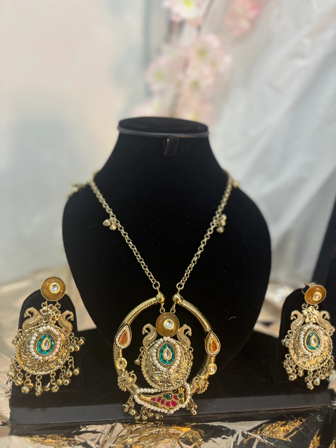 Beautiful necklace and earring set! The set features a detailed design with gold-tone metal and colourful accents. Perfect for adding a touch of elegance to any outfit