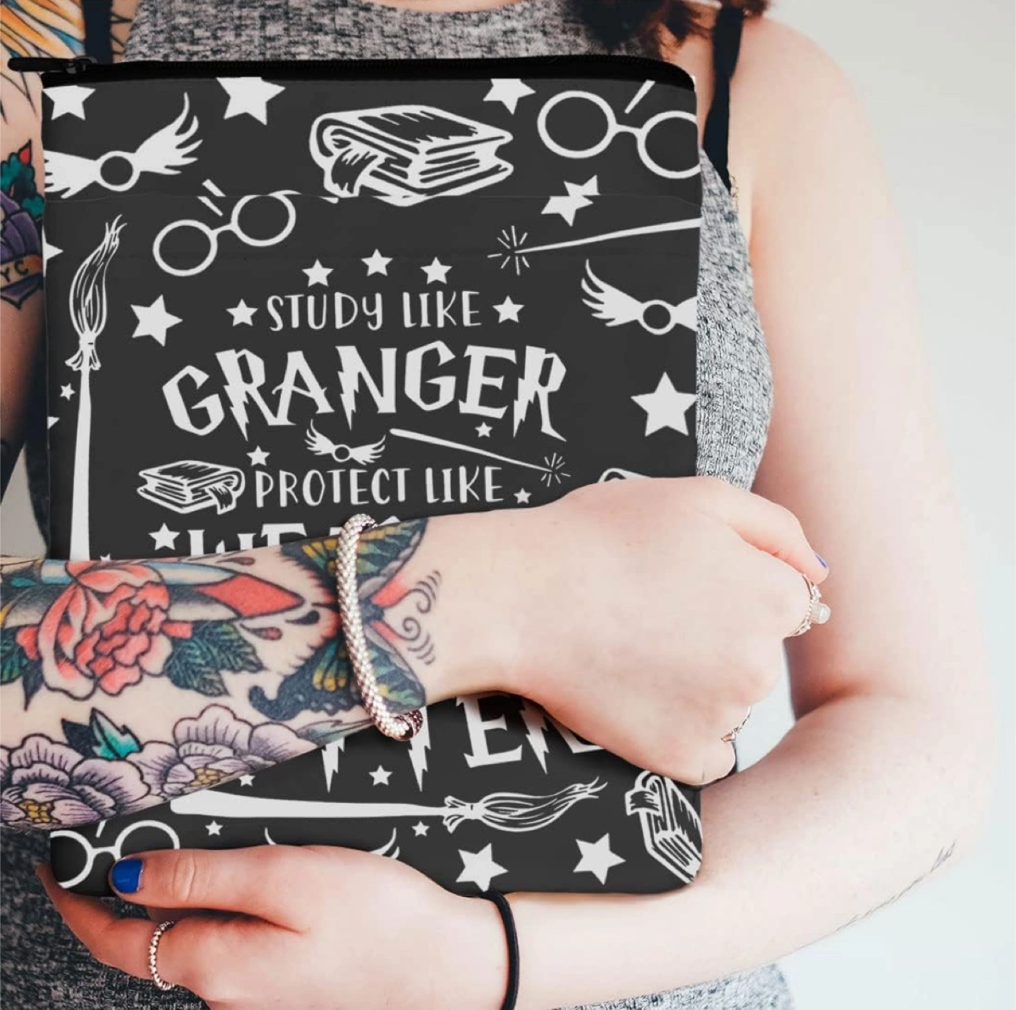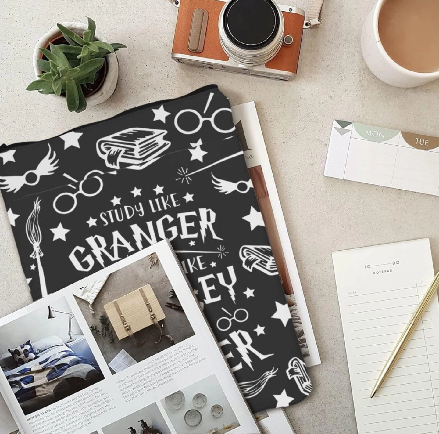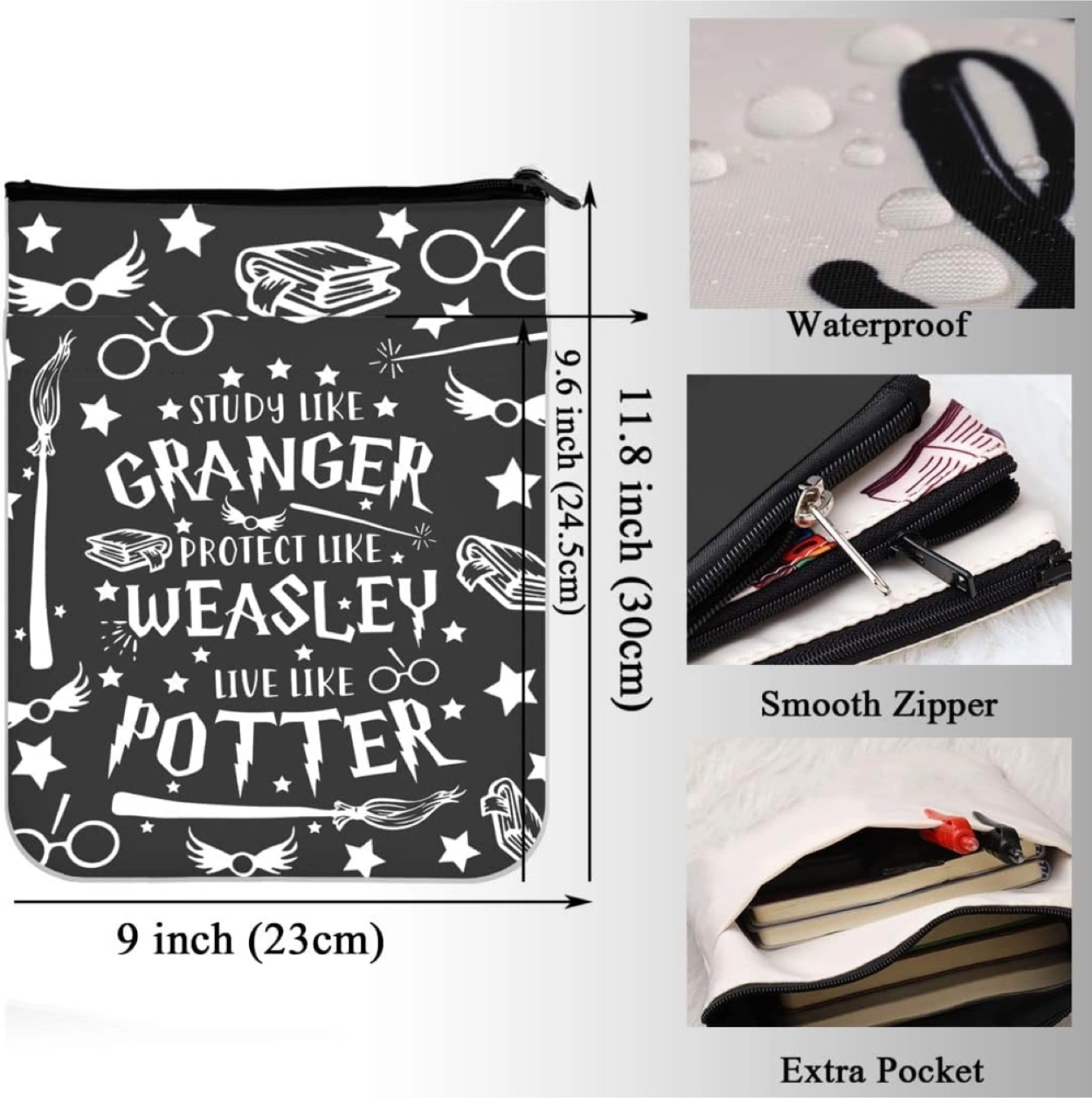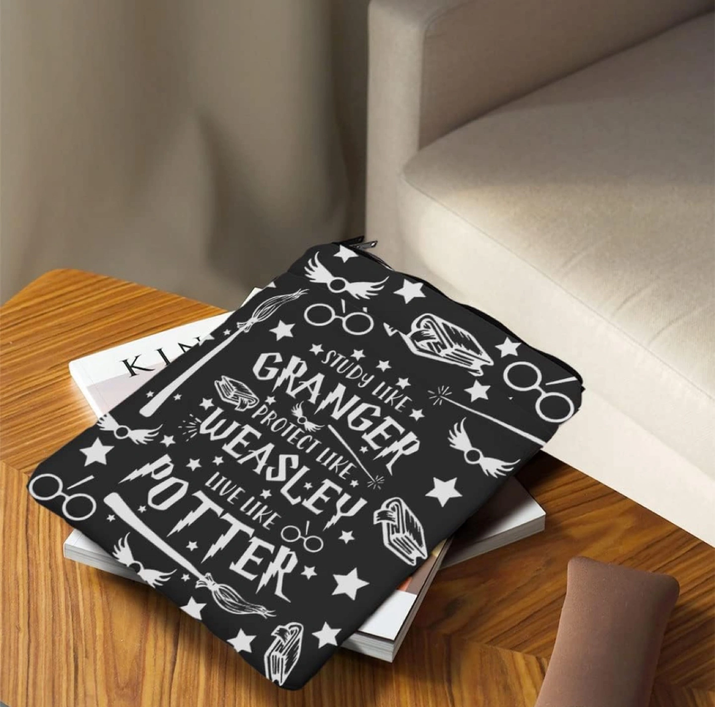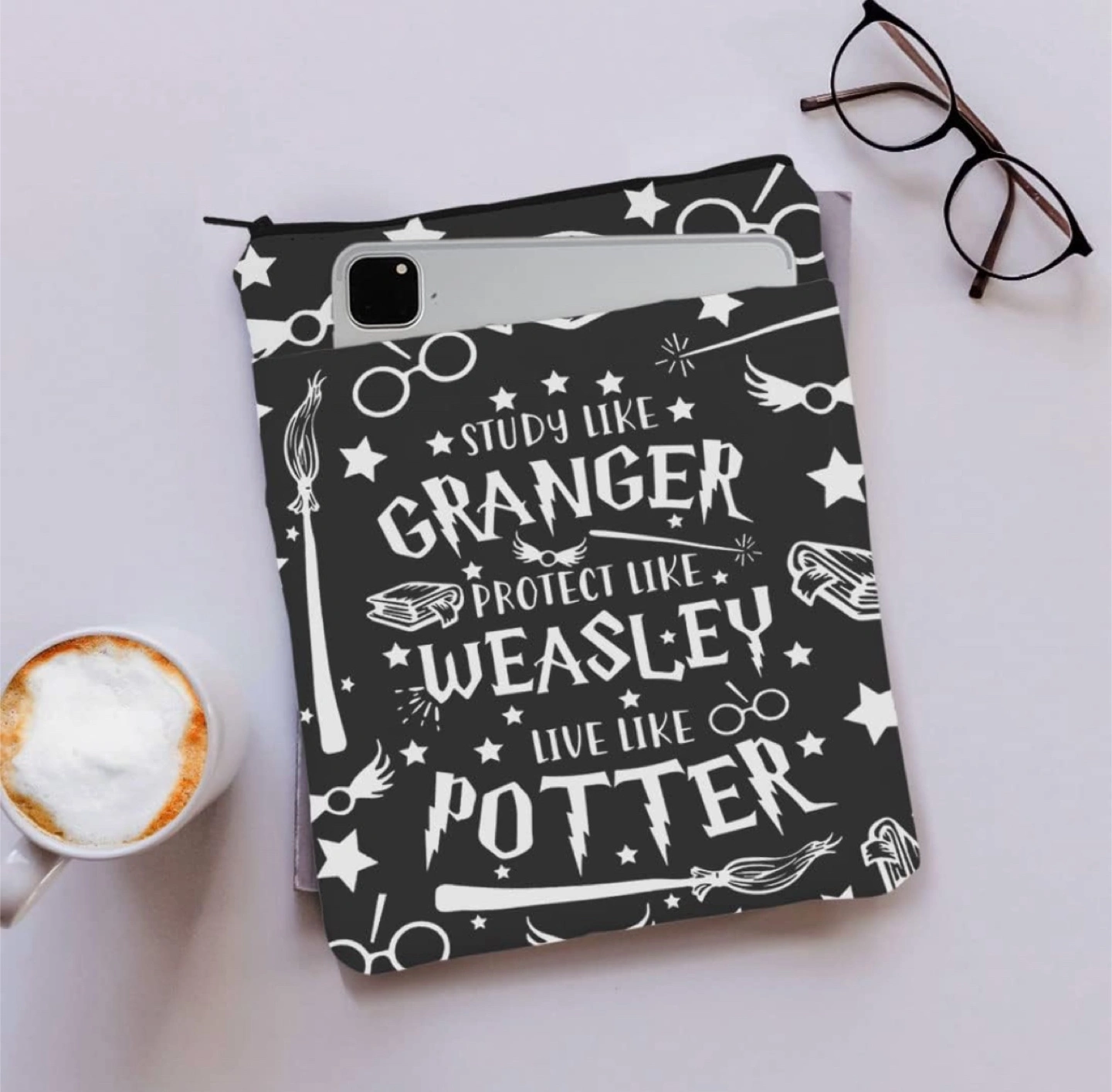 This Harry Potter themed tablet case/ book cover or pouch is perfect for any fan! It's black with white designs featuring iconic symbols and phrases. - Waterproof material - Smooth zipper - Extra pocket - Dimensions: 11.8 x 9 inches