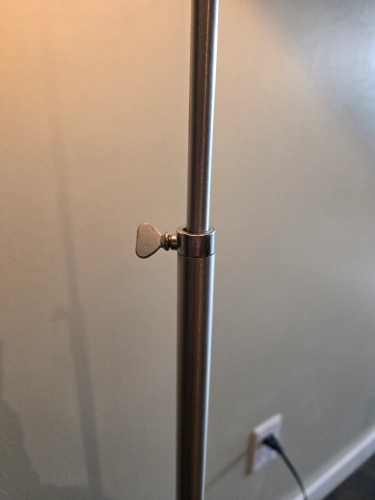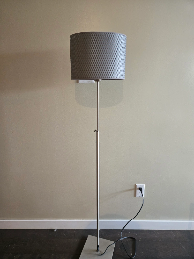 Selling a floor lamp with an adjustable height. It features a woven-style lamp shade and a sleek, silver-tone metal stand. It's in great condition and would look great in any living room or bedroom