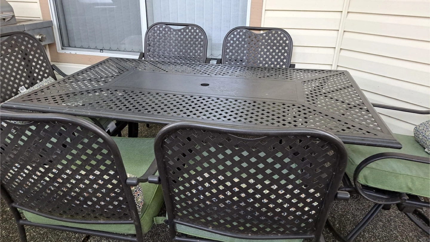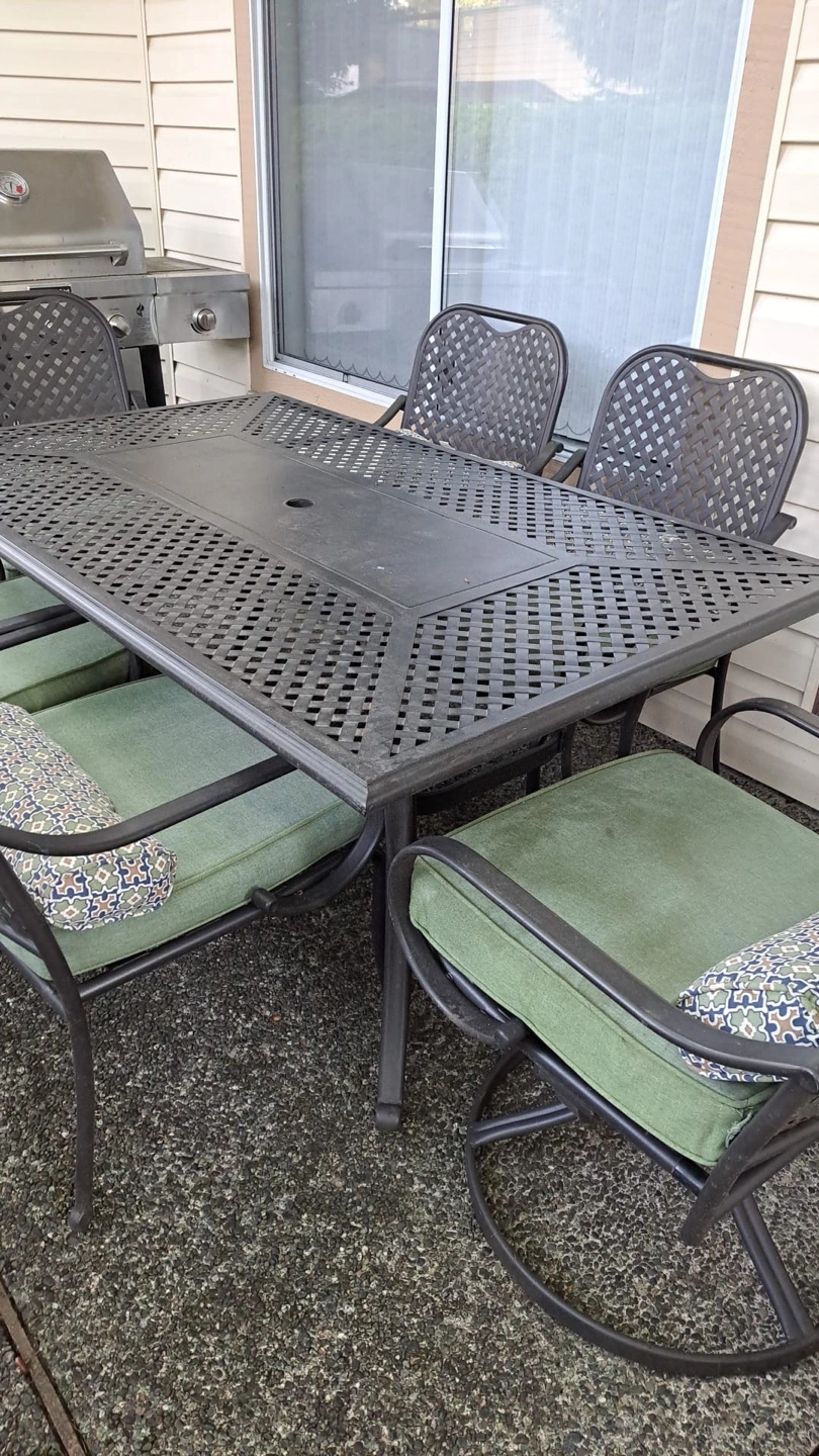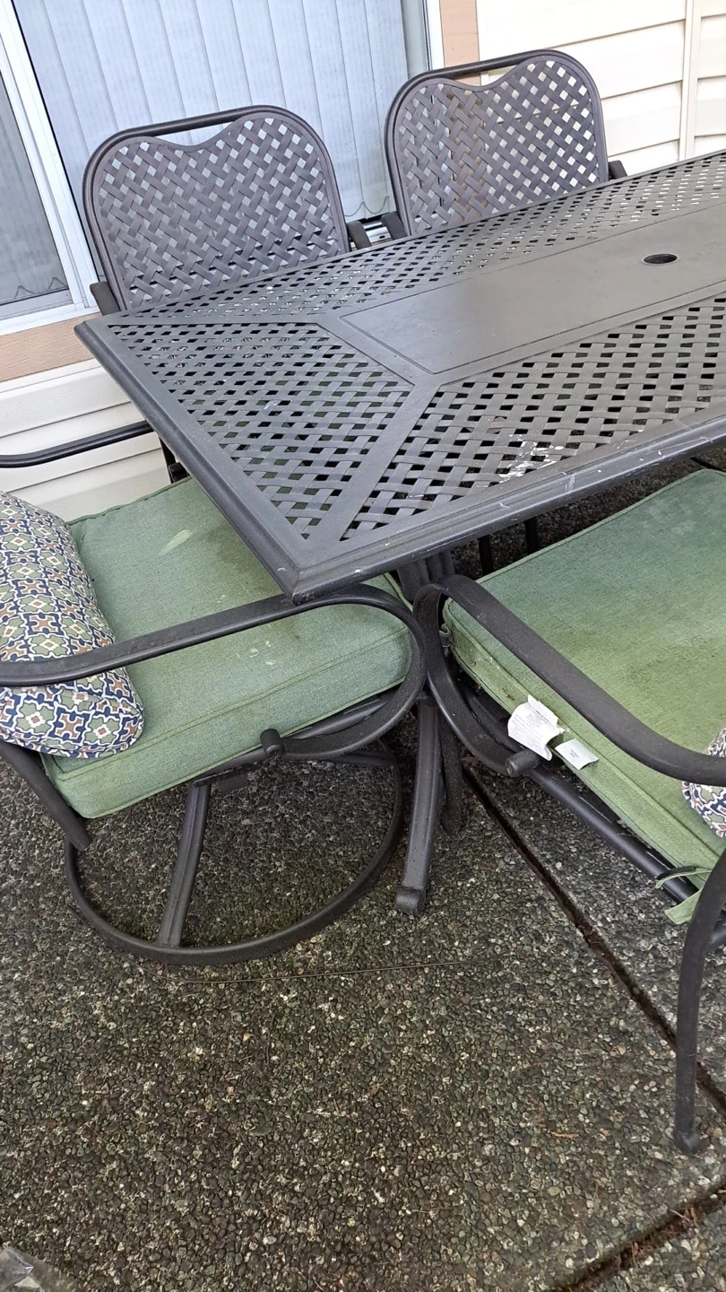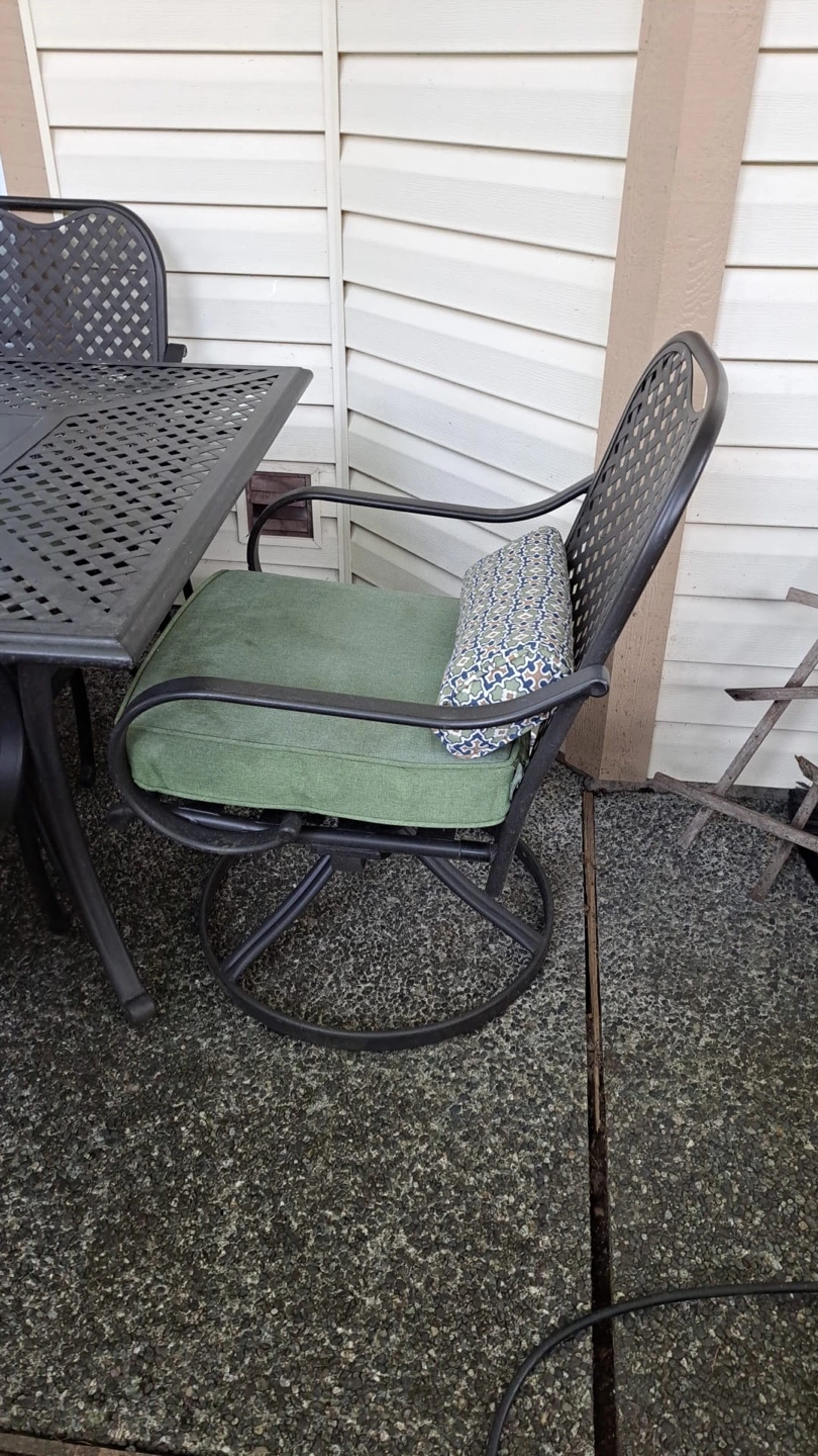 Selling a patio table with 2 swivel chairs. The set features a metal frame and a woven design. The chairs have green cushions and patterned lumbar pillows for added comfort. Perfect for enjoying summer evenings on the deck!