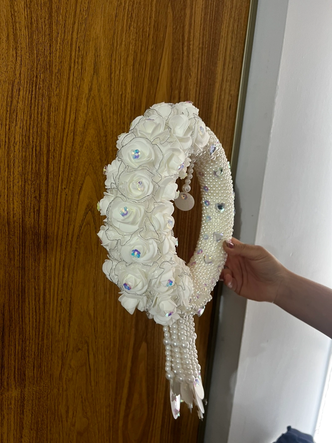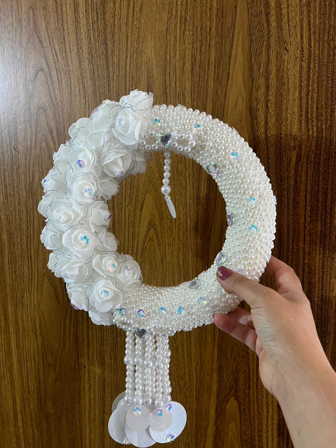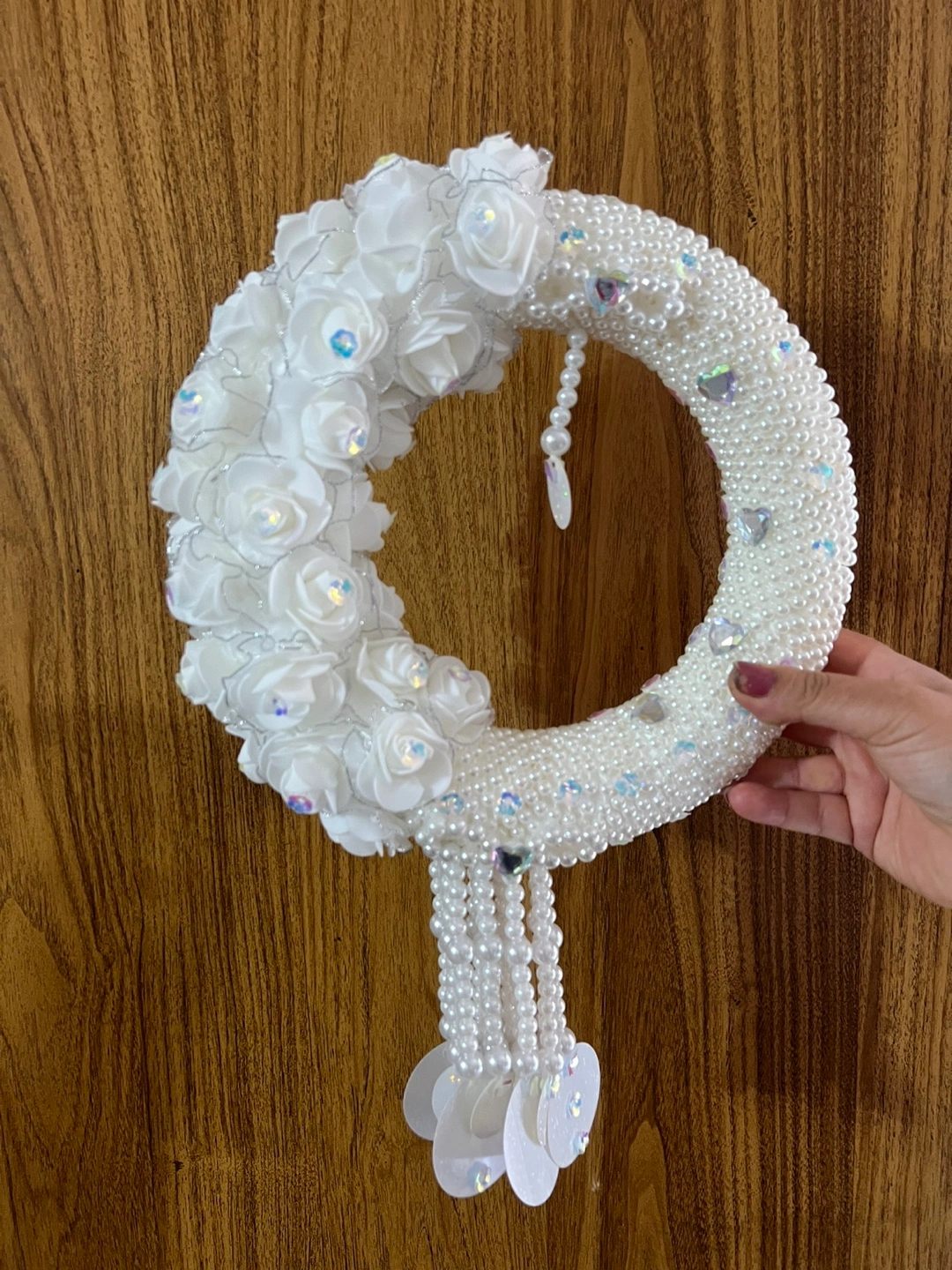 This is a beautiful, handcrafted wreath featuring white roses and pearl accents. It would be perfect for a wedding, shower, or any special occasion. It's in great condition and ready to add a touch of elegance to your home or event