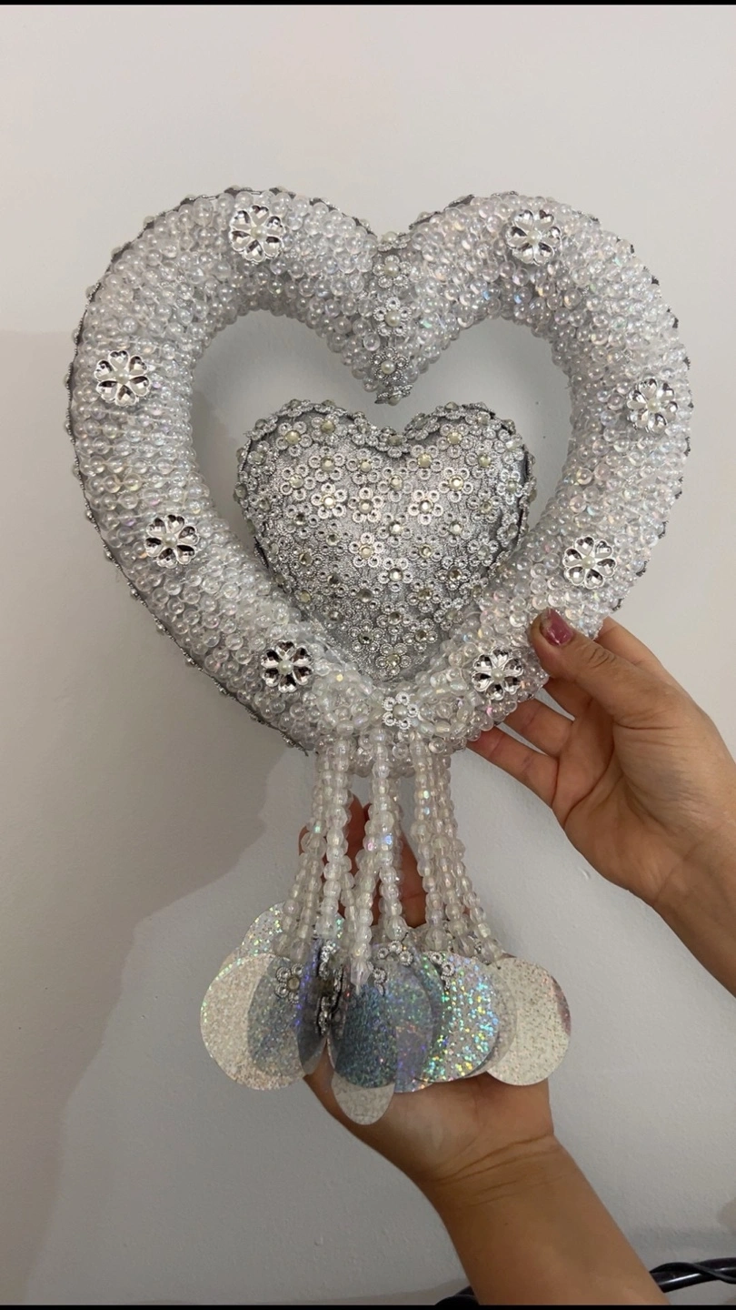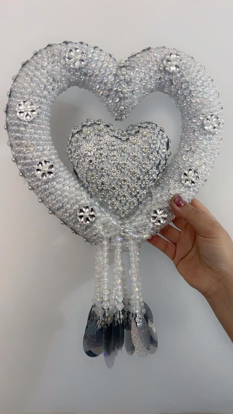 This is a beautiful, heart-shaped decoration, perfect for adding a touch of sparkle to any room. It features intricate beadwork and shimmering accents. Great for weddings, parties, or home decor!