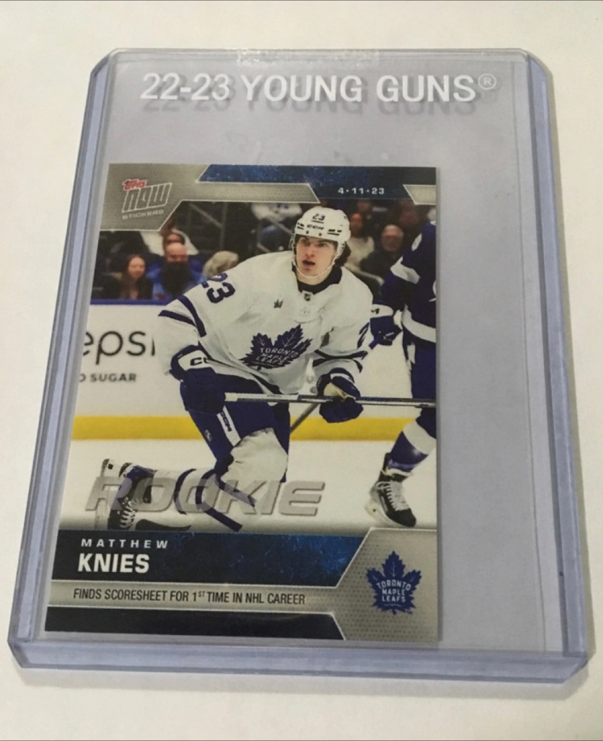 Selling a Topps Now Matthew Knies rookie card from the 2022-23 season! It commemorates his first time on the NHL scoresheet. A great addition for any hockey card collector!