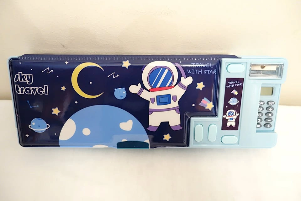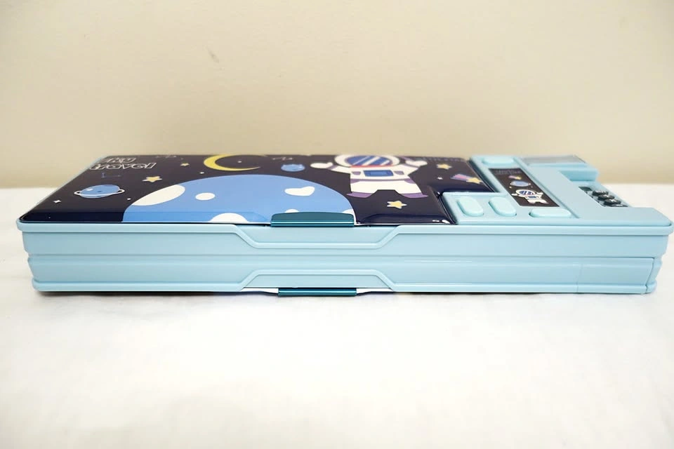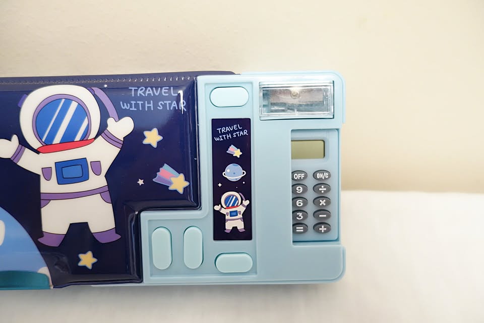 Then comes the fun part. There are four individual buttons that activate the spring-loaded features of the case. The four features include: 1) pencil sharpener, 2) retractable calculator, 3) eraser compartment, and 4) pen/pencil tray/rack. The pen/pencil tray/rack is located in the top compartment of the case. By pressing the respective button, the tray pops out the left side of the case, giving you instant access to your most utilized writing instruments. The best part is that the buttons are unmarked, so you get to experience the joy of discovering which buttons activate which features.