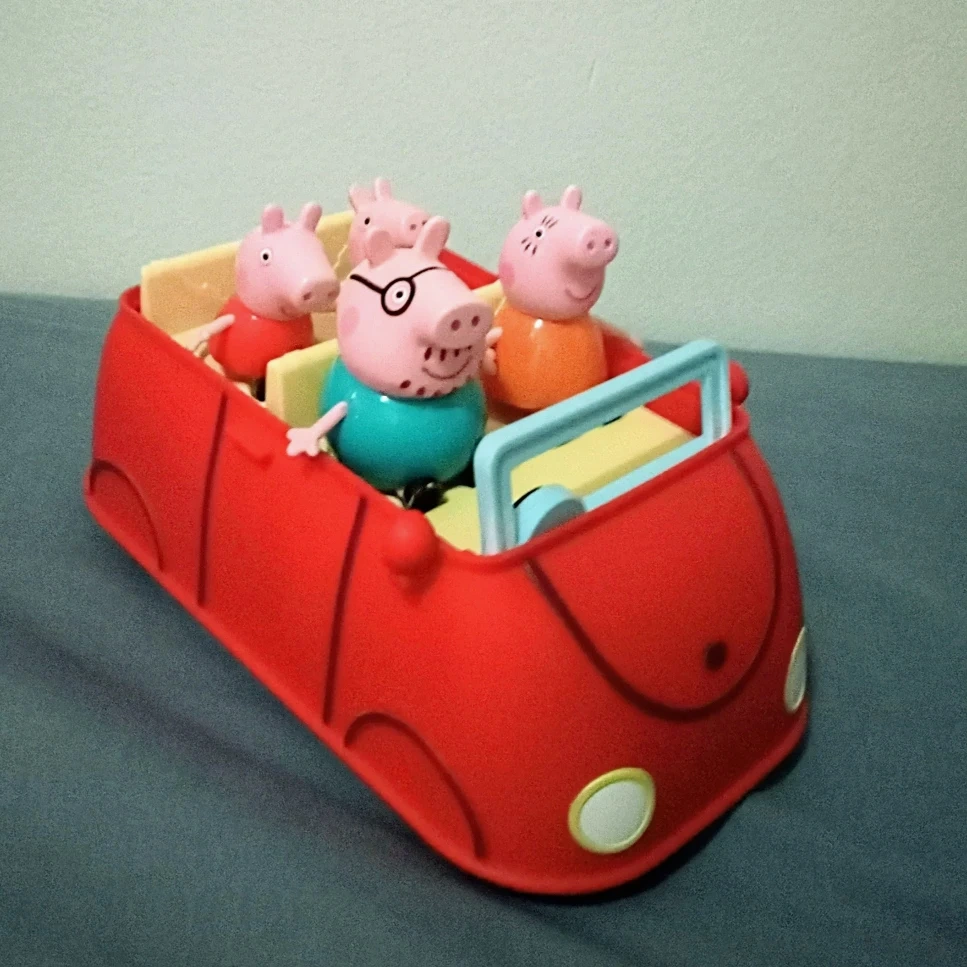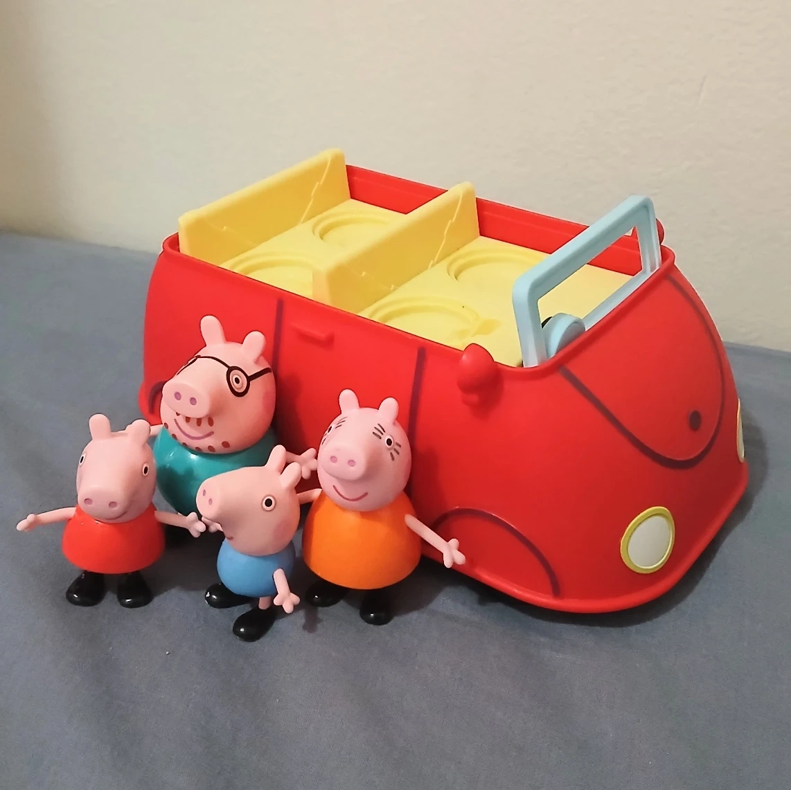 Selling a Peppa Pig family car toy with Peppa, George, Mummy Pig, and Daddy Pig figures! The car is red with yellow seats and a light blue steering wheel. Great for Peppa Pig fans!