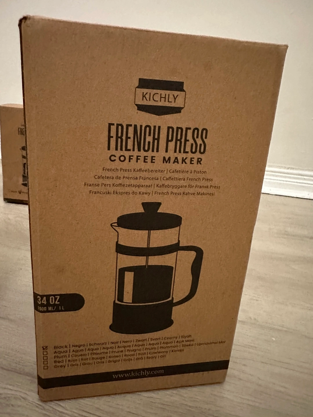 168Selling a Kichly French Press Coffee Maker! It's a 34oz (1000ml/1L) coffee maker. The box includes translations for French Press in multiple languages, including French, Spanish, and more!