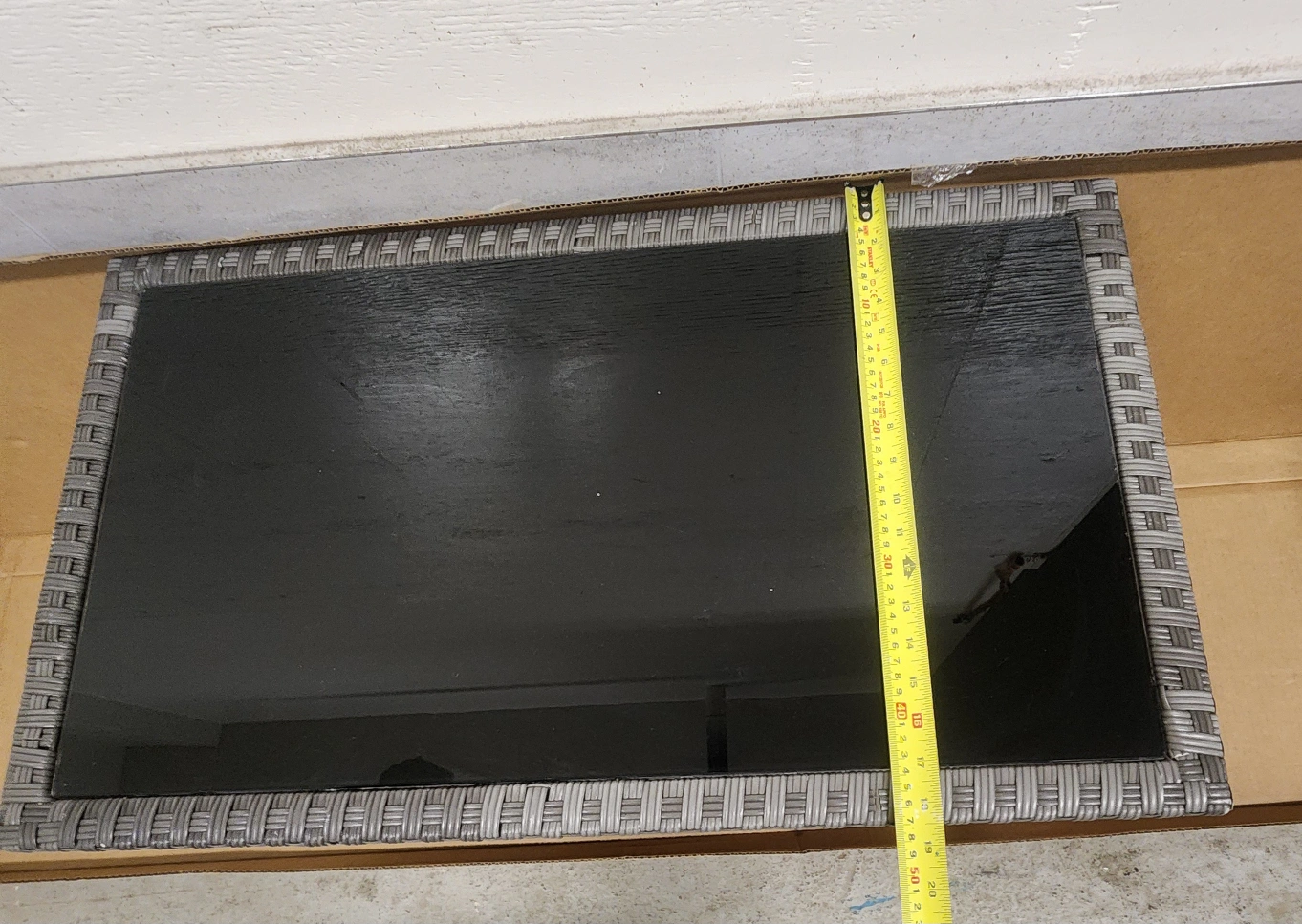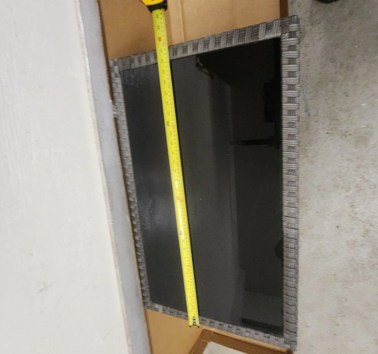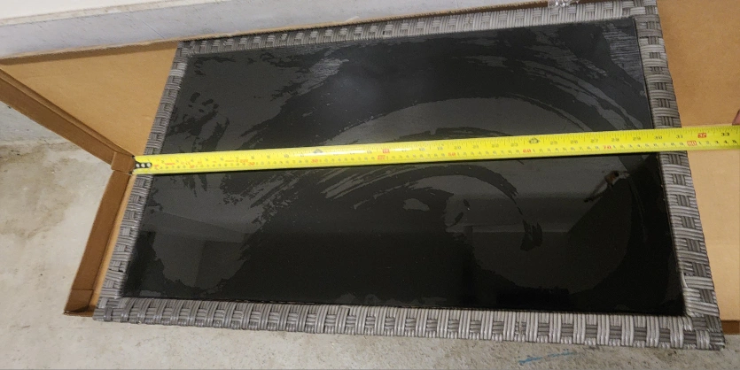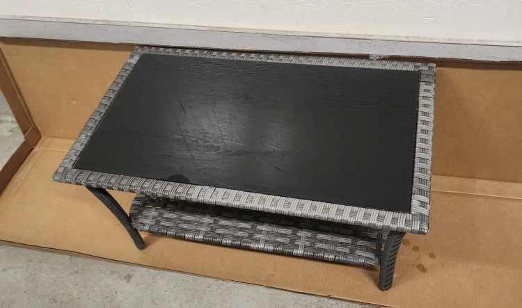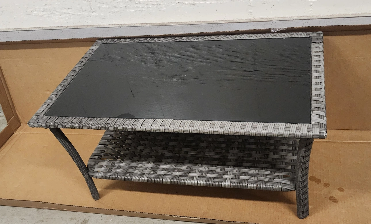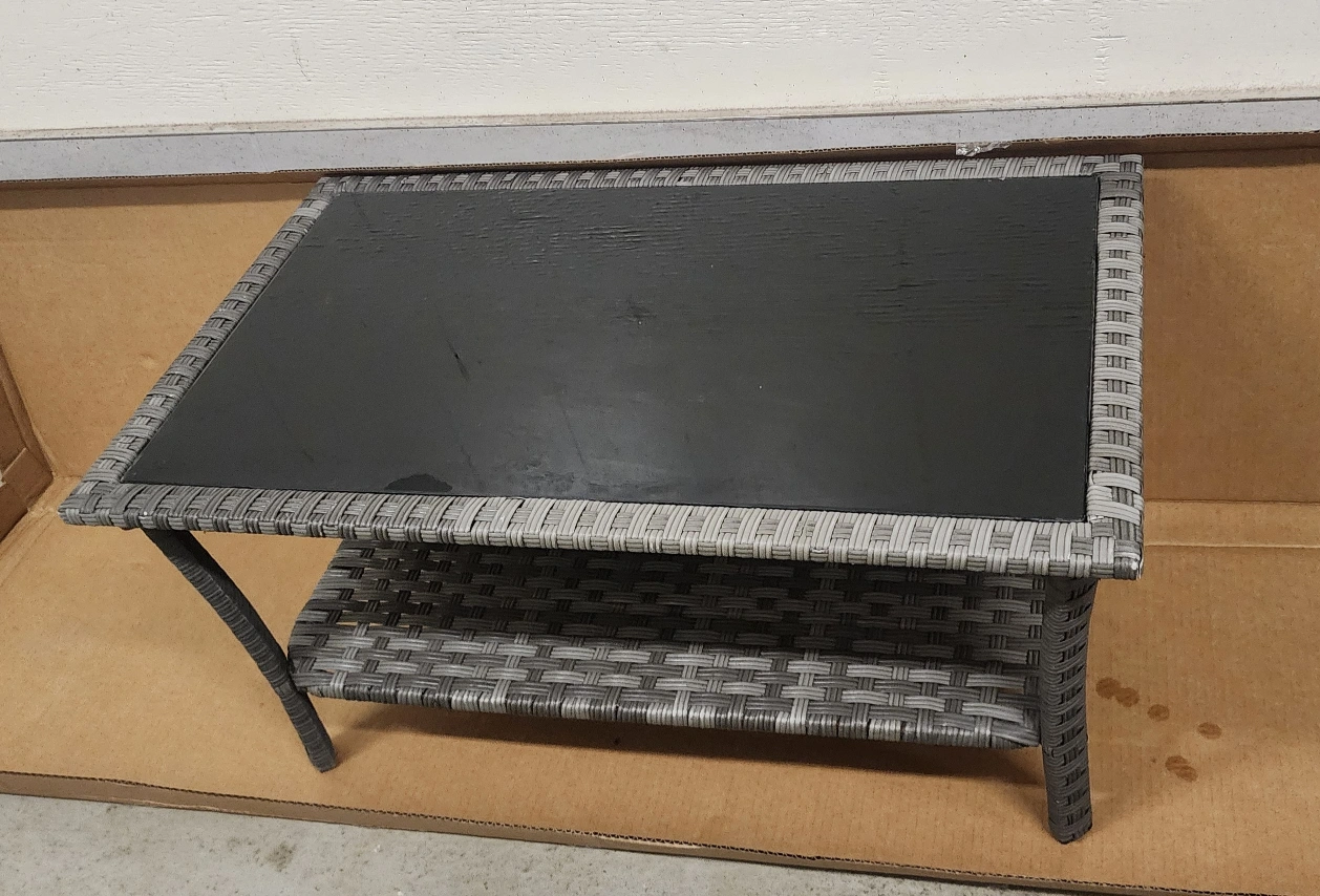 Selling a wicker-style coffee table, perfect for your living room or patio! It features a sleek black glass top and a lower shelf for extra storage. The table measures approximately 39 inches in length and 20 inches in width. A stylish and functional addition to any space!