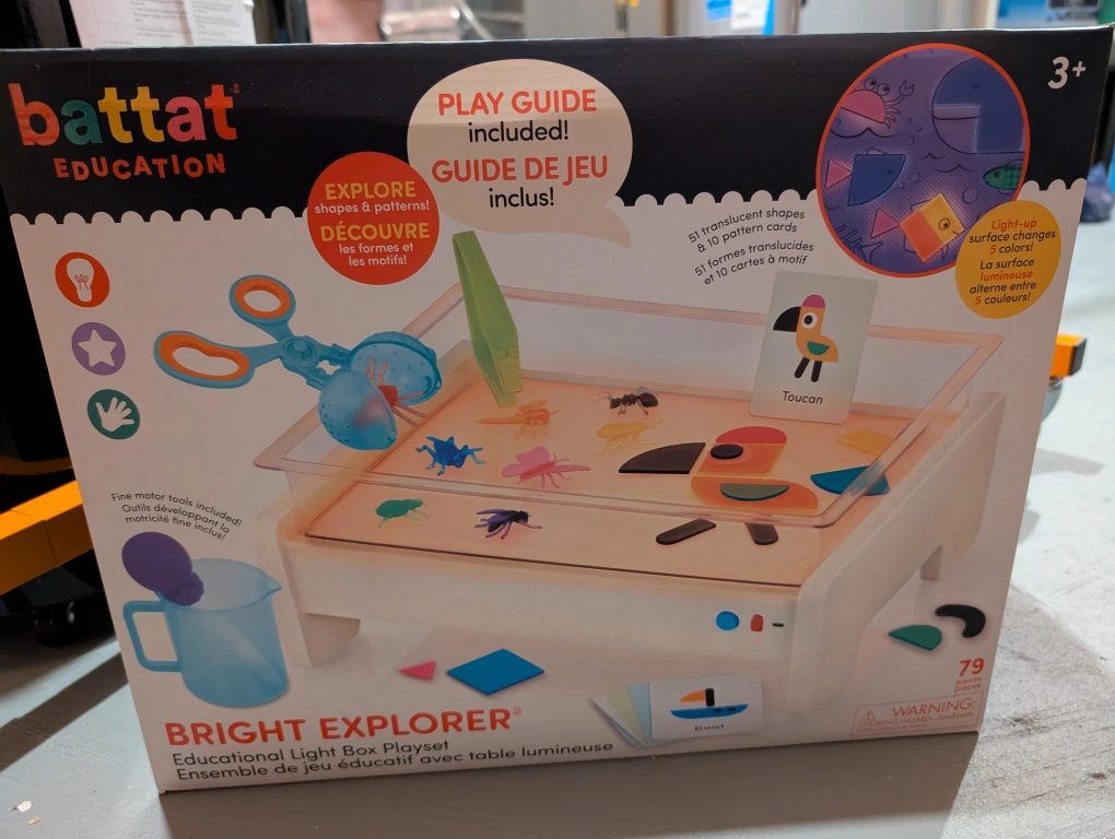 This is a Battat Bright Explorer Educational Light Box Playset! It includes a play guide and helps to explore shapes and patterns. The light-up surface changes 5 colours! Includes 51 translucent shapes & 10 pattern cards and fine motor tools