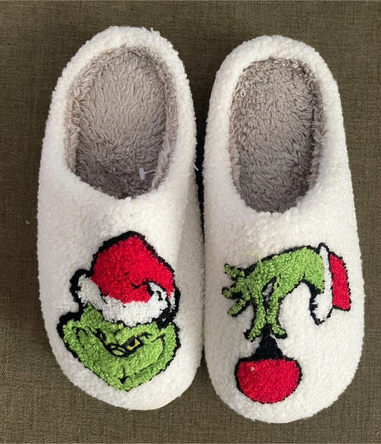 Super cute and comfy slippers featuring the Grinch! They're white with a fluffy texture and have embroidered Grinch designs on each slipper. Perfect for keeping your feet warm and cozy during the holidays!