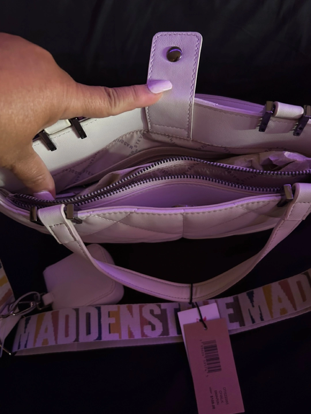 New Steven Madden hand bag beige color. side straps . Holds lots of things never been used medium size. Beautiful bag.