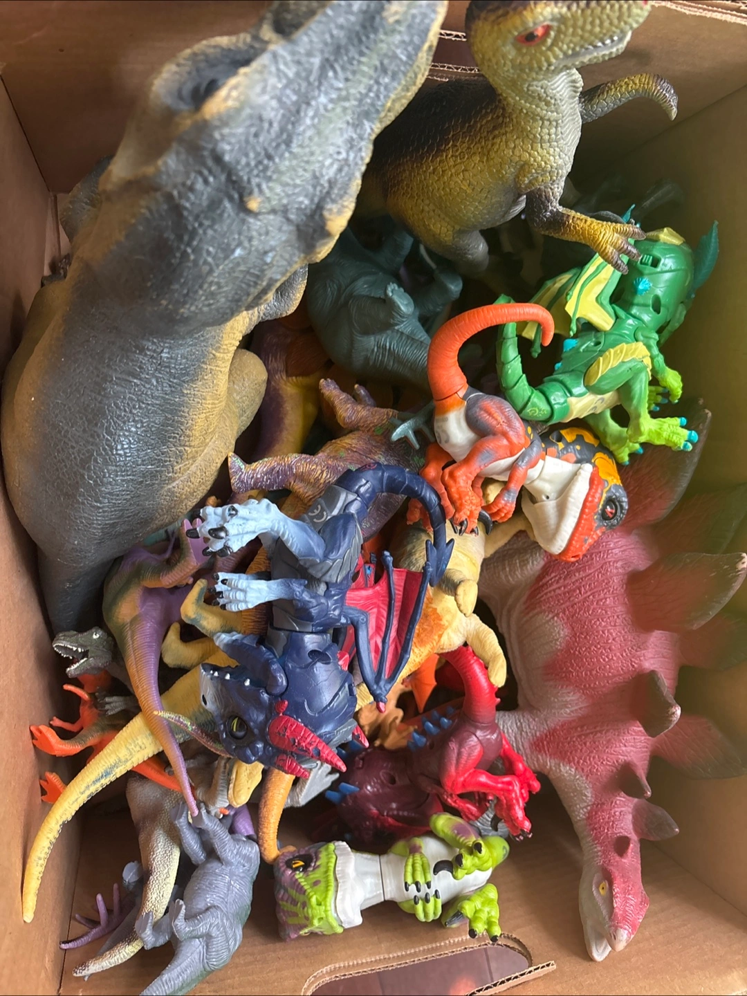 Selling a box full of assorted dinosaur toy figures! There's a variety of different dinosaurs in various colours and sizes. Perfect for any young dinosaur enthusiast or collector