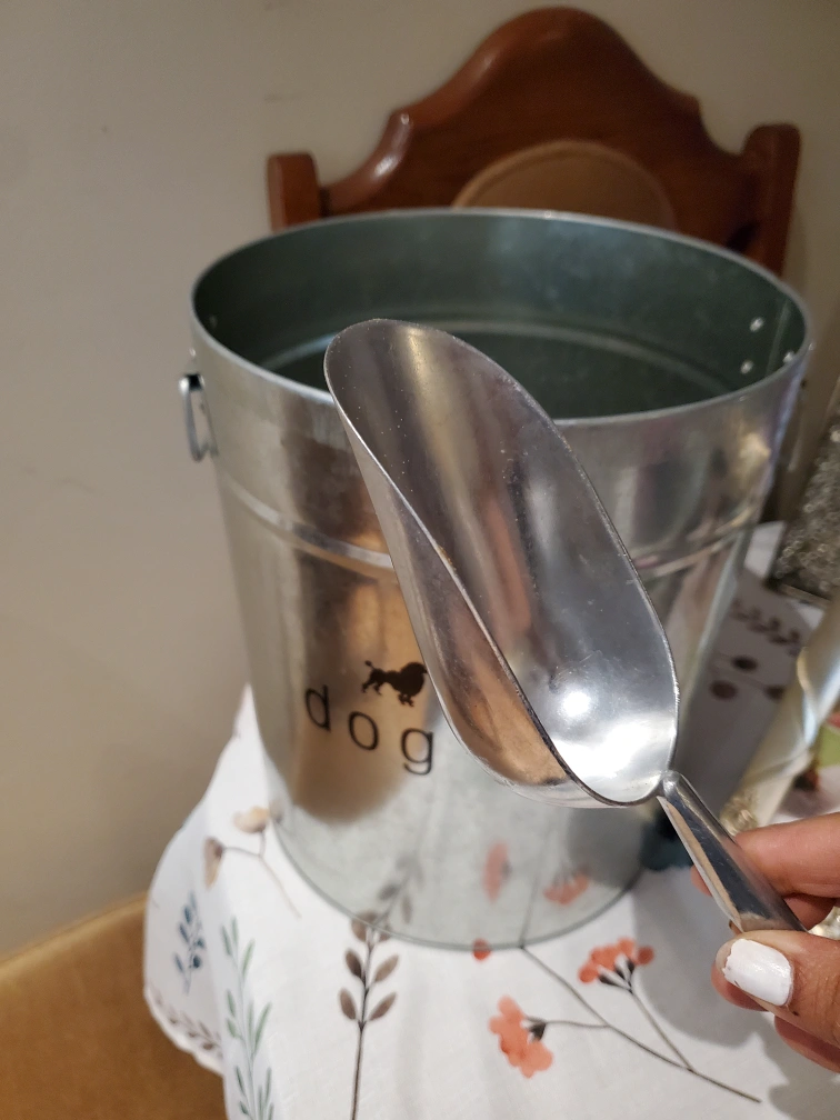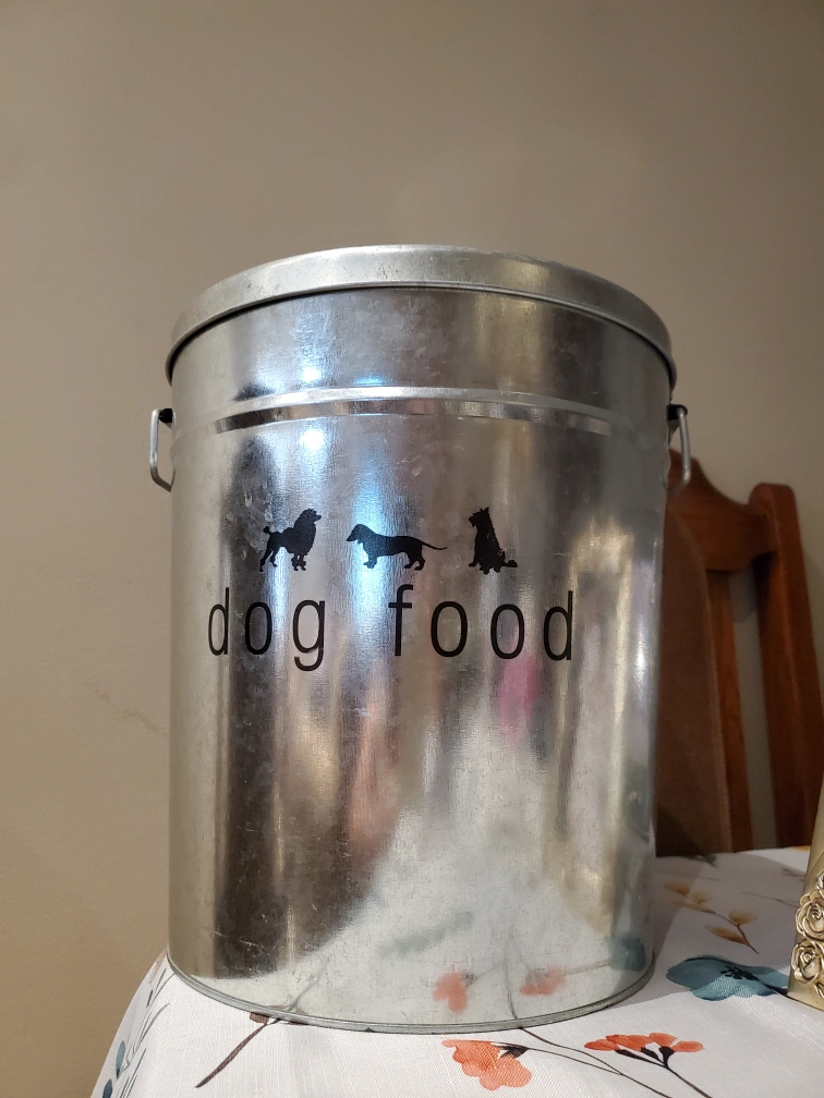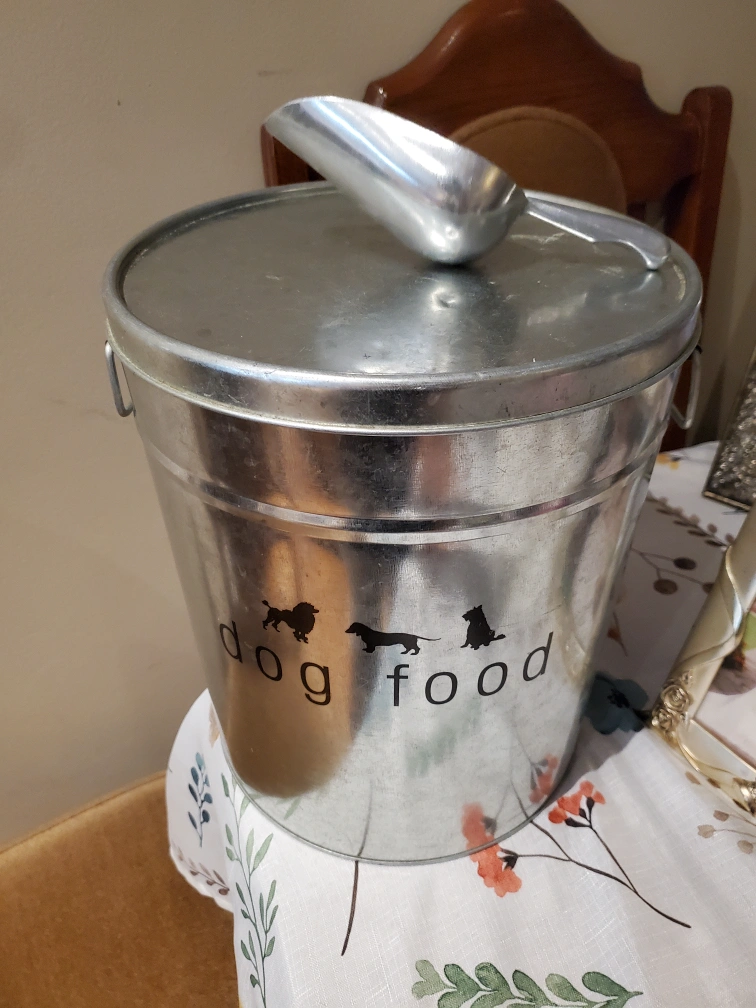 I'm selling a galvanized metal dog food storage container. It comes with a handy scoop. The container has a cute design with "dog food" and animal silhouettes on the front. It's perfect for keeping your pet's food fresh and organized.