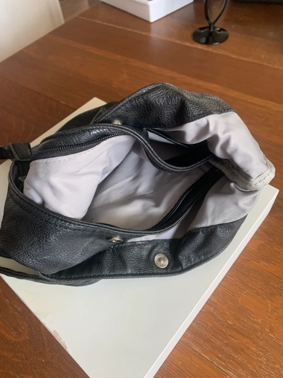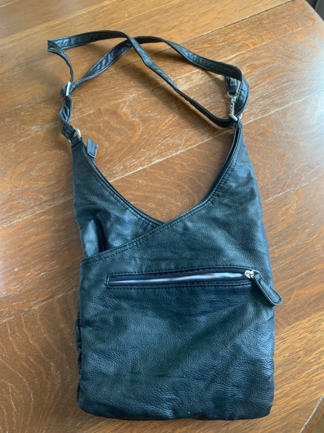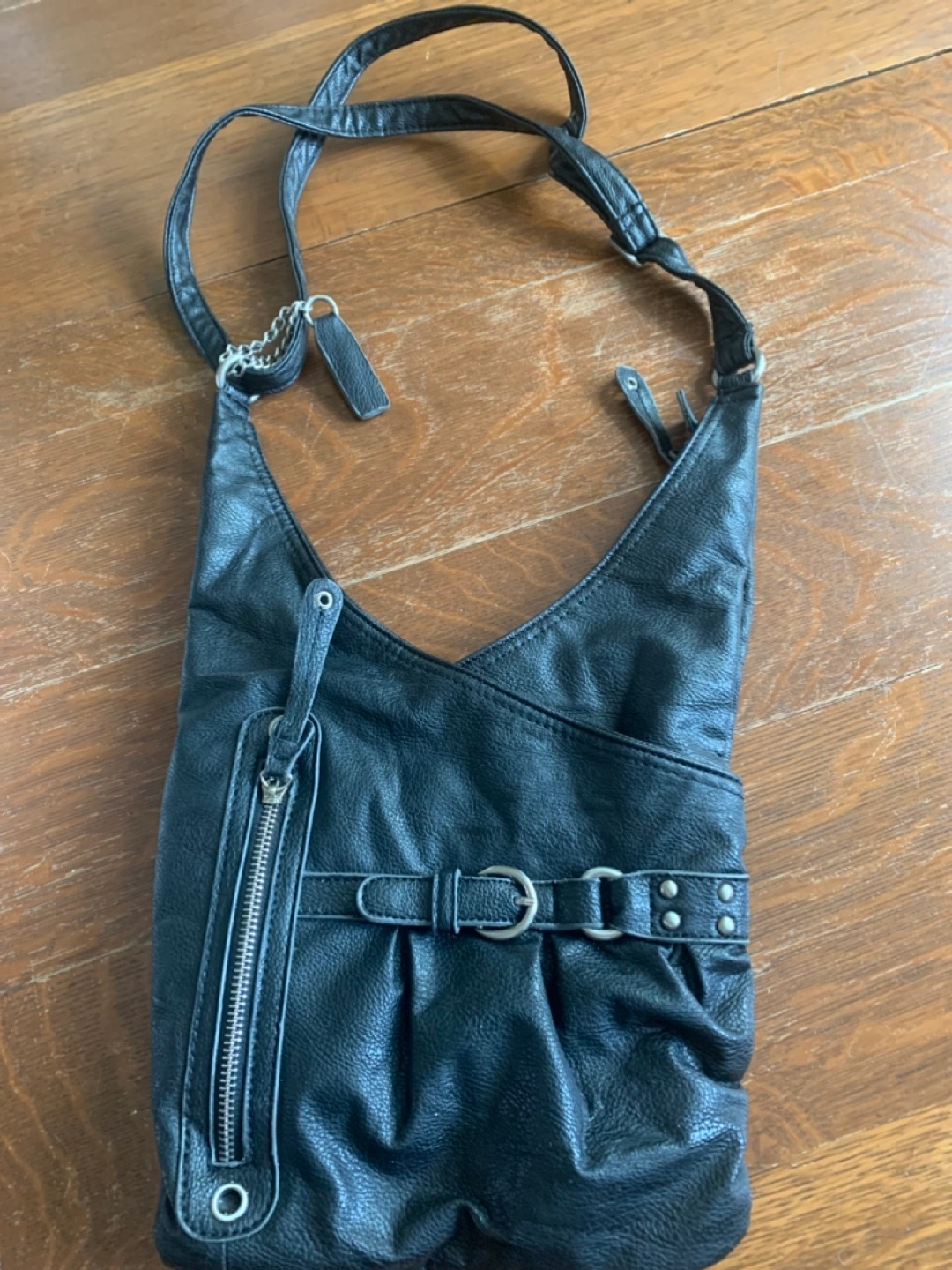 I'm selling a black crossbody bag. It's in great condition and has a stylish design. It features multiple zippers and compartments for organization. The strap is adjustable for comfortable wear. Naturalizer leather