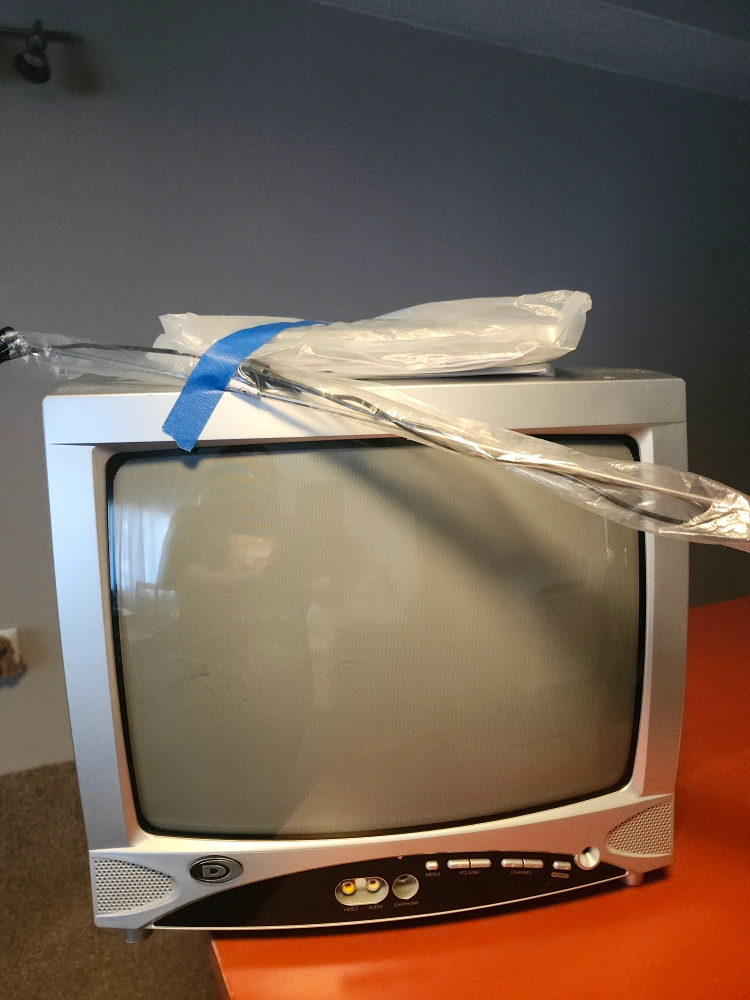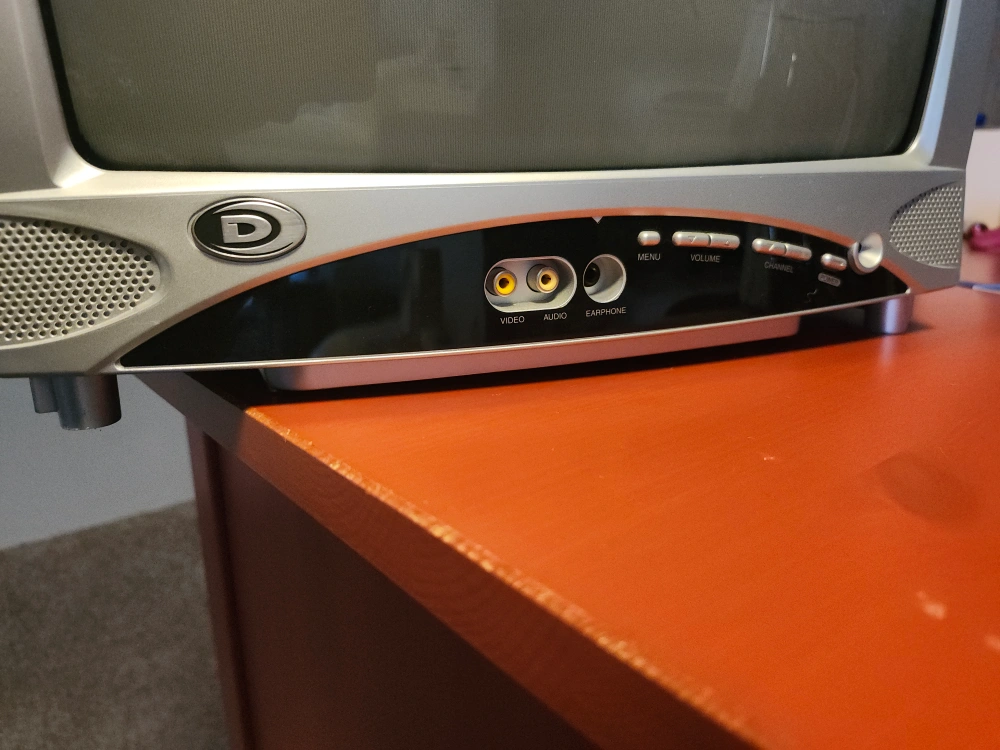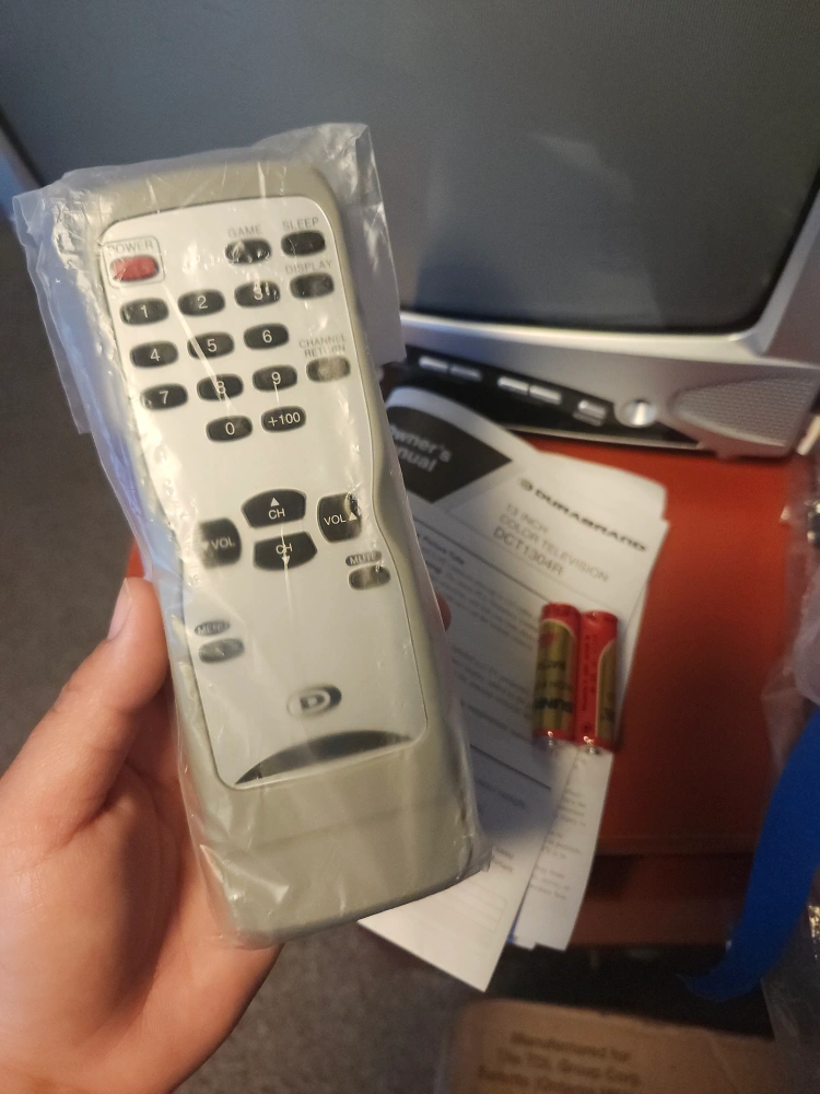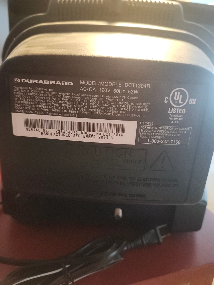 Selling a Durabrand 13-inch colour television, model DCT1304R. It comes with the original remote and manual. Manufactured September 2004.