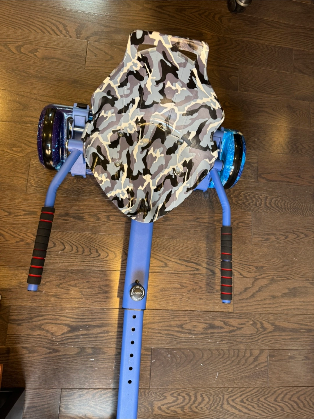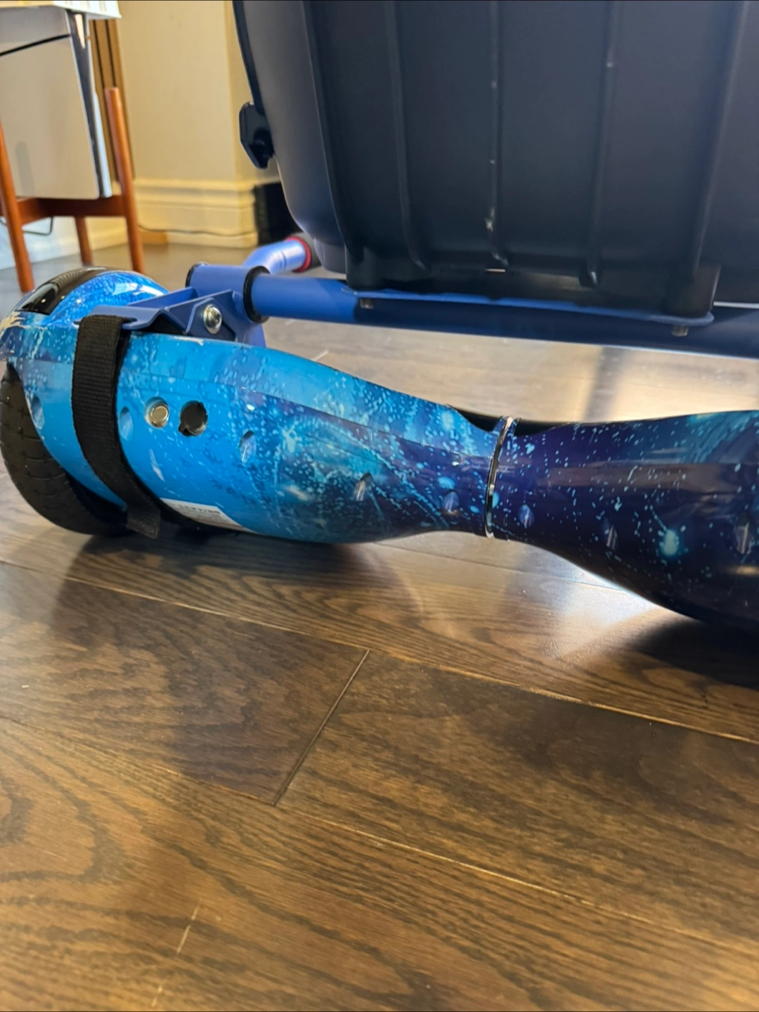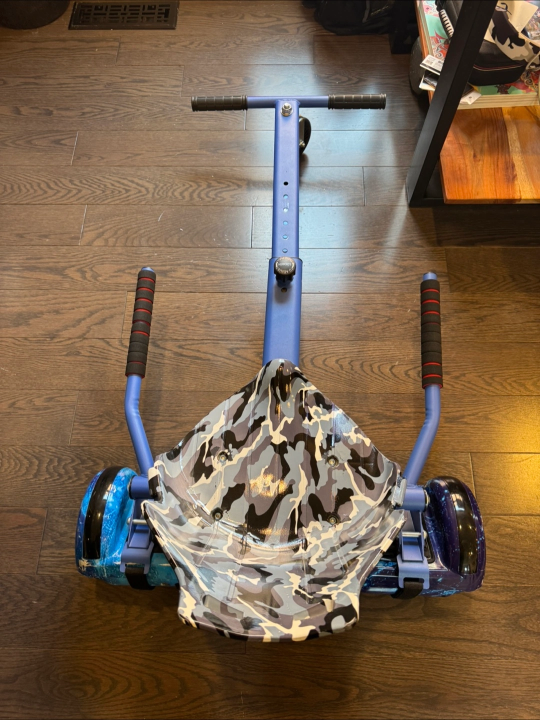 Selling a fun hoverboard with a seat attachment! It's in good condition and ready for a new home. The hoverboard features a cool blue design. Originally, it retailed for $179.99.