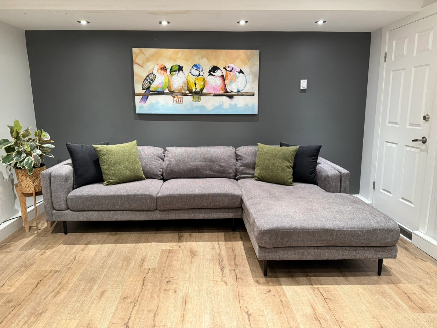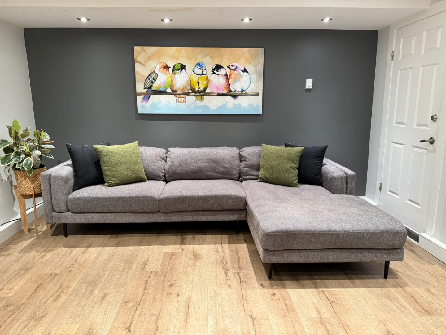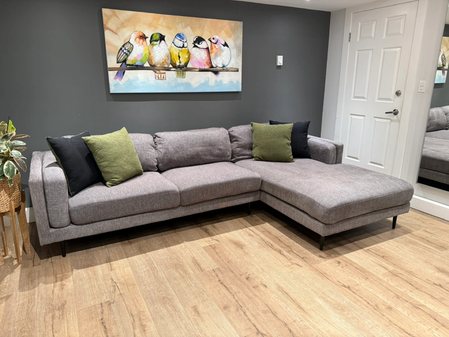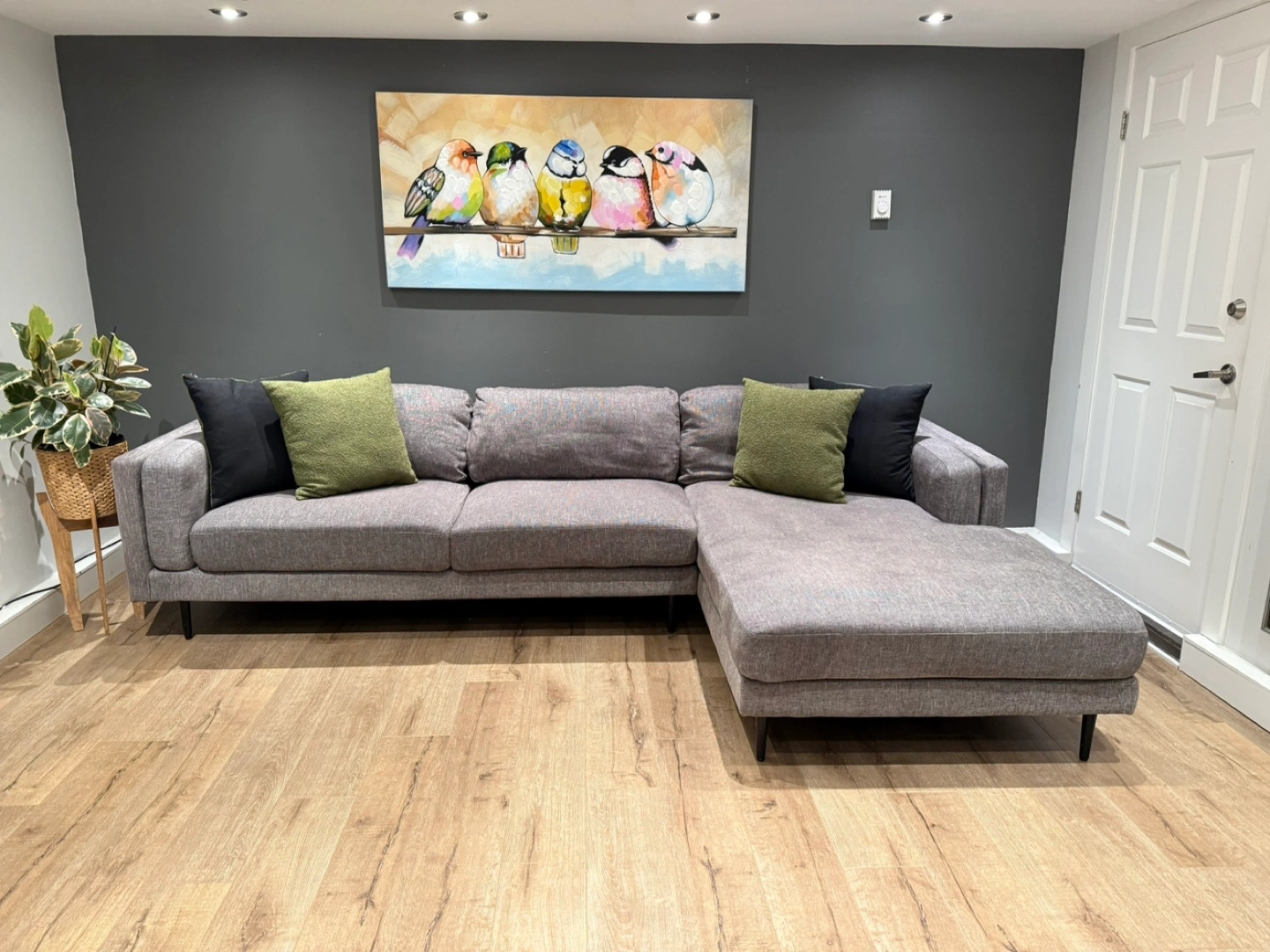 Upgrade your living space with this modern grey 3-piece sectional with chaise – complete with a matching ottoman that transforms the setup into a full-size bed. Perfect for lounging, entertaining, overnight guests, or everyday relaxation.