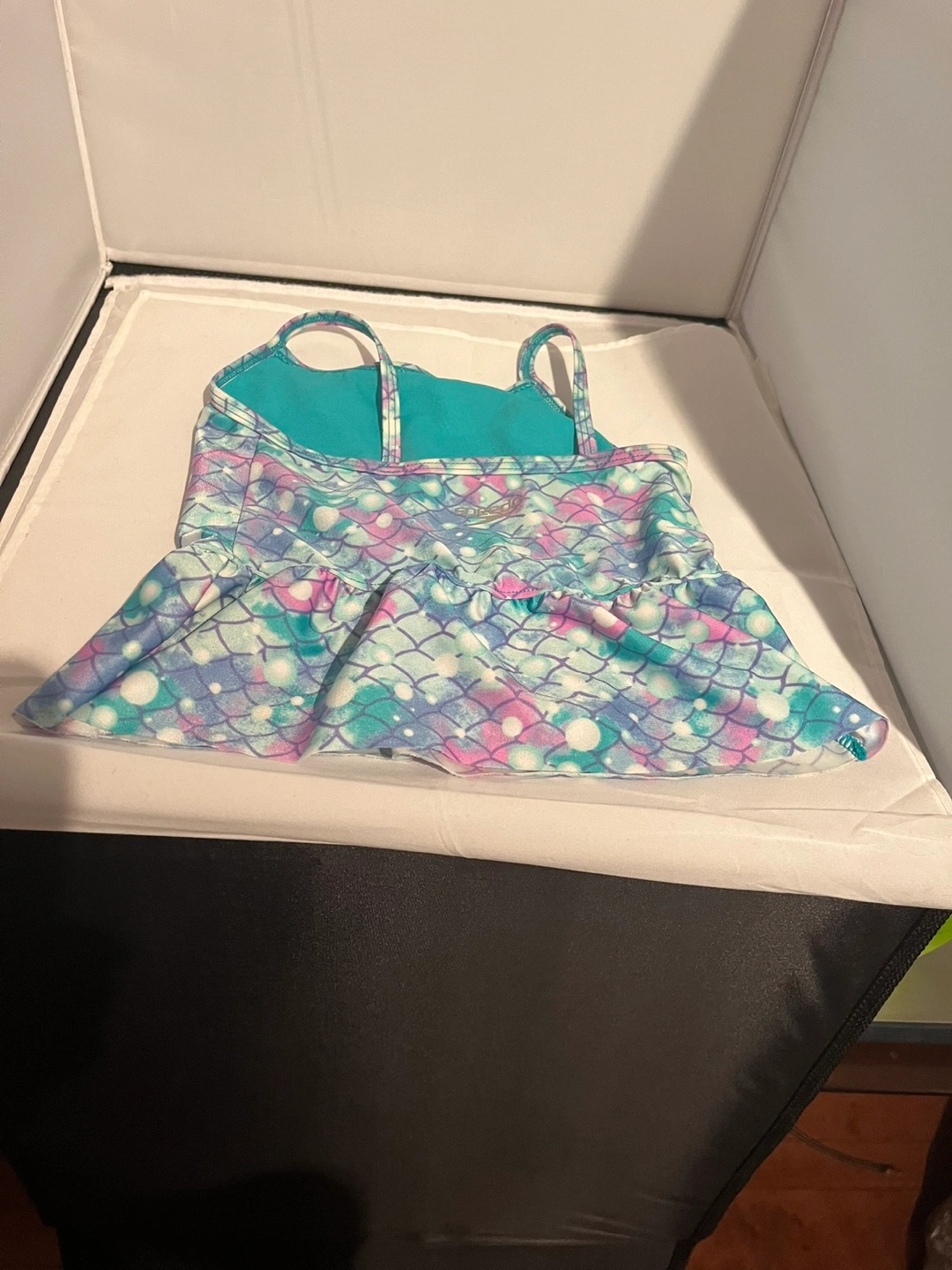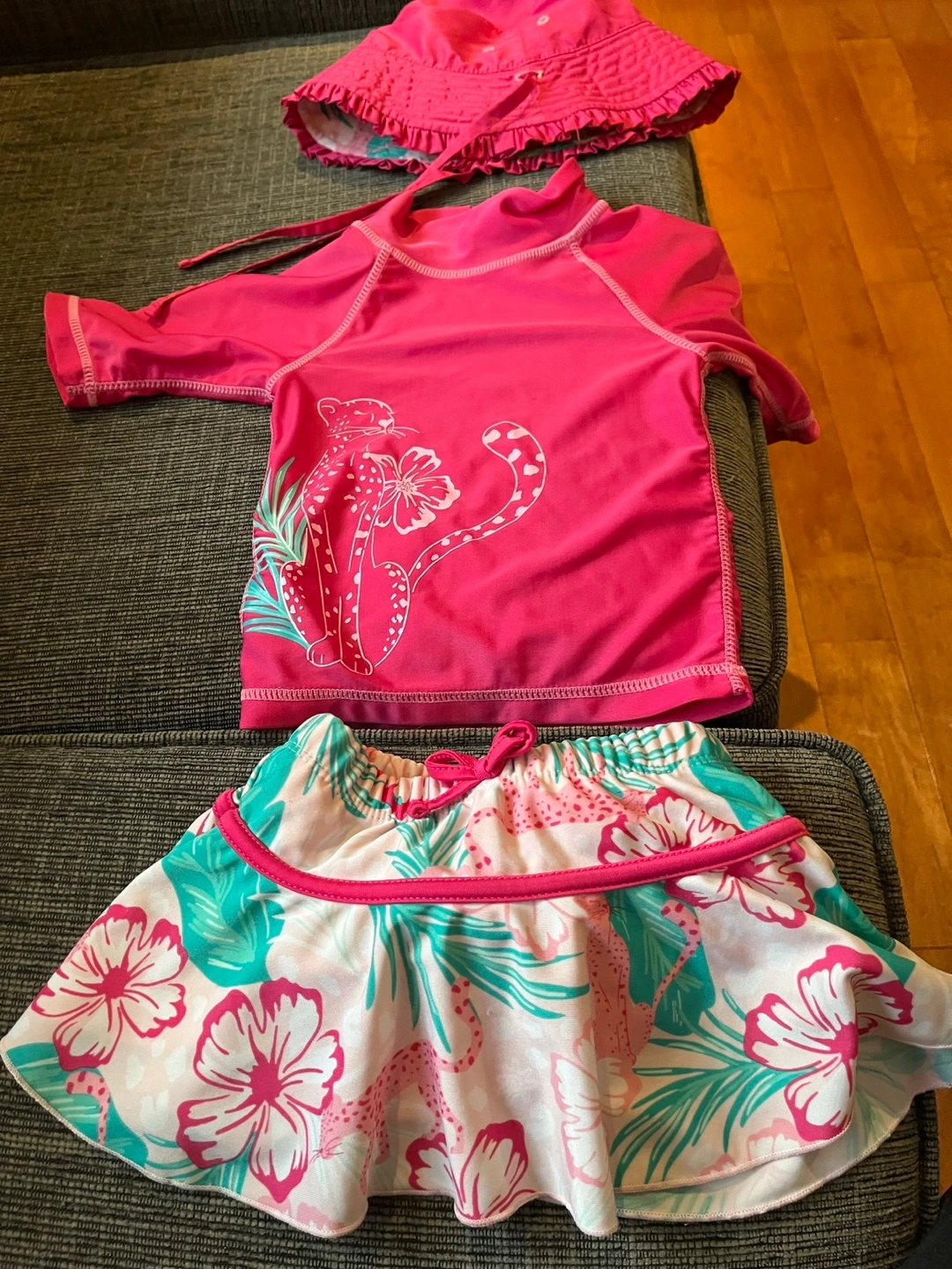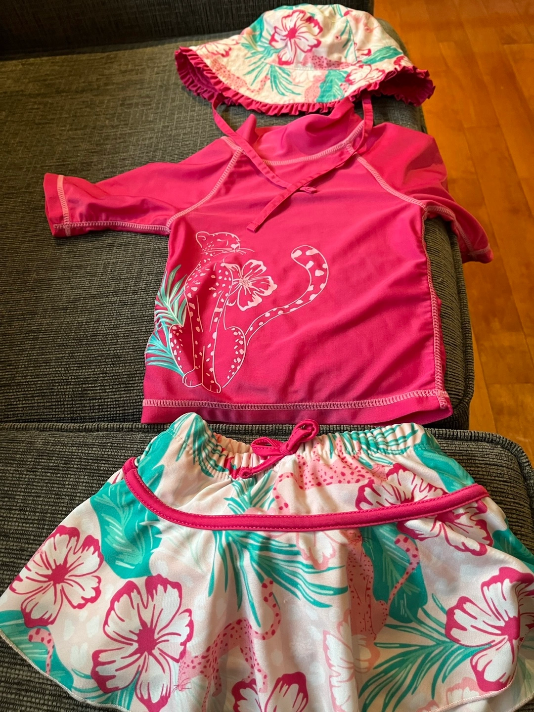 Adorable girls' three-piece swimsuit set. Includes skirt, and sun hat. Features a pink and floral print. Perfect for summer fun. $10 size 12 month Also 2 piece blue $10 size 5 and another size 6 All for $25