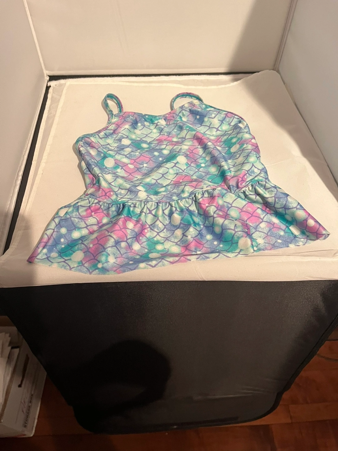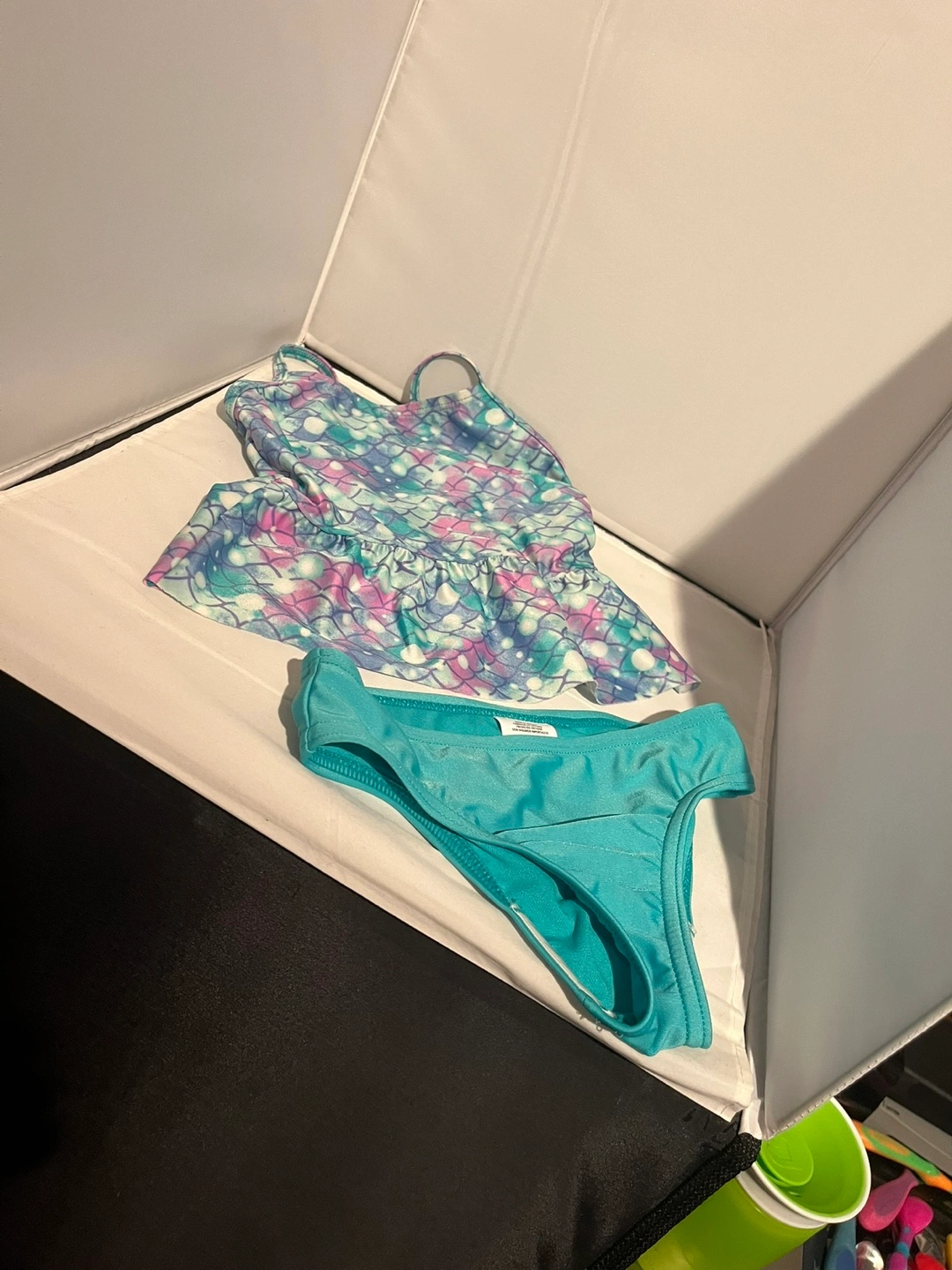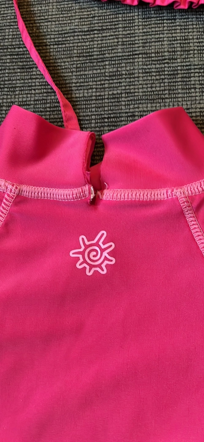 Adorable girls' three-piece swimsuit set. Includes skirt, and sun hat. Features a pink and floral print. Perfect for summer fun. $10 size 12 month Also 2 piece blue $10 size 5 and another size 6 All for $25