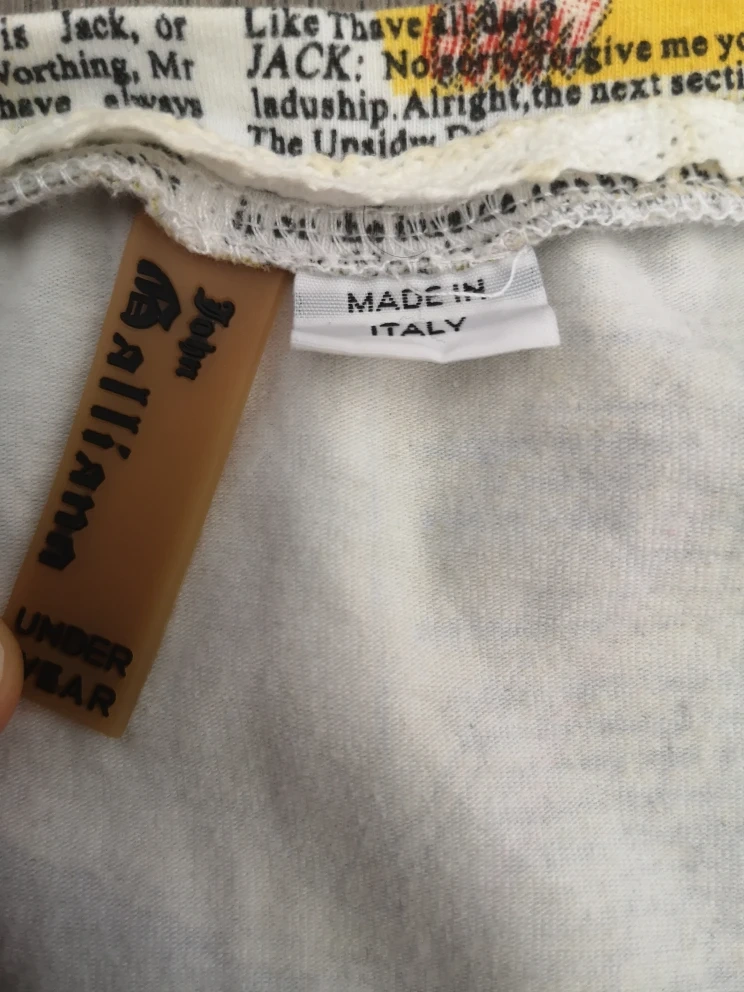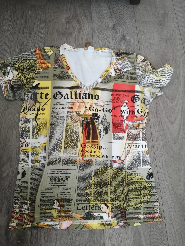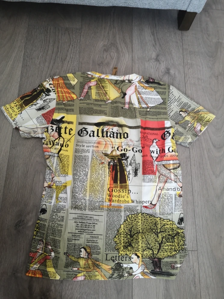 Unique John Galliano t-shirt with a cool newspaper print! It's a size L and made in Italy. The material is 100% cotton. Perfect for adding a bit of flair to your wardrobe!