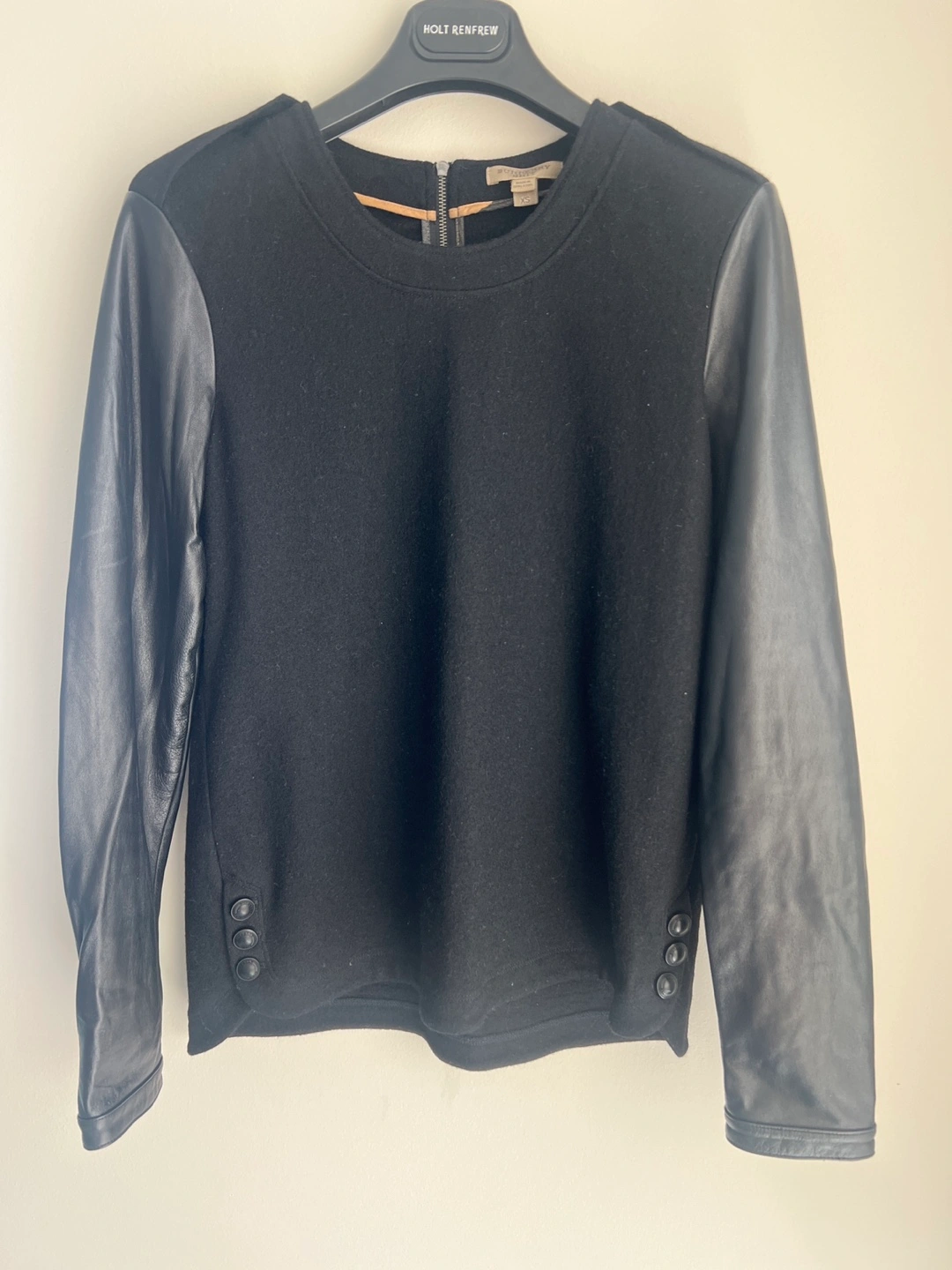 A stylish black Burberry sweater in size XS. It features leather sleeves and a zipper at the back. The material is soft and comfortable, perfect for layering!