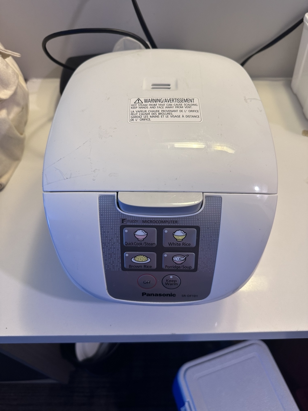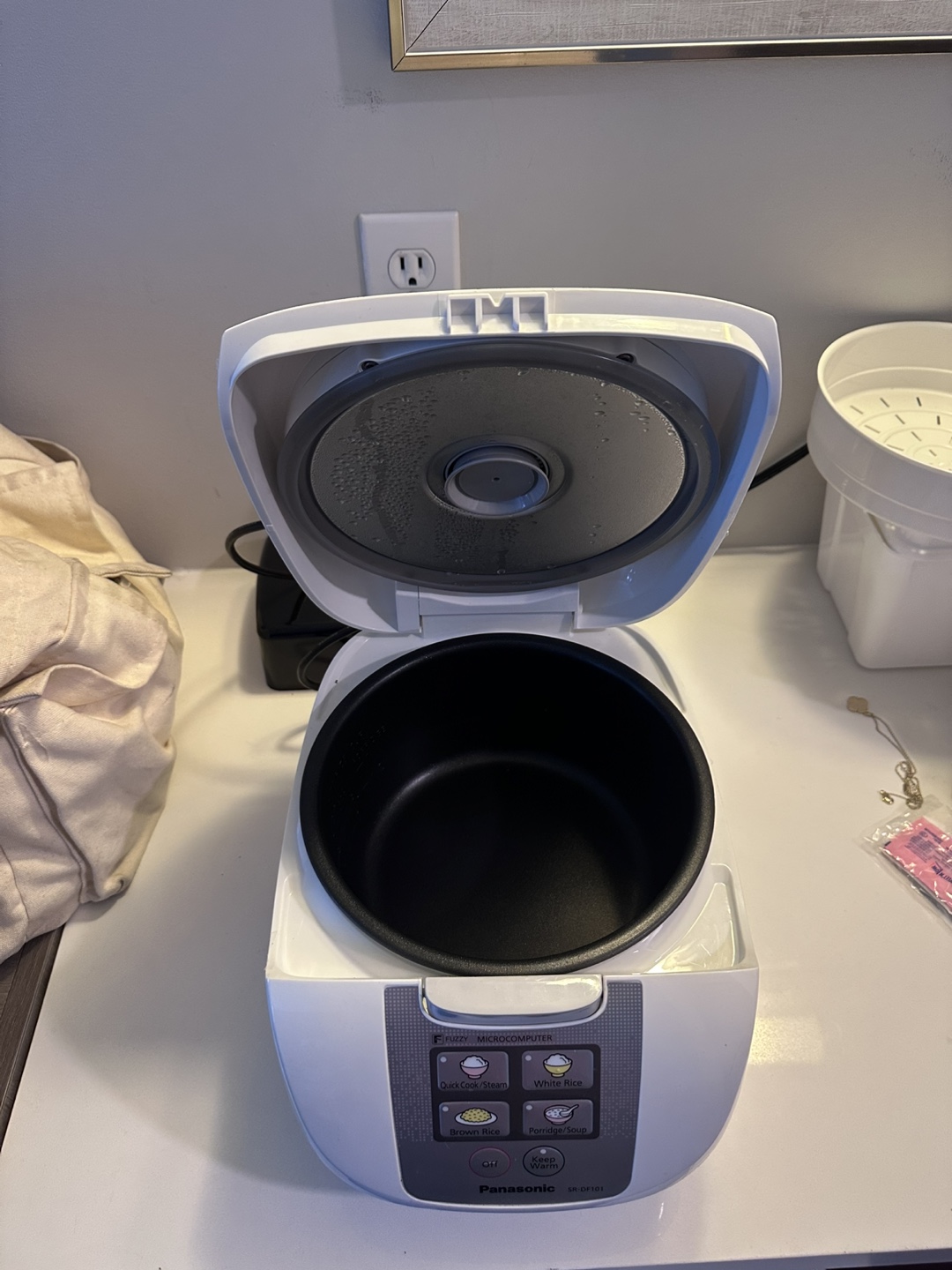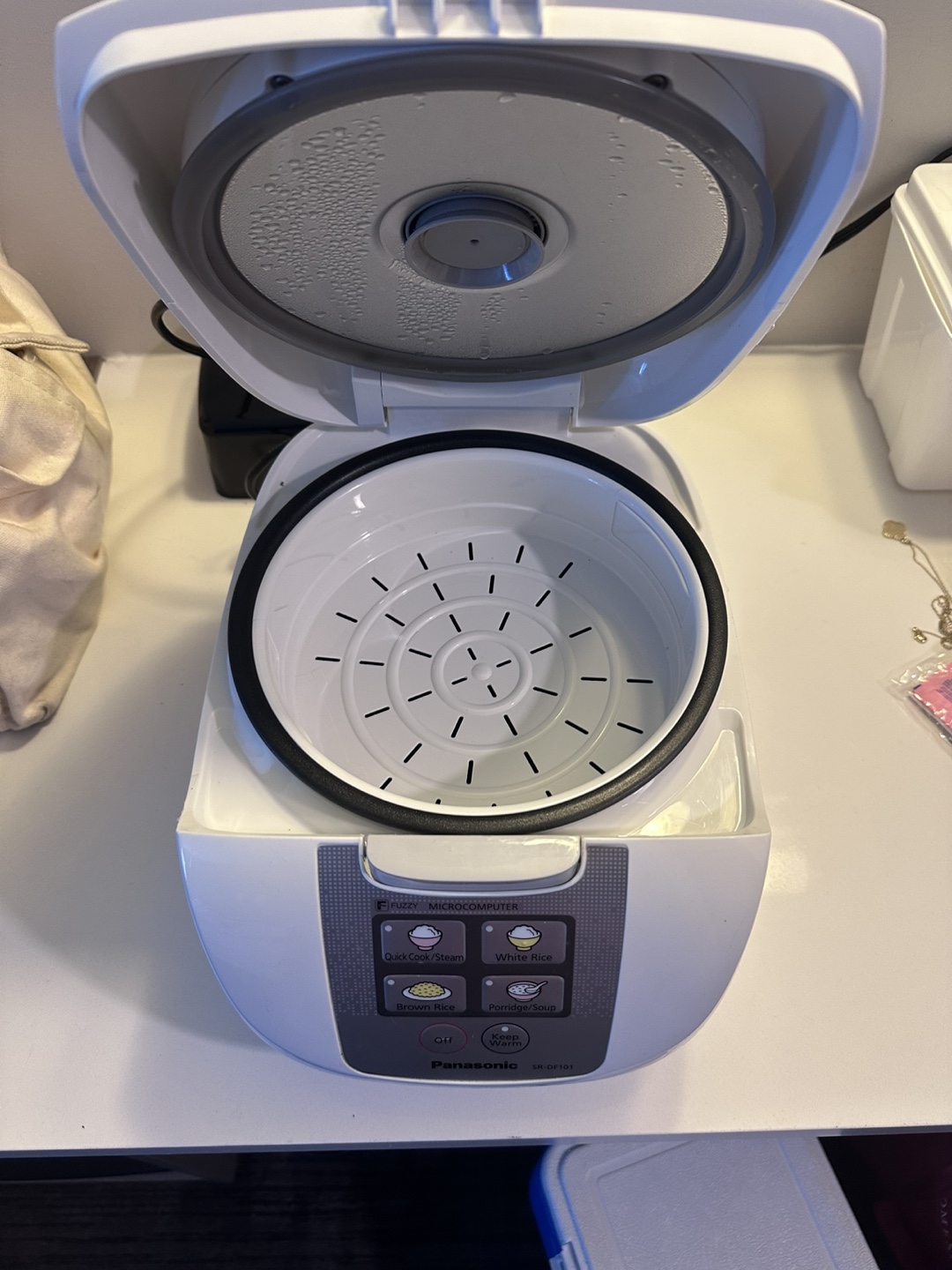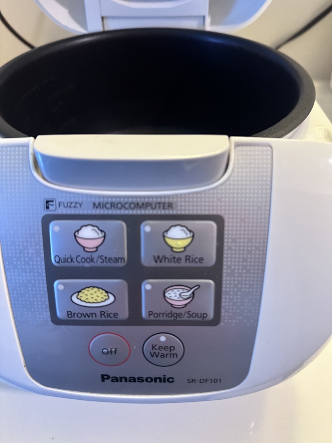 Panasonic Fuzzy Rice Cooker, model SR-DF101. It has settings for quick cook/steam, white rice, brown rice, and porridge/soup. It also has a keep warm function. Great for family of 3-4.