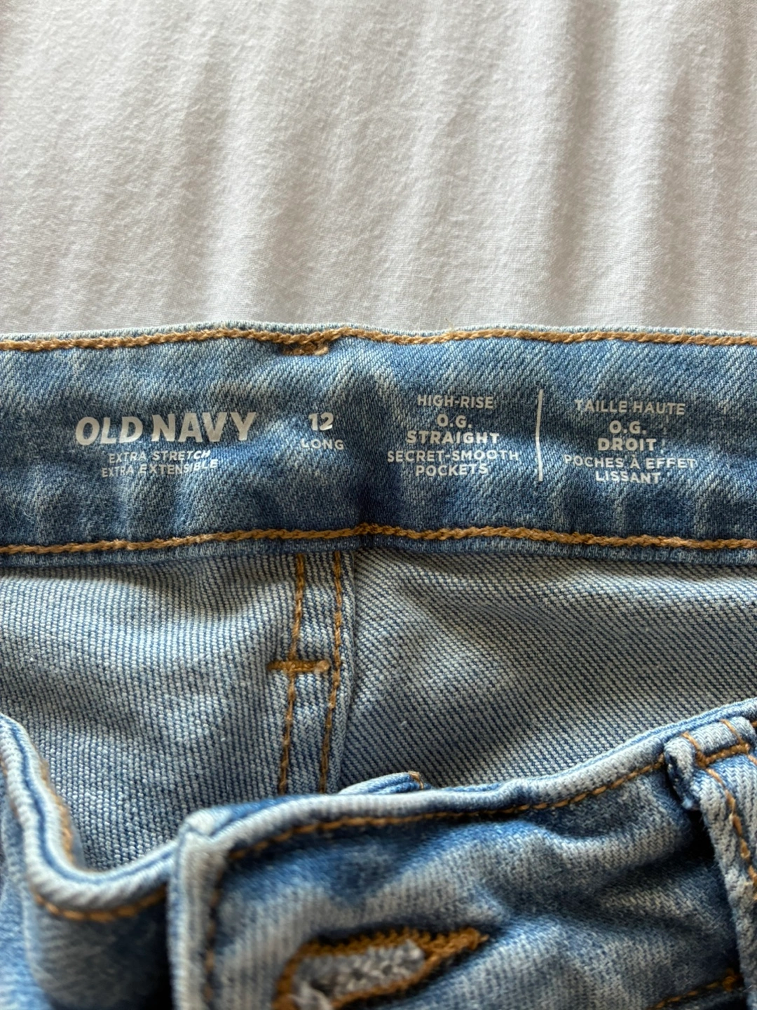 Selling a pair of Old Navy high-rise straight jeans in size 12 long. They're in great condition and feature a comfortable, extra-stretch denim with secret-smooth pockets. Perfect for everyday wear!