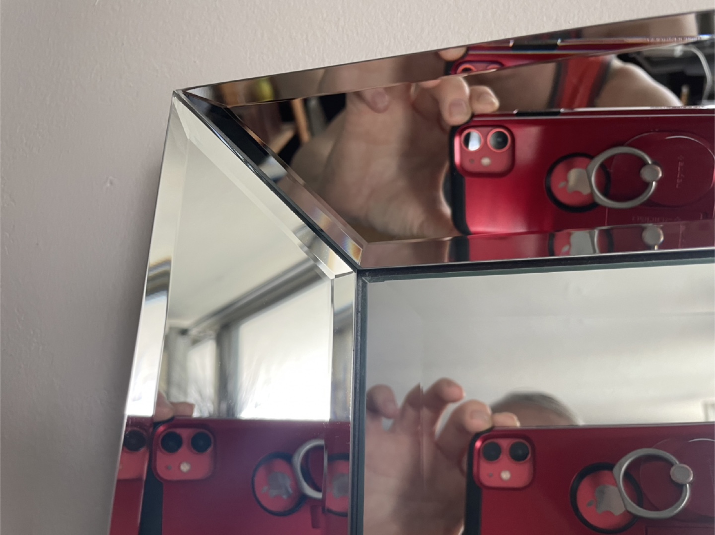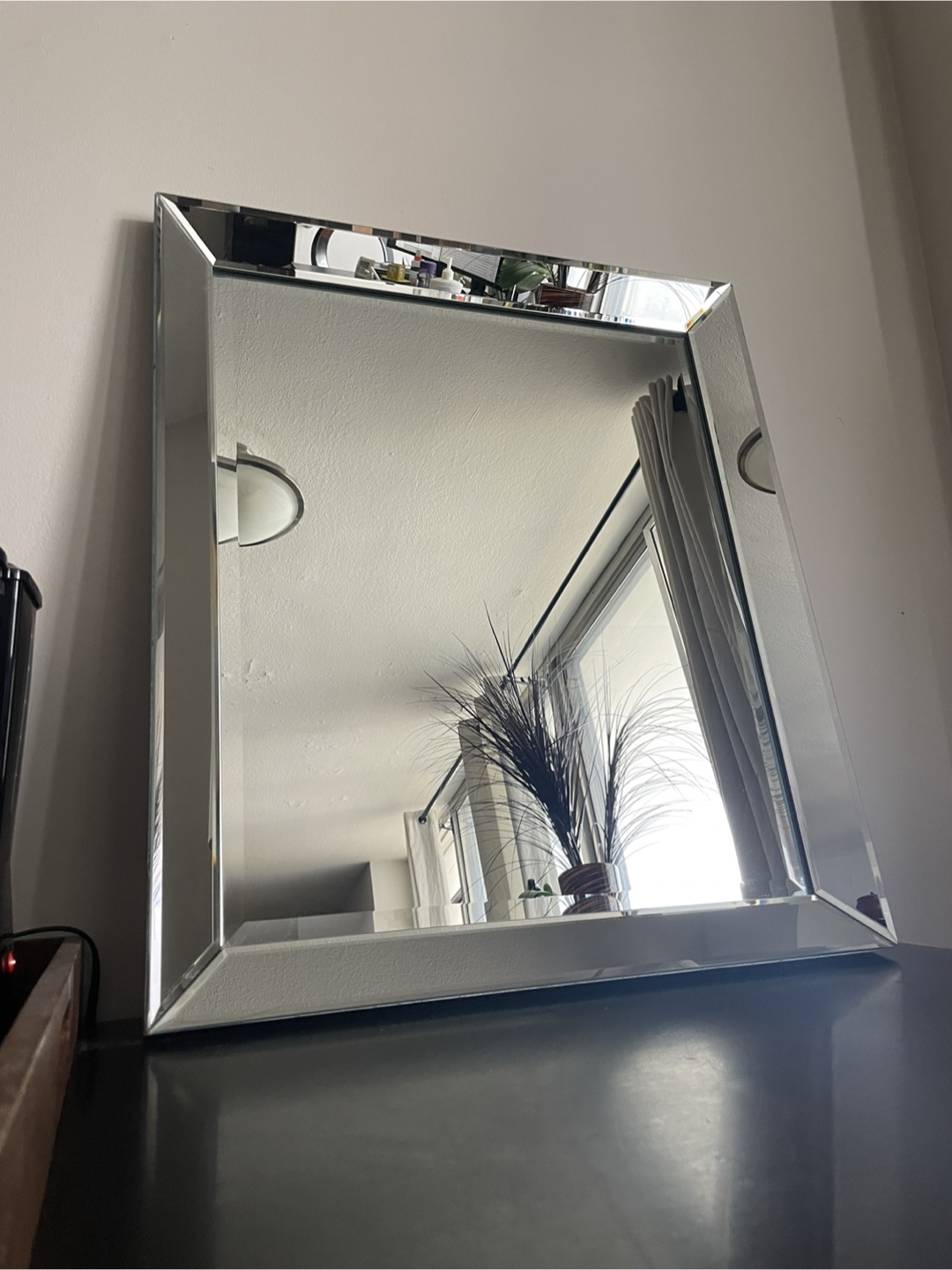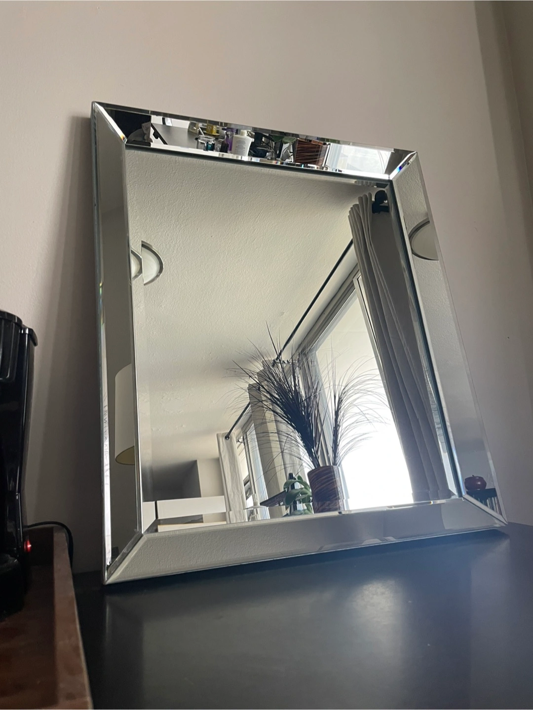 Selling a framed bevelled mirror. It's in great shape and would look lovely in any room. It has a modern and clean design. Perfect for adding a touch of elegance to your home decor.