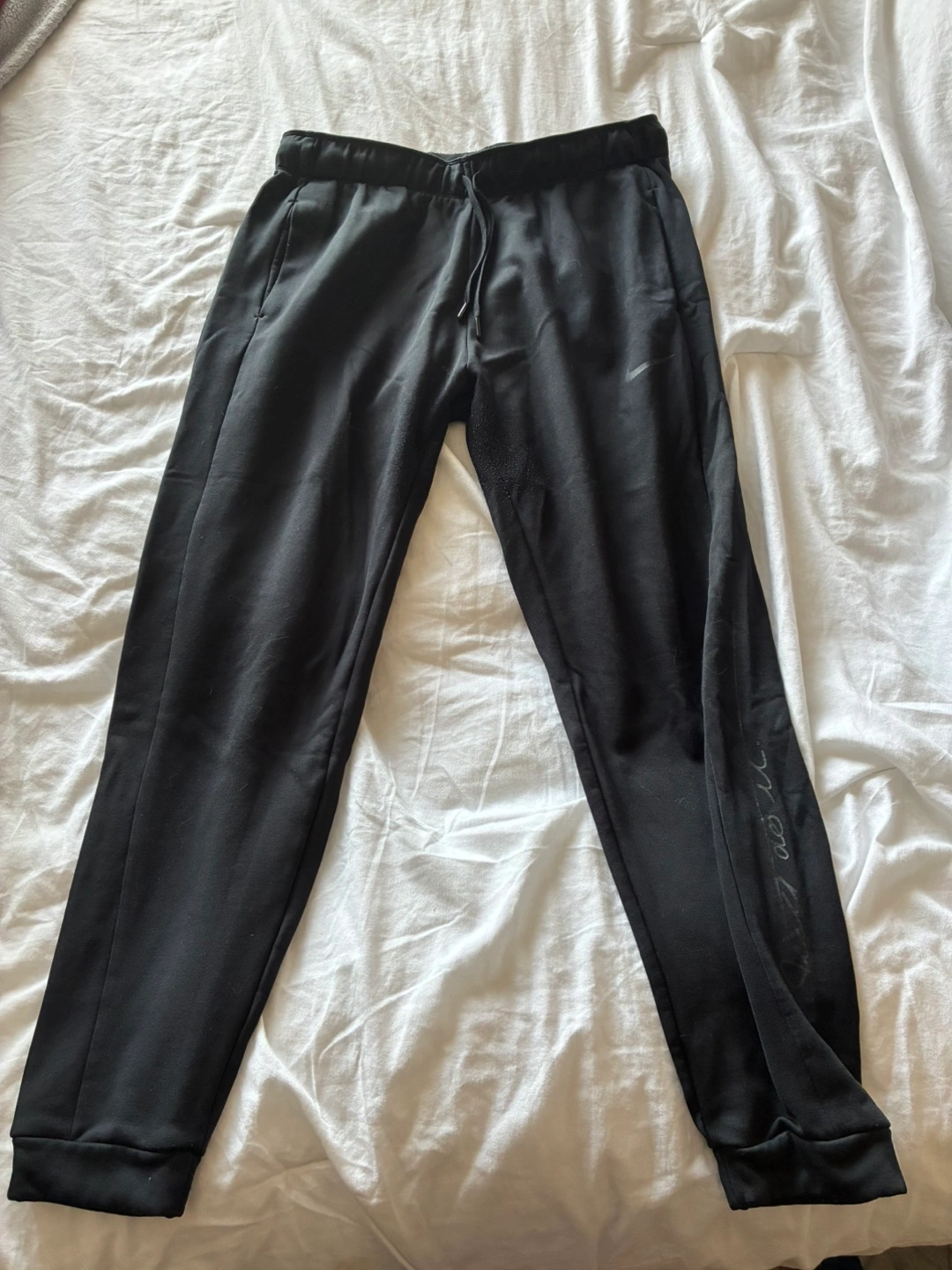 Selling a pair of Nike track pants in black. They are size M and in good condition - just some small pilling. Perfect for workouts or just lounging around!