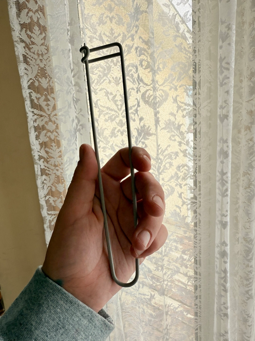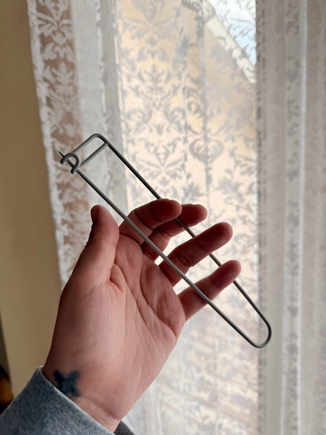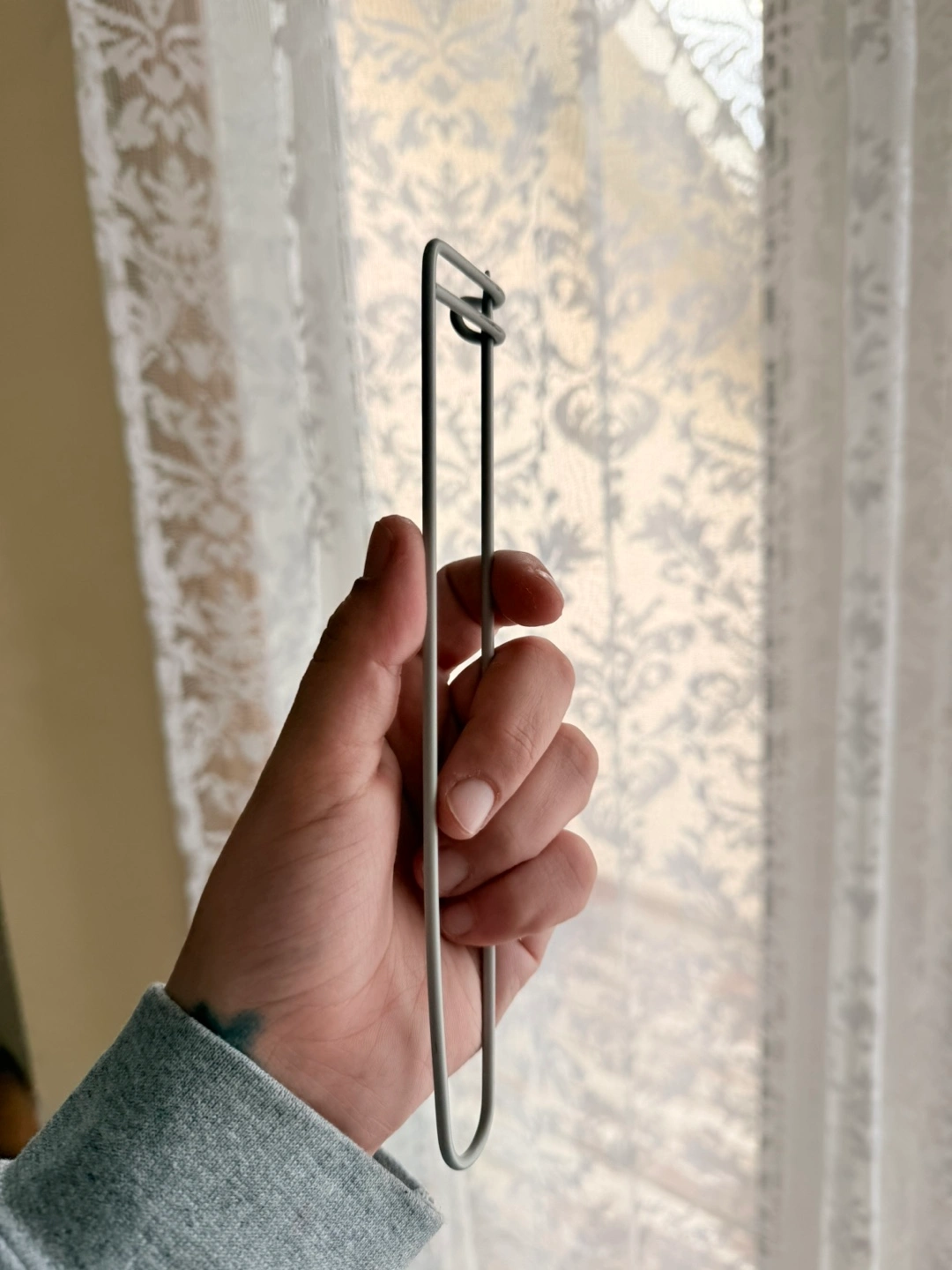 The object in the image is a stitch holder, commonly used in knitting and crocheting. Purpose: Stitch holders are used to temporarily hold live stitches in knitting projects, preventing them from unraveling when they are not actively being worked on. Functionality: They work like a large safety pin, with a latching mechanism to keep the stitches securely on the holder.