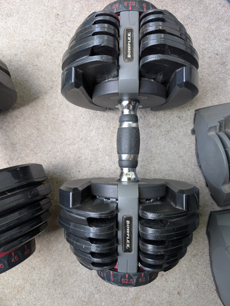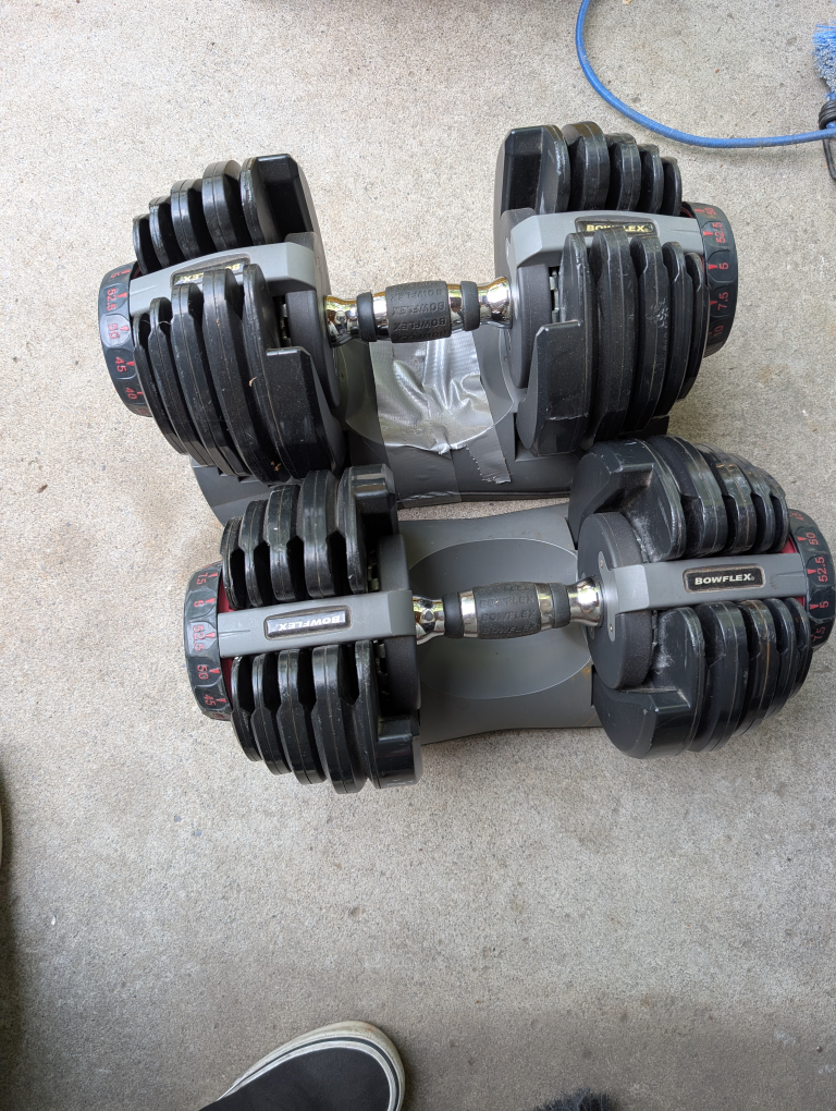 Selling a pair of Bowflex SelectTech 552 adjustable dumbbells. They're in good condition and ready for your home workouts. These dumbbells adjust from 5 to 52.5 lbs, so they're great for a variety of exercises one of the bases is taped together, but everything works normally.