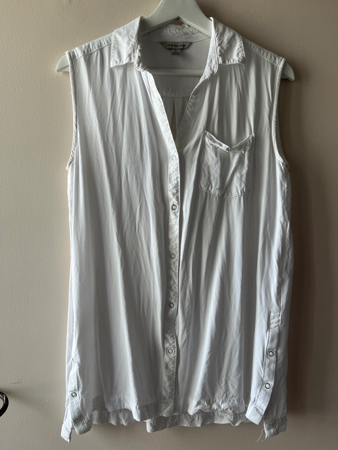 Selling a Calvin Klein Jeans sleeveless top in size small. It's a crisp white colour and in good condition. Perfect for layering or wearing on its own! Worn once, in perfect condition.