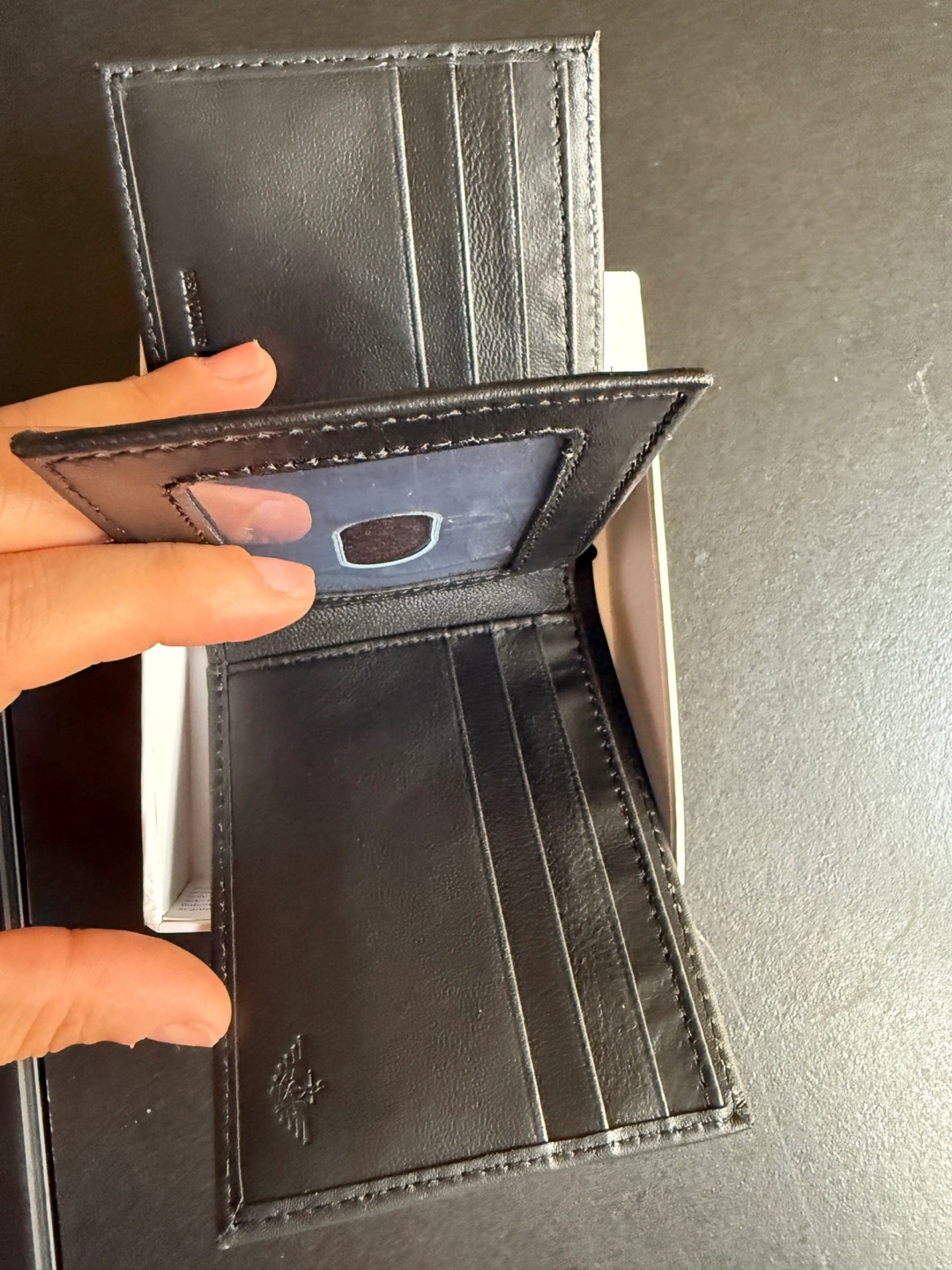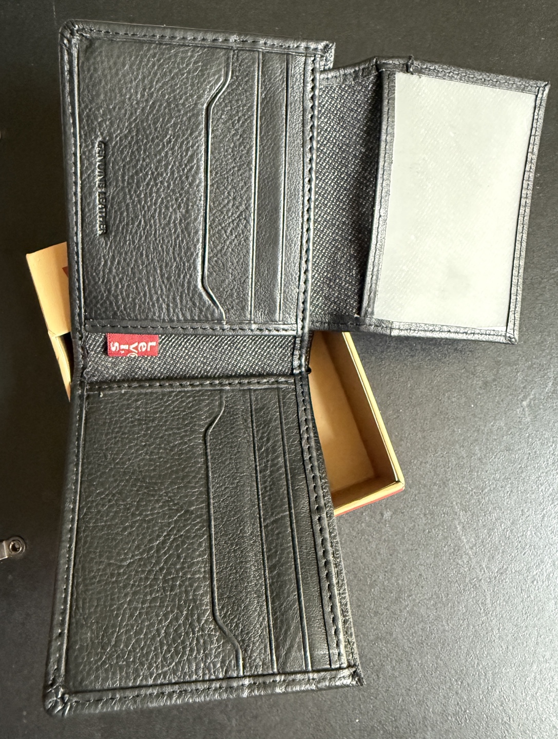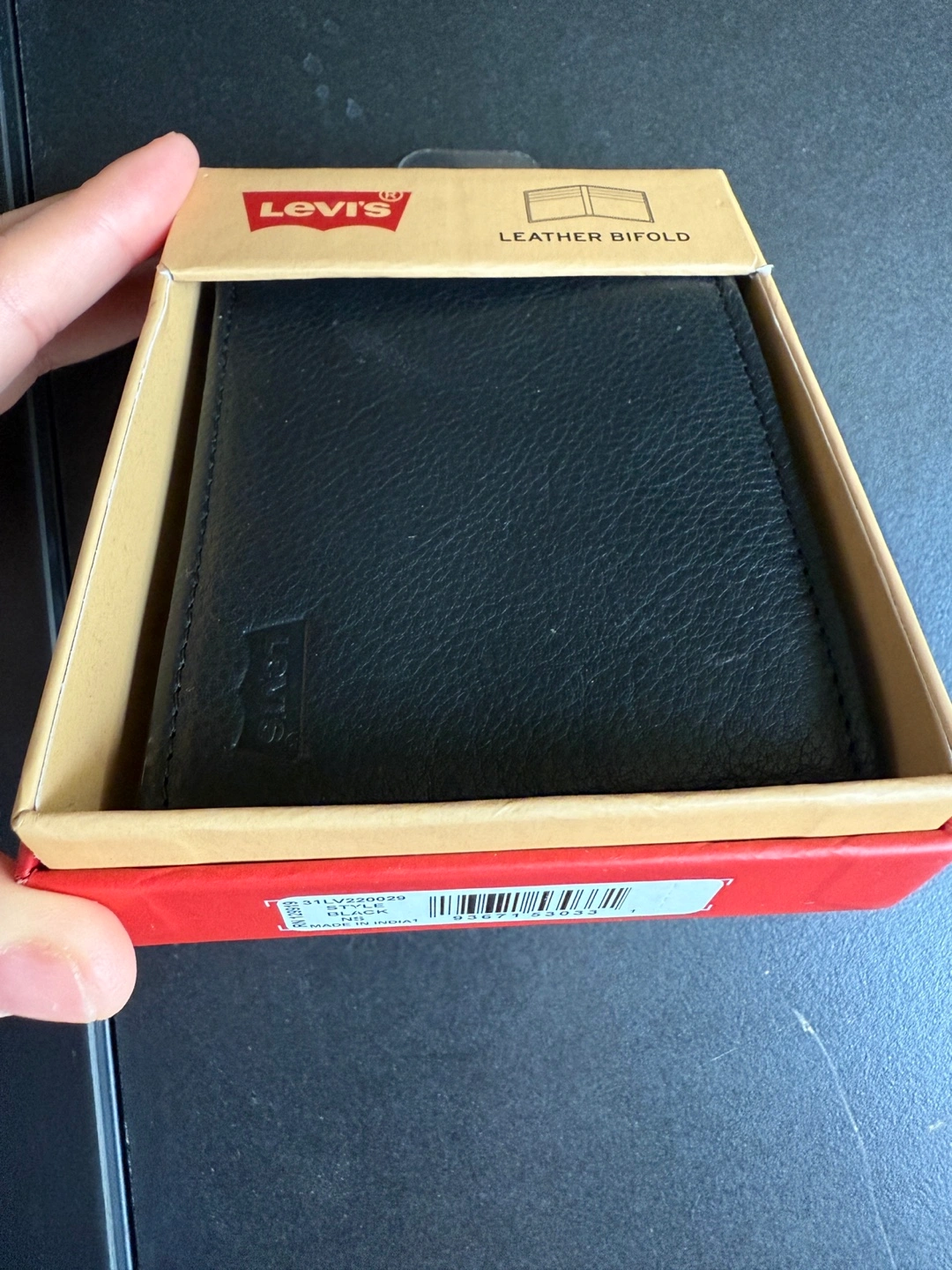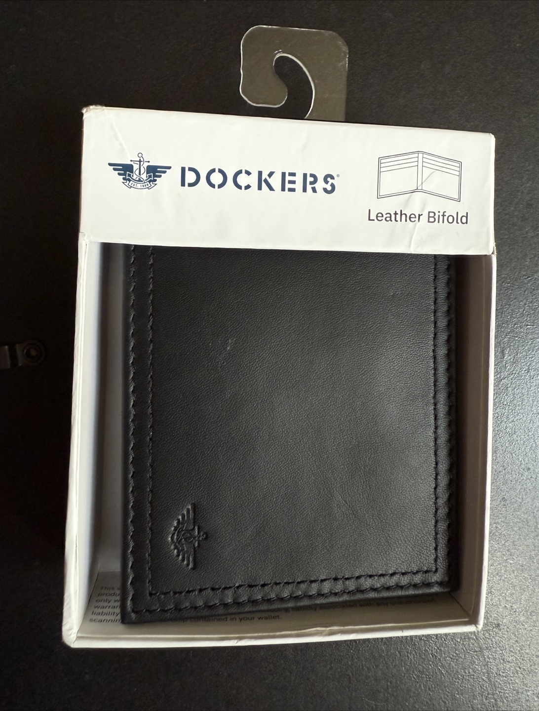 I have a Dockers black leather bifold wallet for sale. It's in great condition and comes with its original box. It's a stylish and practical accessory for everyday use. Levis new, black 25.
