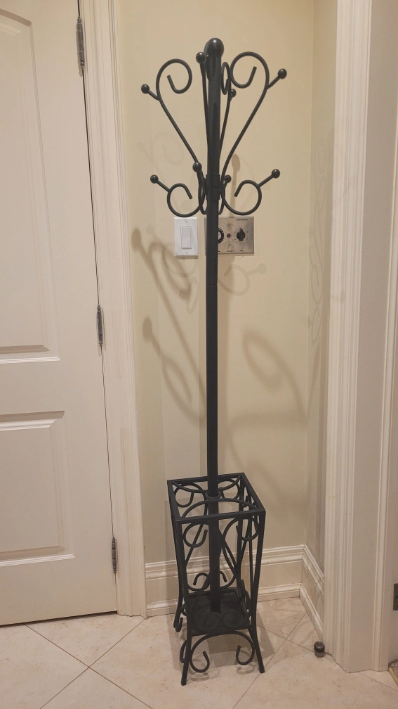 A stylish metal coat rack stand, perfect for keeping your entryway organized! It features a built-in umbrella holder at the base and decorative hooks for coats and hats