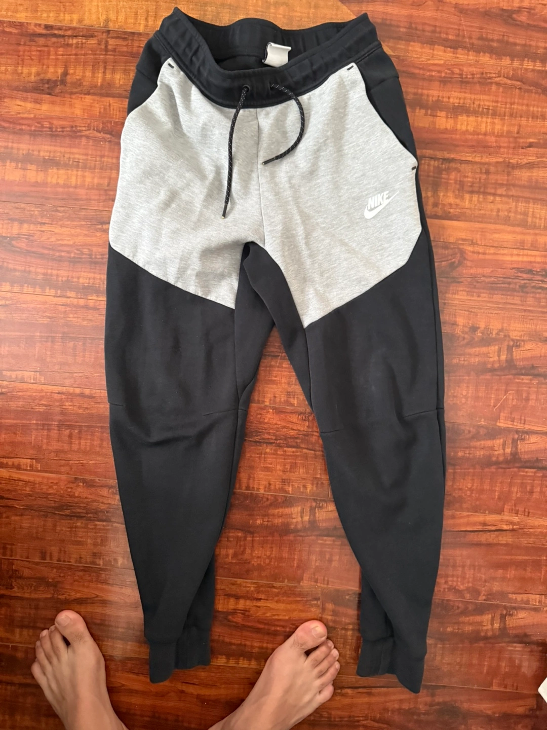 Selling a pair of Nike Tech Fleece pants in black and grey. They're in great shape and super comfy for lounging or hitting the gym. Size is not indicated.