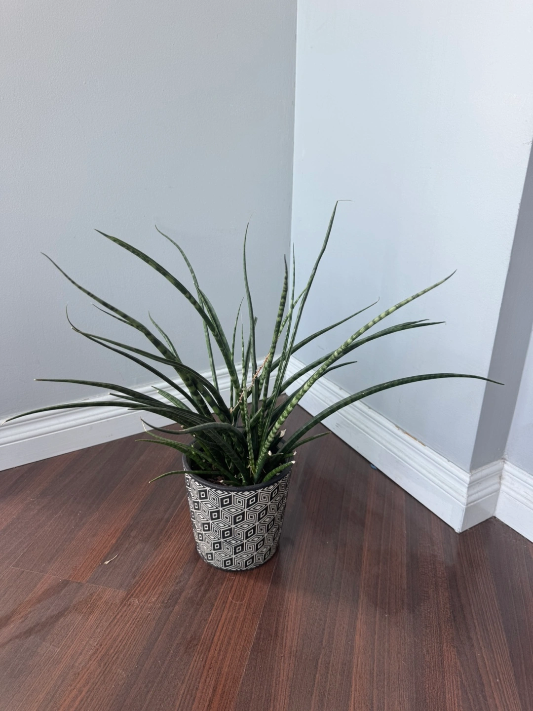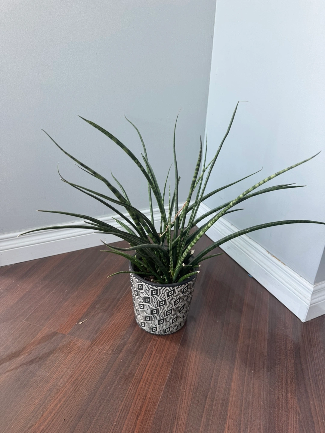 I'm selling a healthy snake plant, also known as Sansevieria, in a decorative pot. It's perfect for adding some greenery to your home or office! This plant is low-maintenance and great for purifying the air