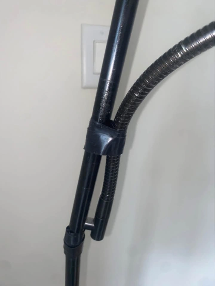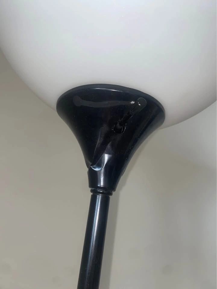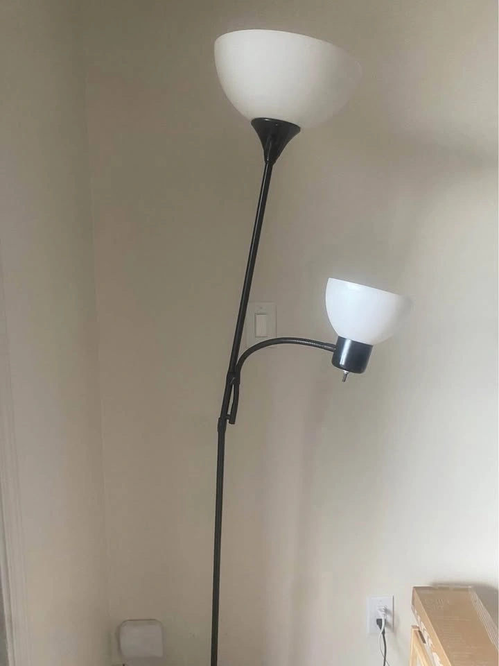 Used floor lamp, no longer needed. Works well, long cable, bright and I believe dimmable but there is a dent at the base of the main lamp and we’ve held the main section of the lamp together with some tape as shown in the picture causing it to slightly bend. Price reduced to reflect damage. Currently sells at 49$ (https://a.co/d/5eQnPrq) 10$ OBO