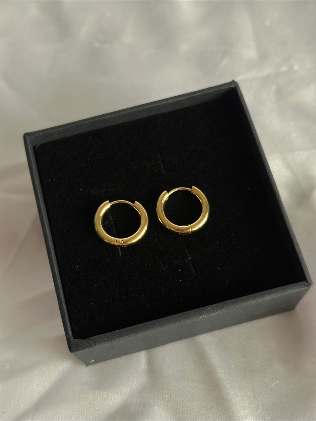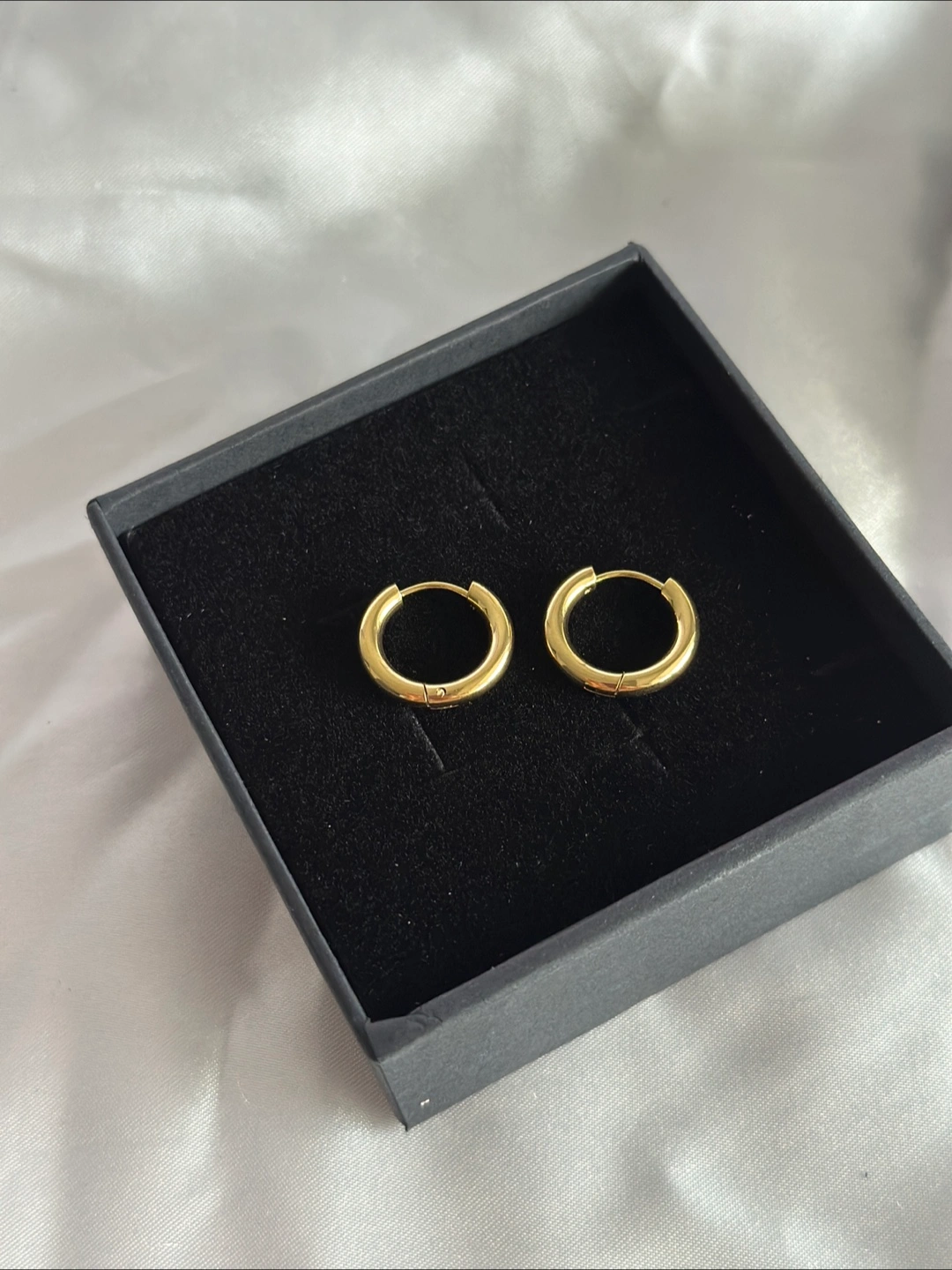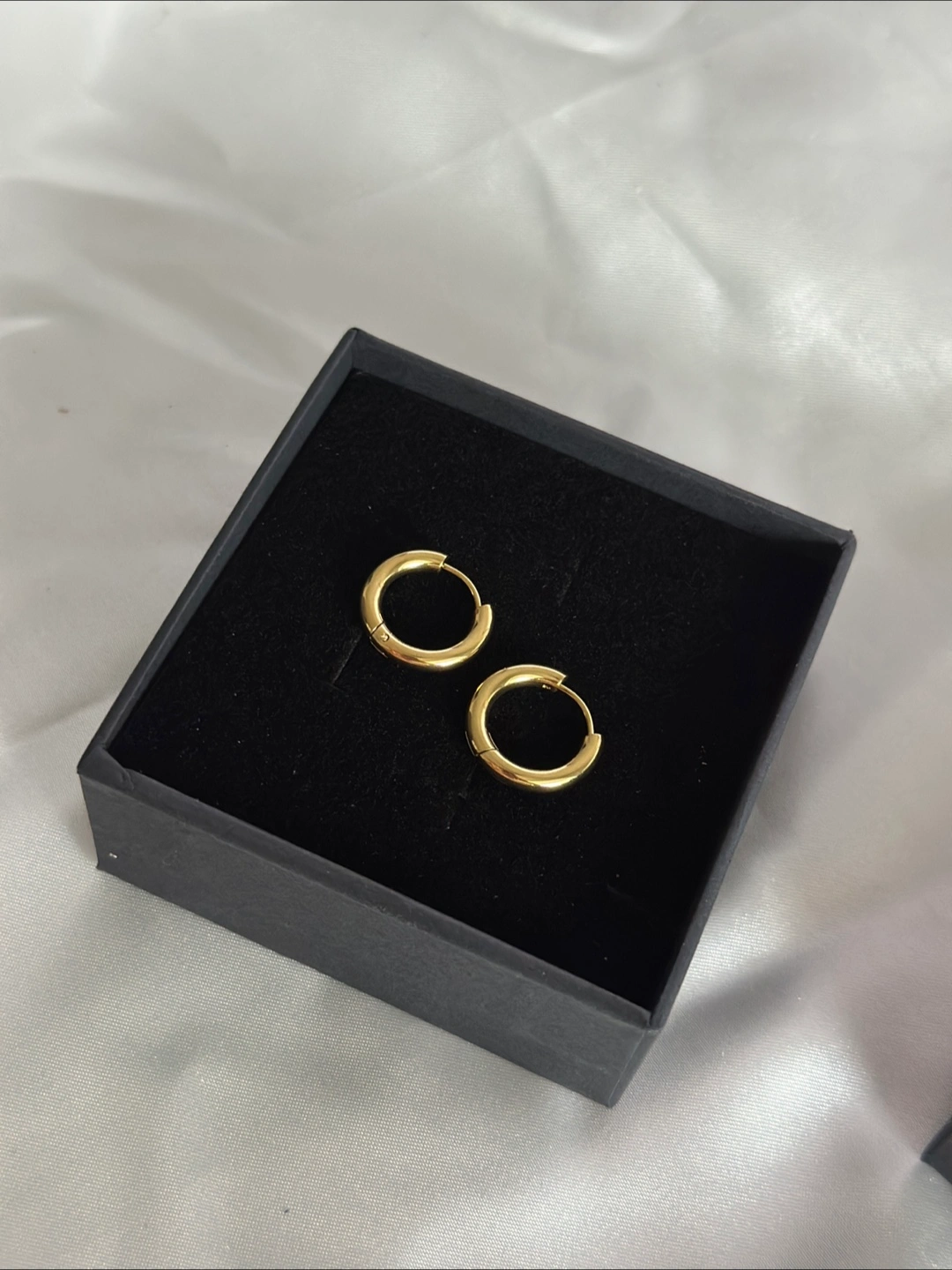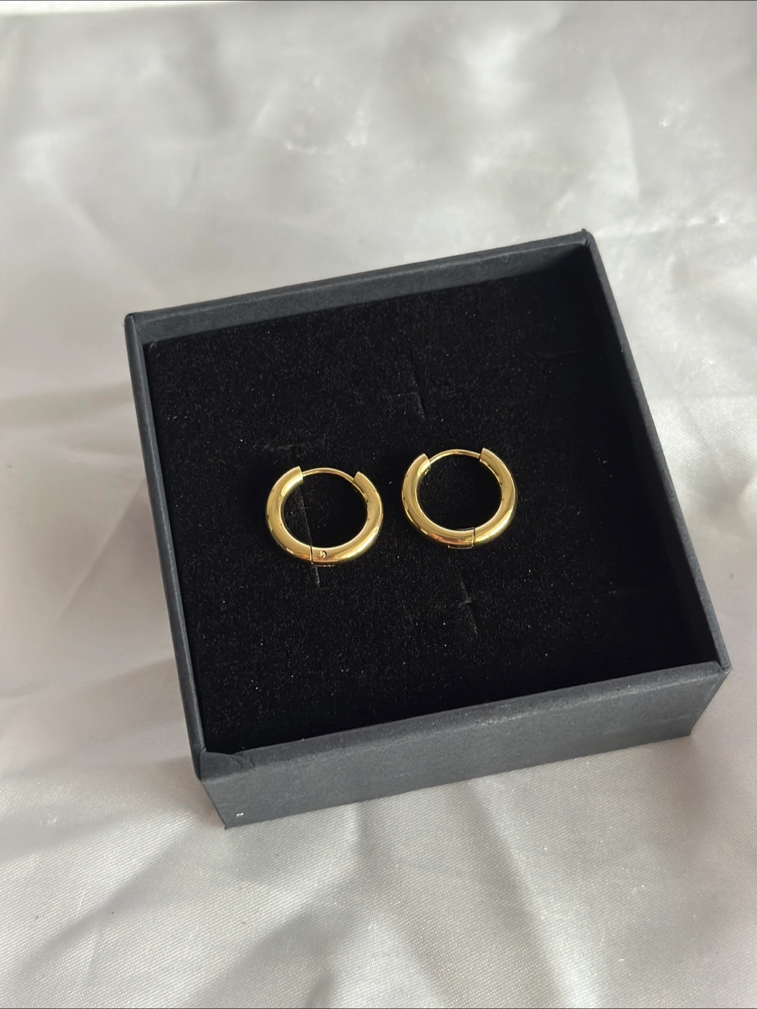 Selling a pair of gold hoop earrings that are brand new and come in their original box! They're a classic and versatile accessory that can be dressed up or down. Perfect for everyday wear or a special occasion