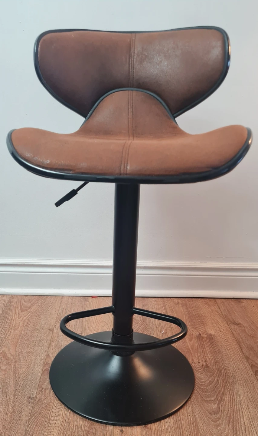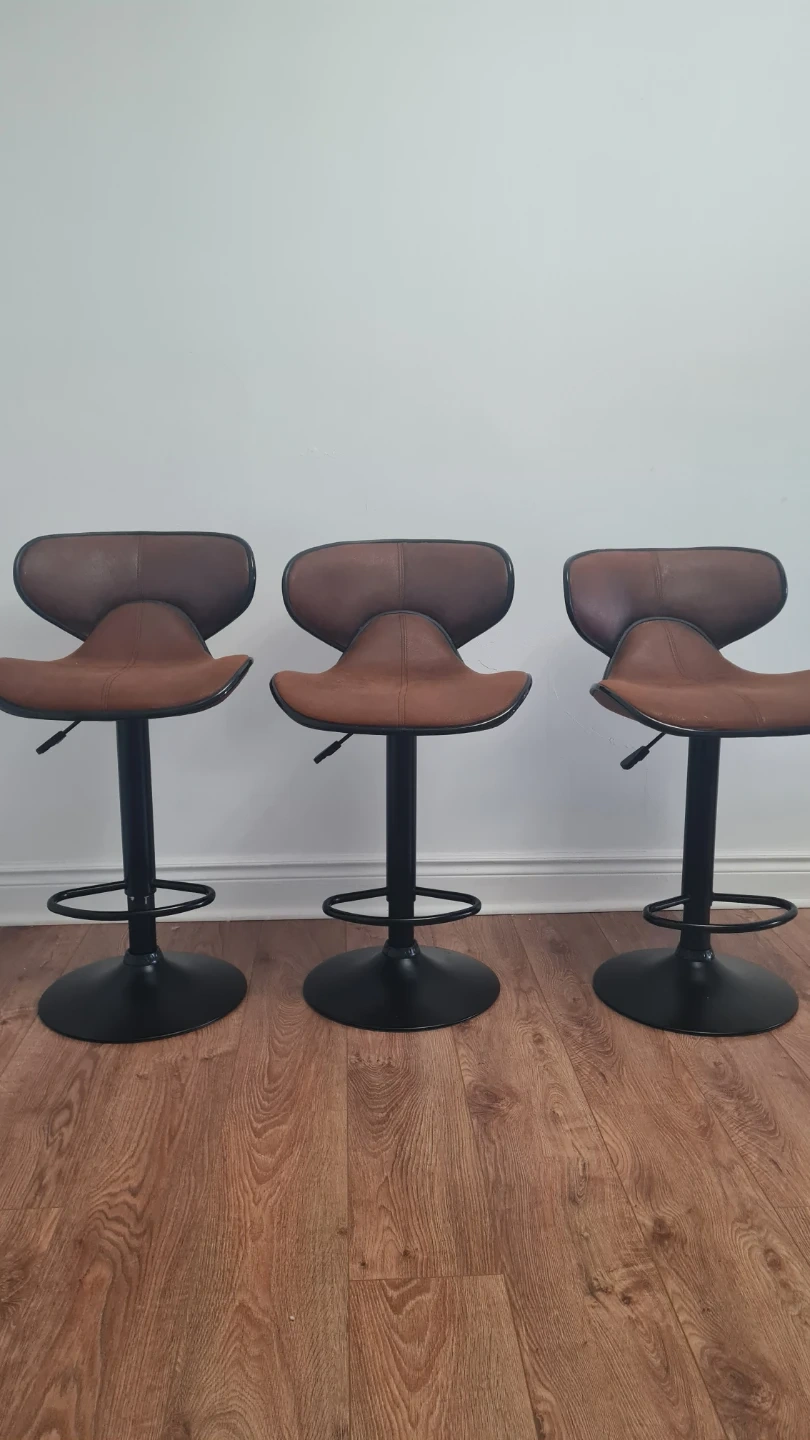 Selling 3 gently used bar stools in a stylish brown seat with a black base. Each stool has an adjustable height with an easy-to-use lever. They are comfortable, versatile, and can complement any space.