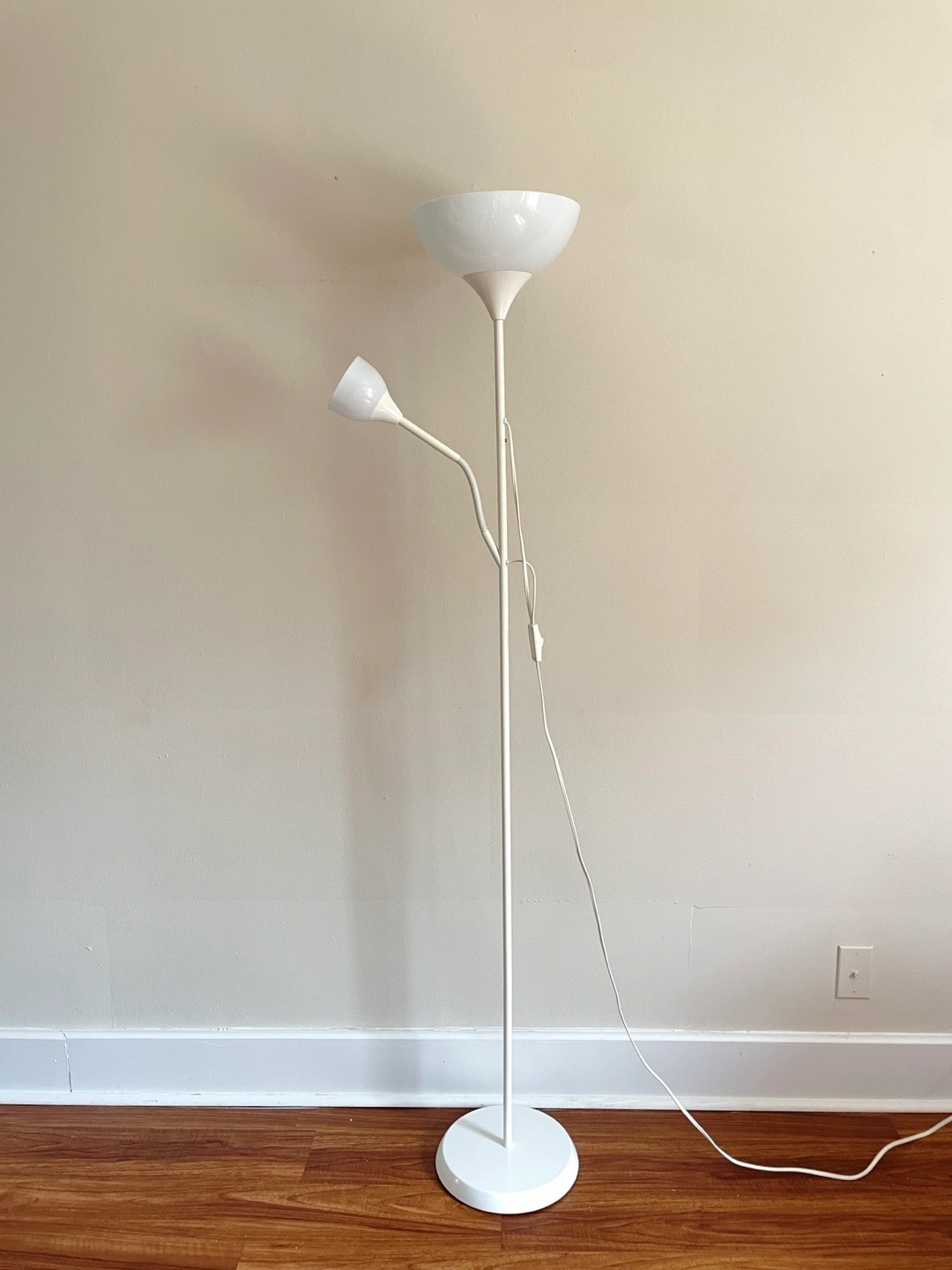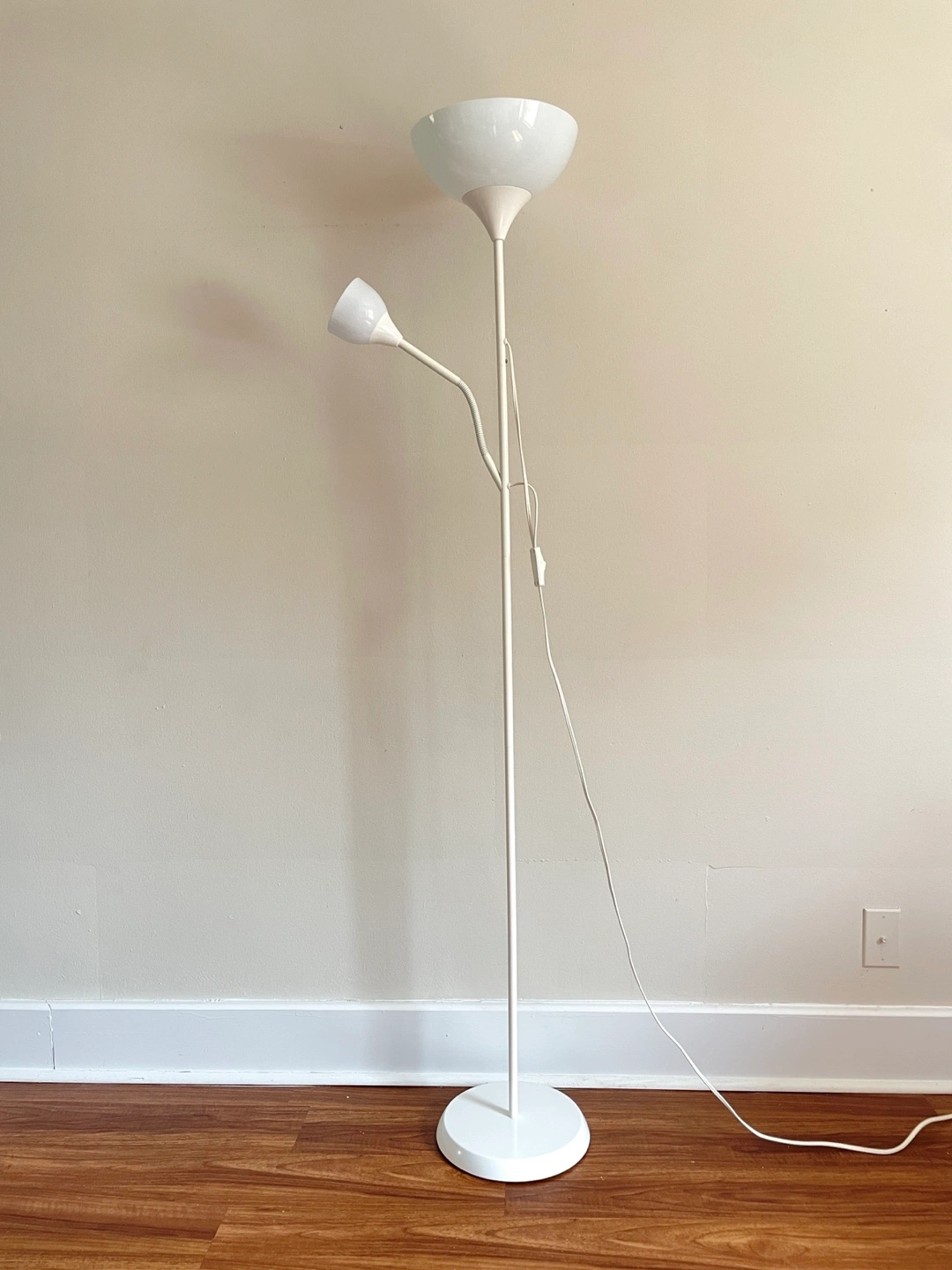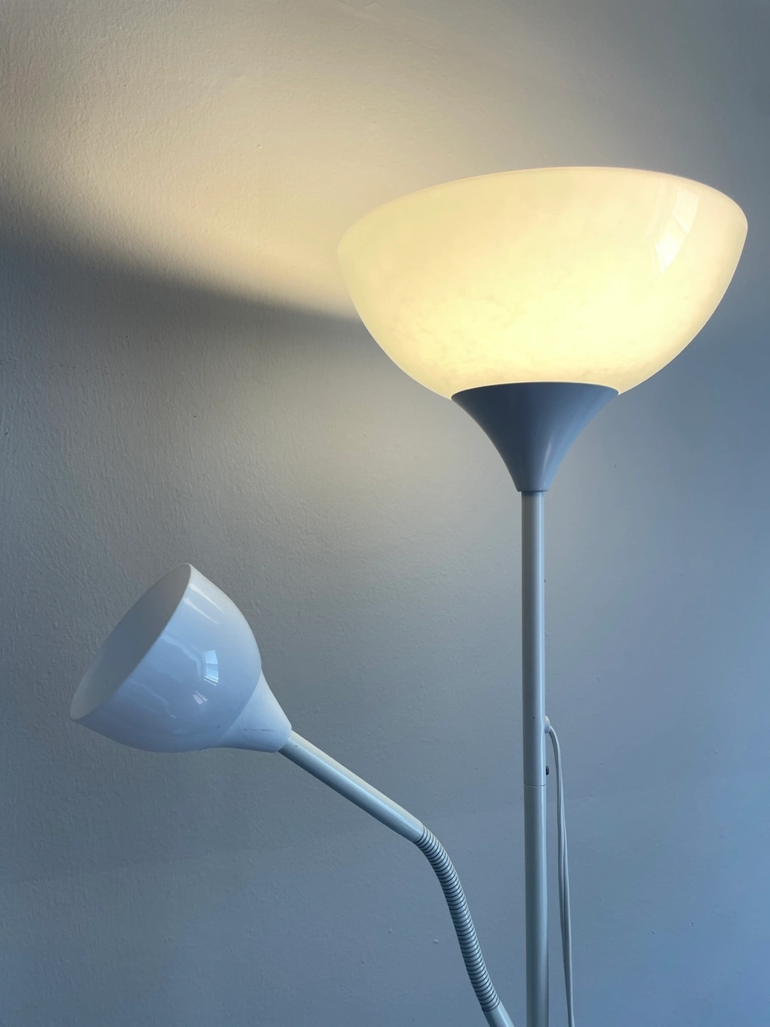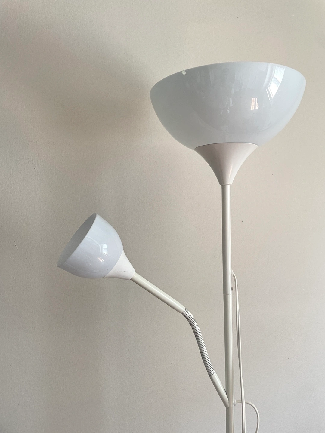 Selling a floor lamp with an adjustable reading light! It's perfect for adding some extra light to any room. The lamp is white and in good condition. It has a main light and a smaller, adjustable reading light on the side.
