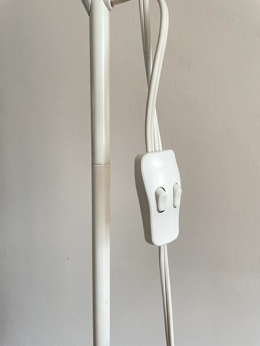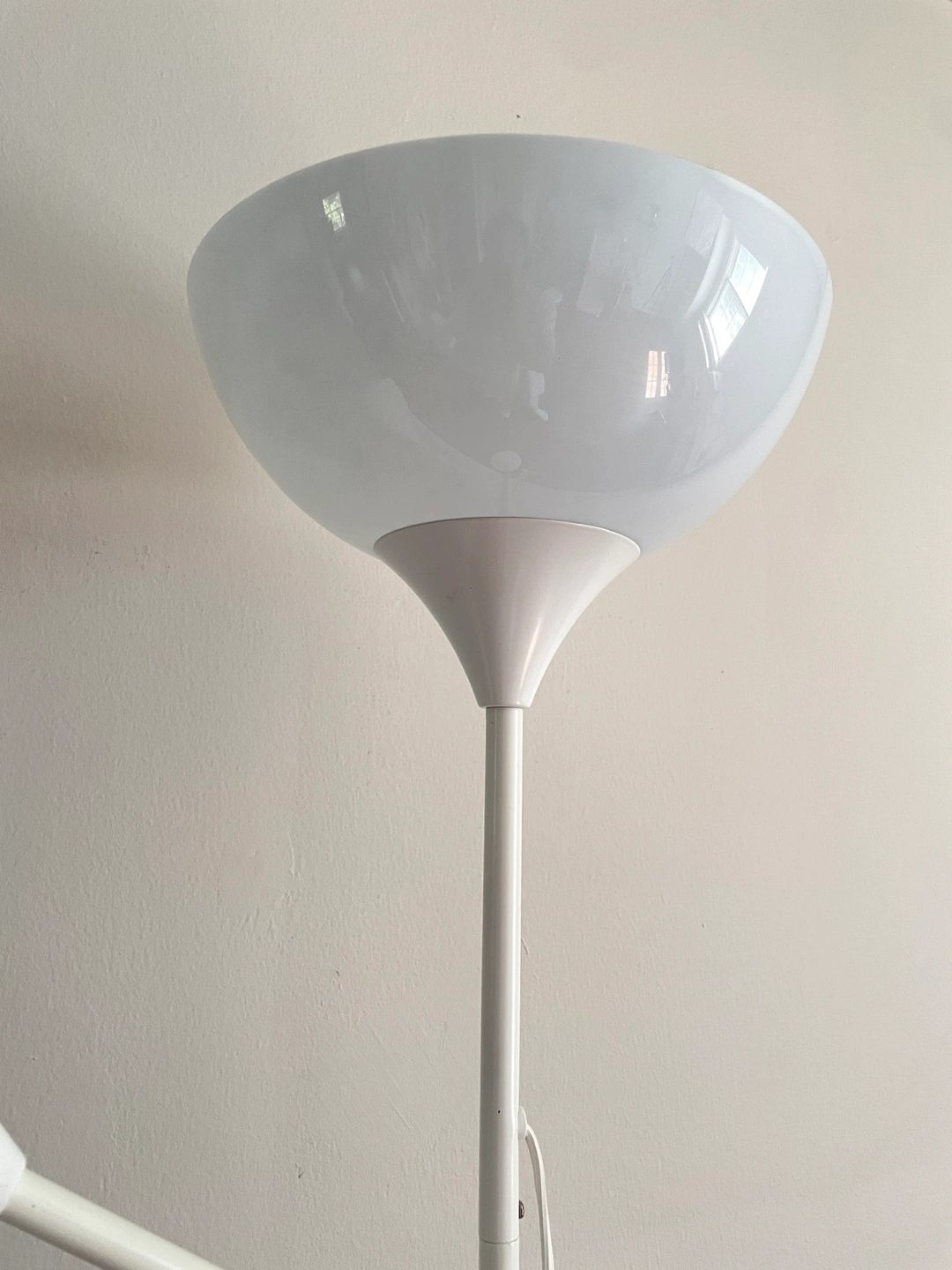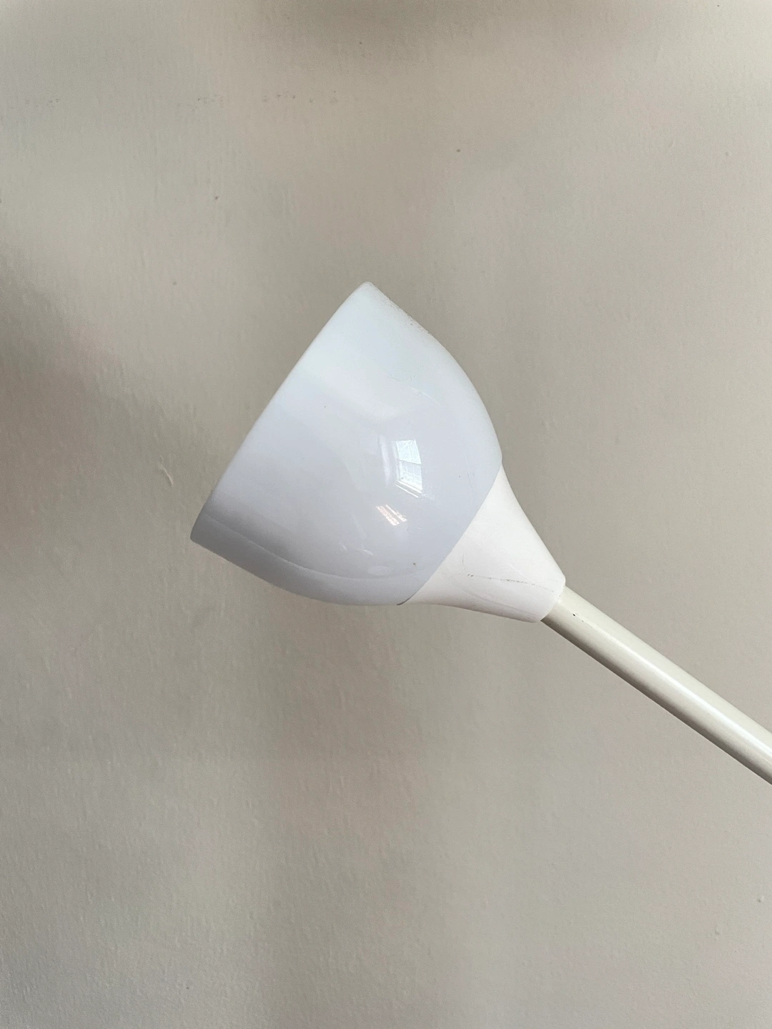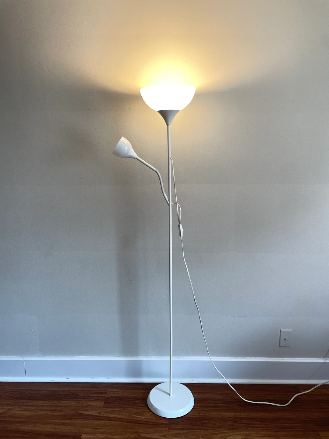 Selling a floor lamp with an adjustable reading light! It's perfect for adding some extra light to any room. The lamp is white and in good condition. It has a main light and a smaller, adjustable reading light on the side.