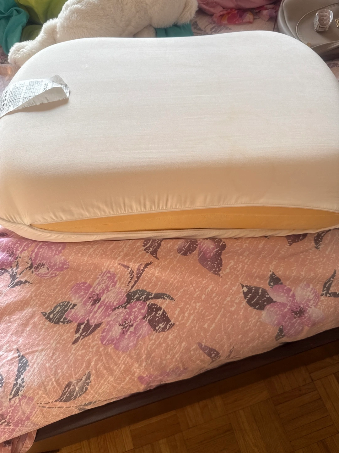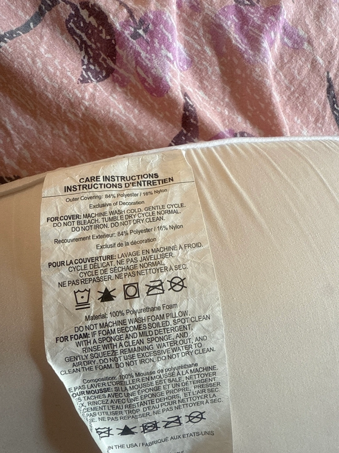 Here's a memory foamcomfy contour pillow! The outer covering is made of 84% polyester and 16% nylon. To keep it clean, machine wash cold on a gentle cycle and tumble dry on normal. Do not bleach, iron or dry clean! The foam is 100% polyurethane foam. Made in the USA