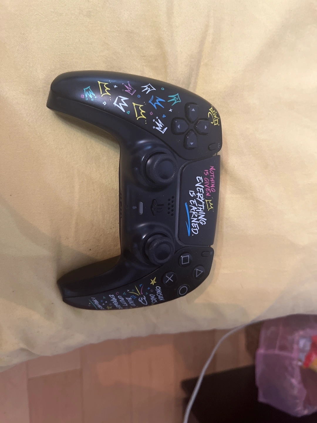 Selling a customized PlayStation 5 controller! It features unique artwork and inscriptions, including "NOTHING IS GIVEN. EVERYTHING IS EARNED." and "CHOSEN ONES, BUILD, UPLIFT, EMPOWER, PROMES". A cool controller for any gamer!