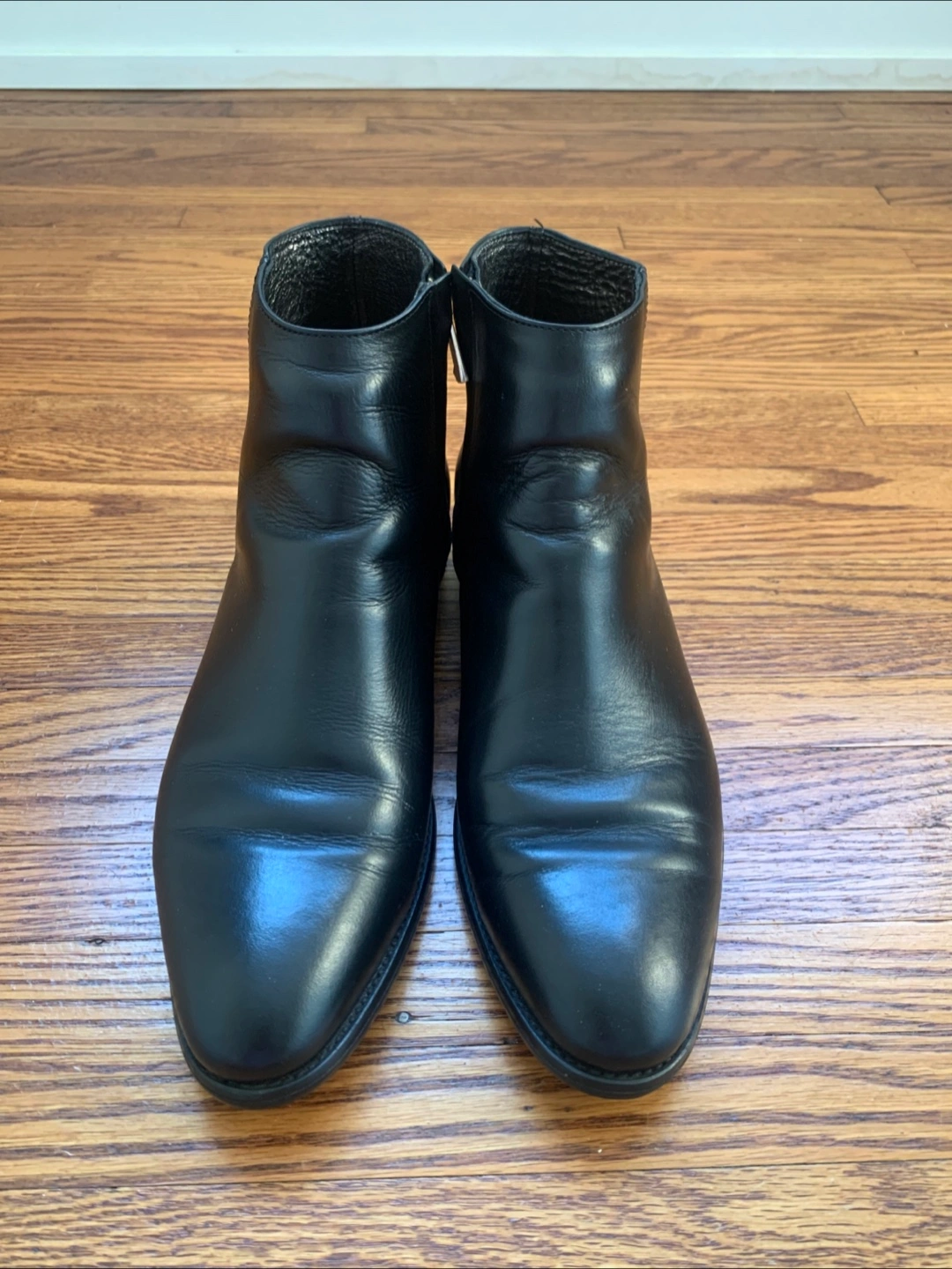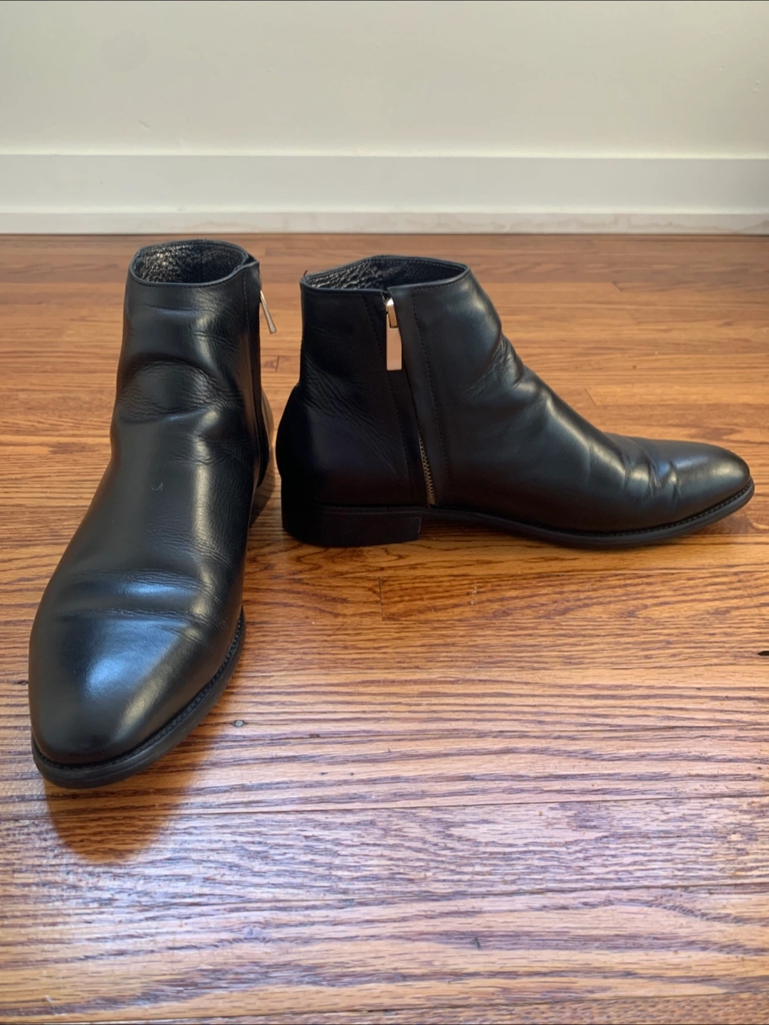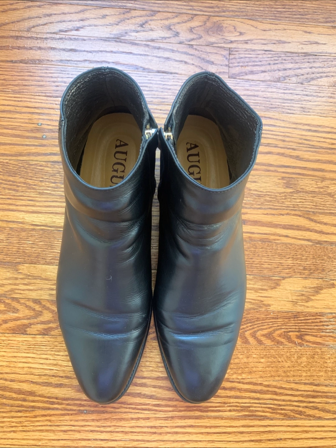Selling a pair of black leather ankle boots from August. They are in great condition and perfect for everyday wear. The boots feature a sleek design with a side zipper. They're a stylish addition to any wardrobe!