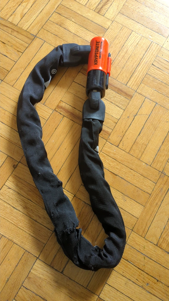 Selling a Kryptonite Evolution chain lock for bikes. It's in good condition and ready to keep your bike safe and sound. There are signs of wear on the fabric sleeve, as shown in the pictures, but the lock itself works perfectly