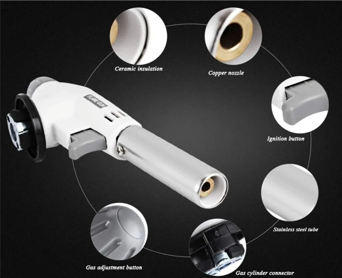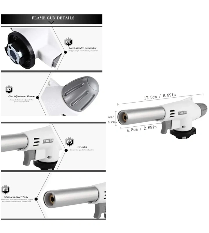 It uses a butane cartridge with a notched collar. The item is a unit type and the package includes one butane torch gun. The model is adjustable flame gun butane blow torch with ignition and it is manufactured in China. This product is suitable for those who need a reliable and efficient heat source for their projects.