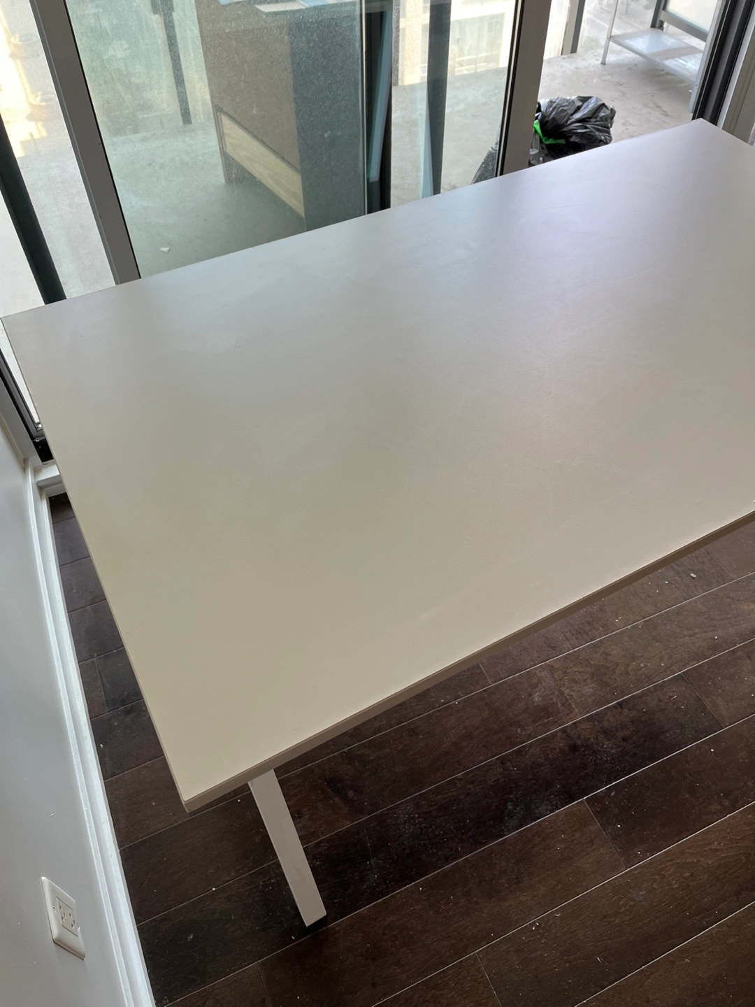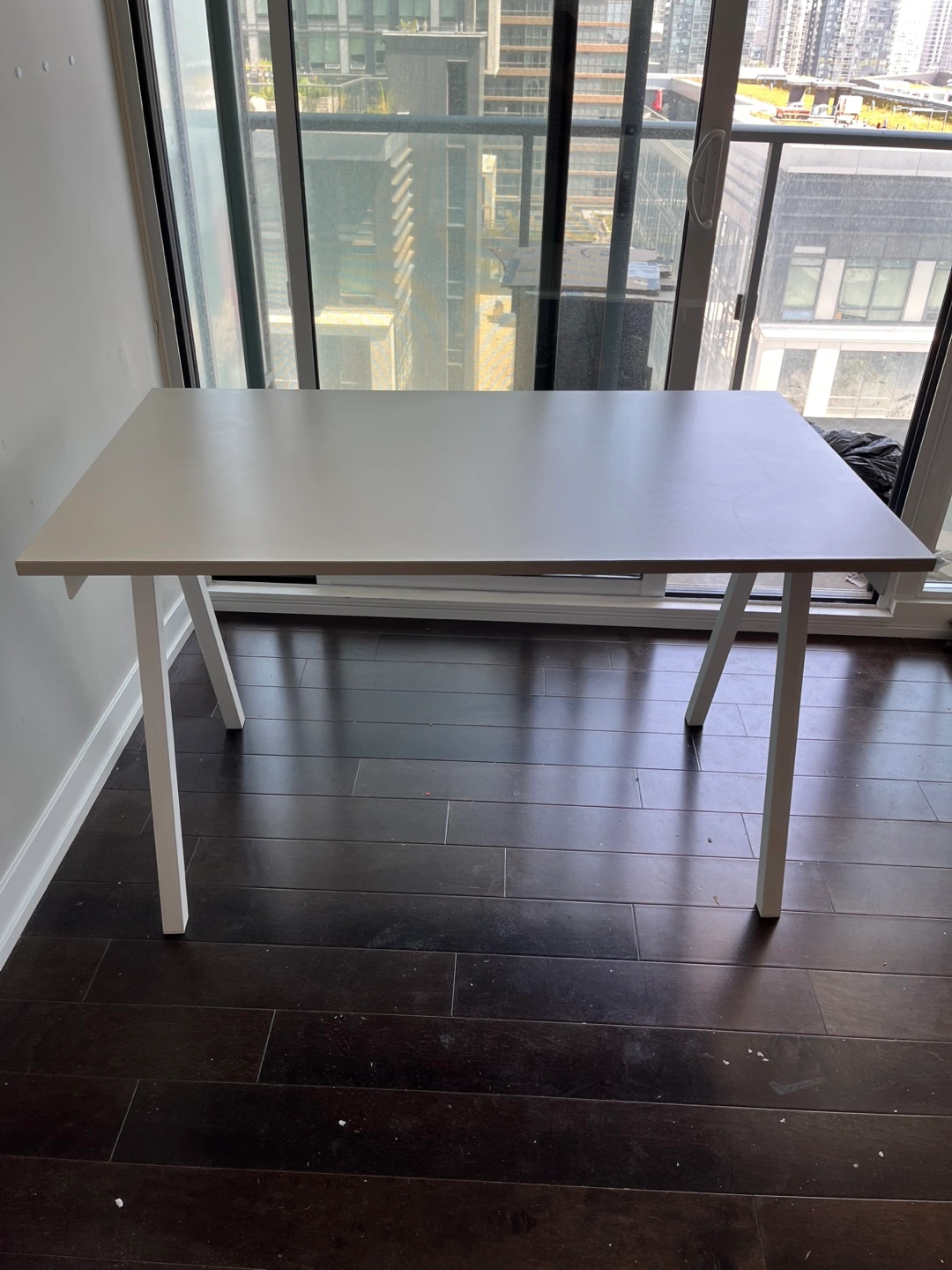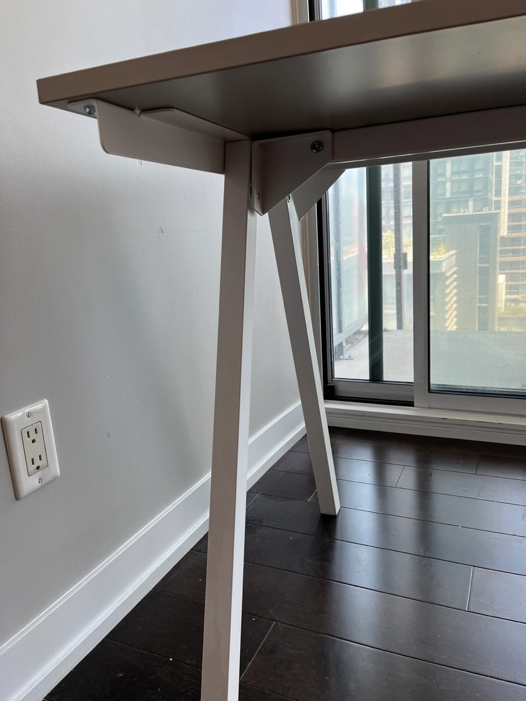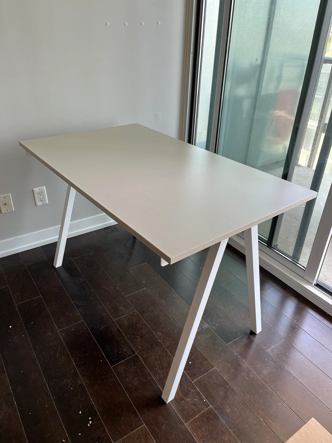 Selling a simple and clean white desk. It features a minimalist design with A-frame legs. Perfect for a home office or study space!