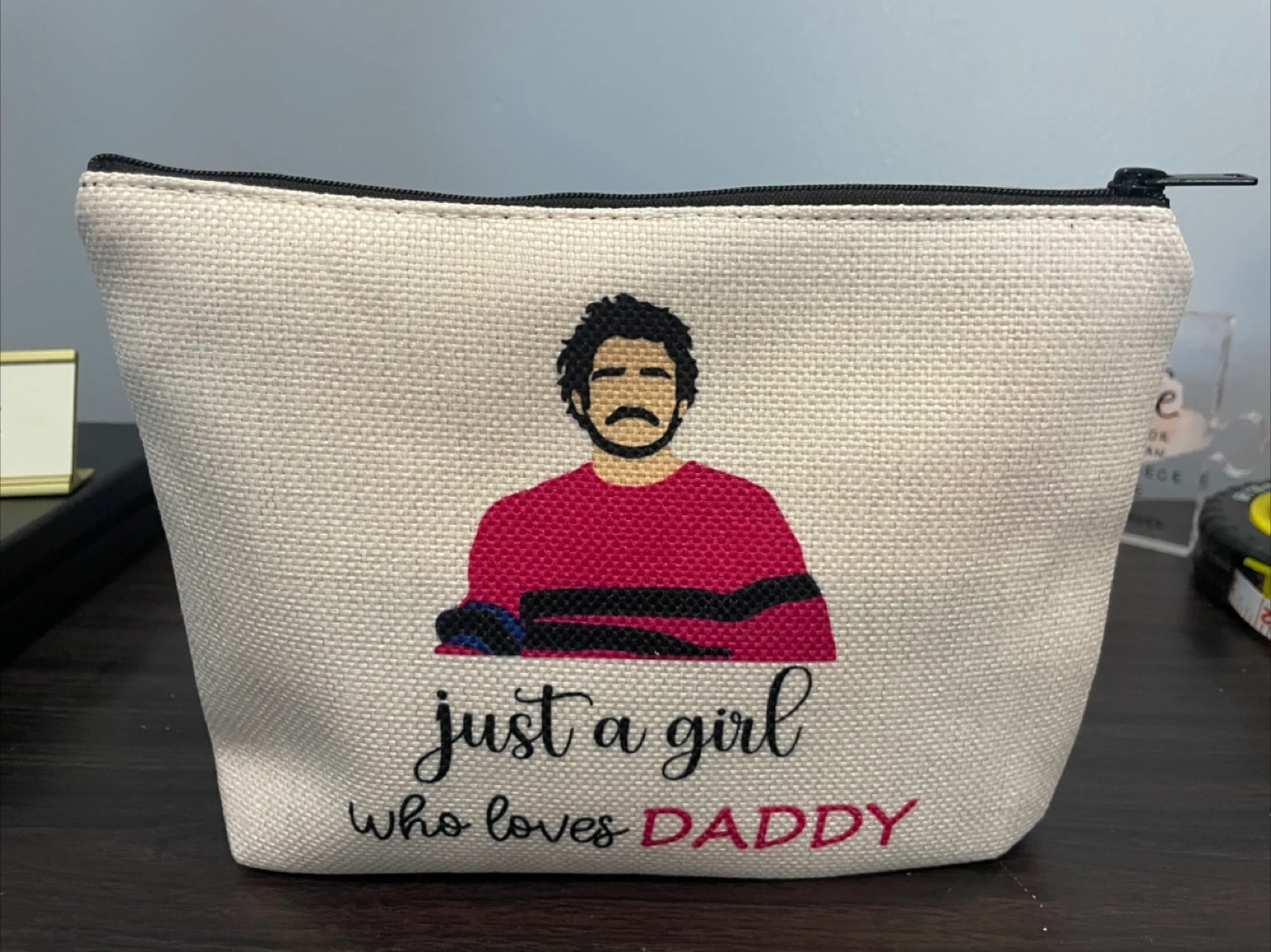 A cute cosmetic bag that says "Just a girl who loves DADDY"! Perfect for storing your makeup or other small items. It's in great condition and ready for a new home