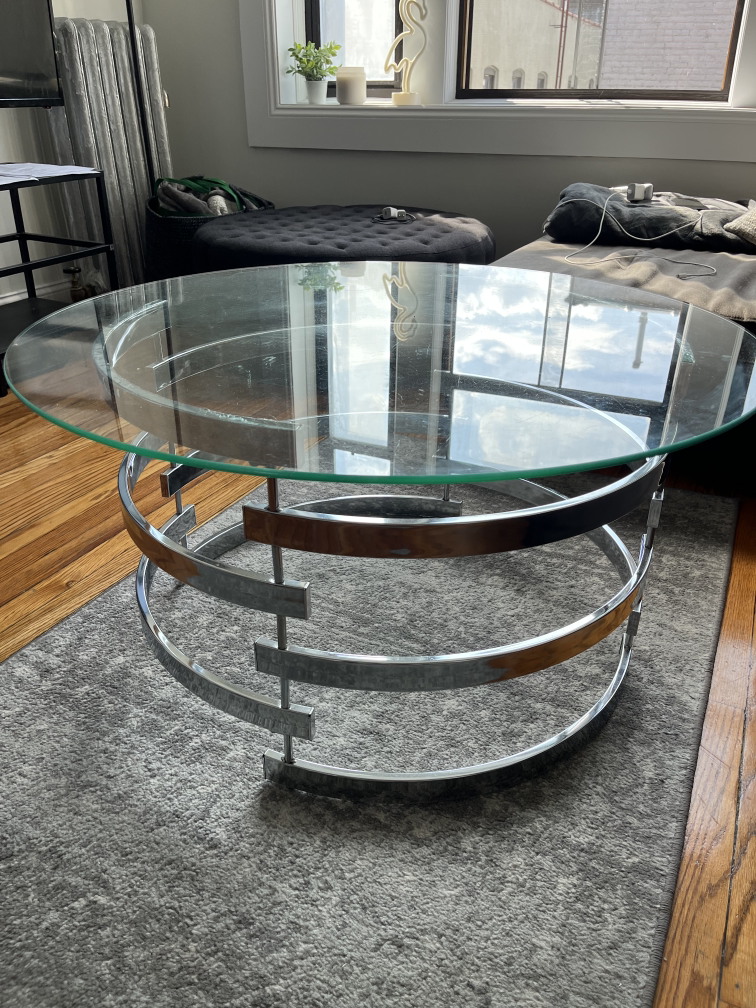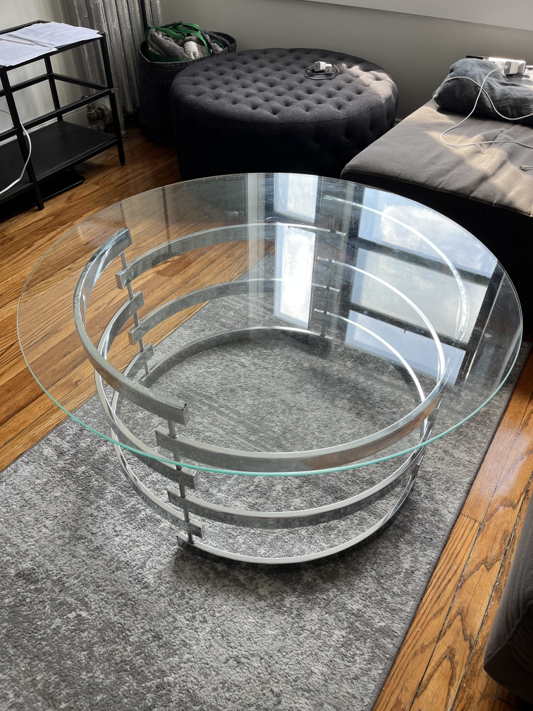 Selling a round glass coffee table. It features a unique, tiered metal frame that provides a modern and stylish look. The glass top is in great condition and the frame is sturdy. It's a great piece to add to any living room!