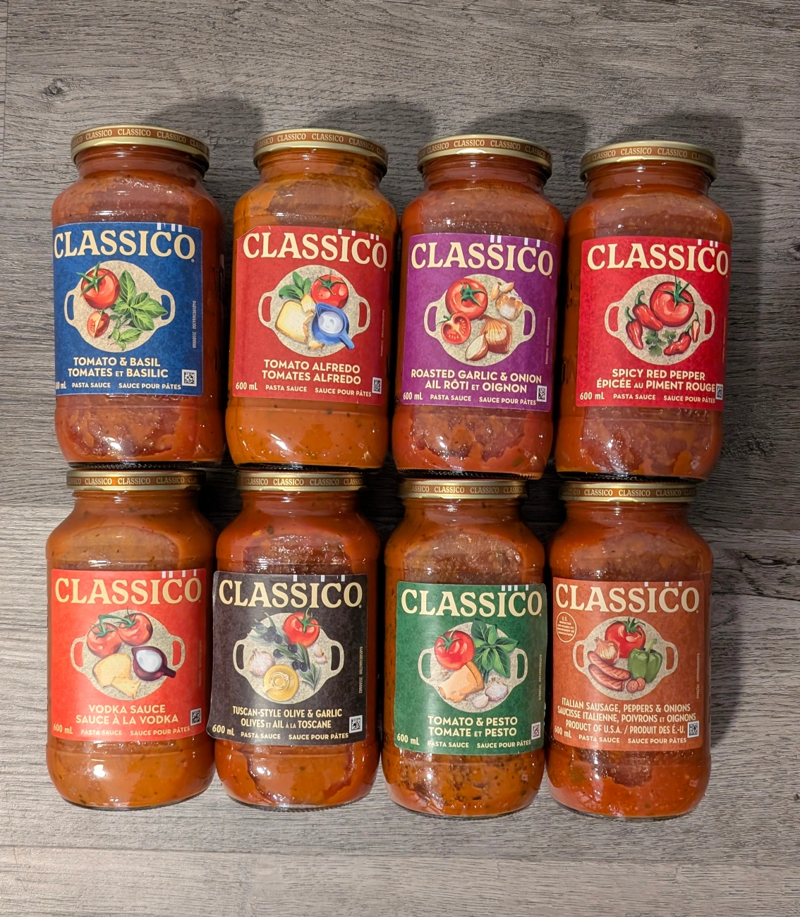 Selling a variety pack of Classico pasta sauces! Includes Tomato & Basil, Tomato Alfredo, Roasted Garlic & Onion, Spicy Red Pepper, Vodka Sauce, Tuscan-Style Olive & Garlic, Tomato & Pesto, and Italian Sausage, Peppers & Onions. Each jar contains 600ml of delicious sauce, perfect for your next pasta night! Grab the whole set to try different flavours!