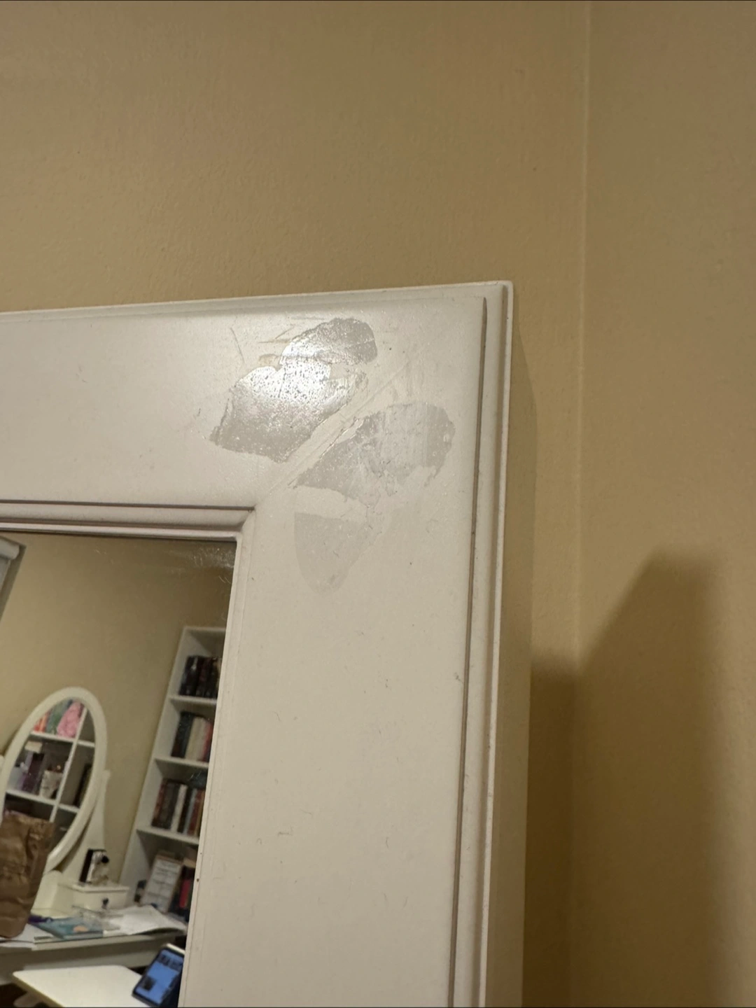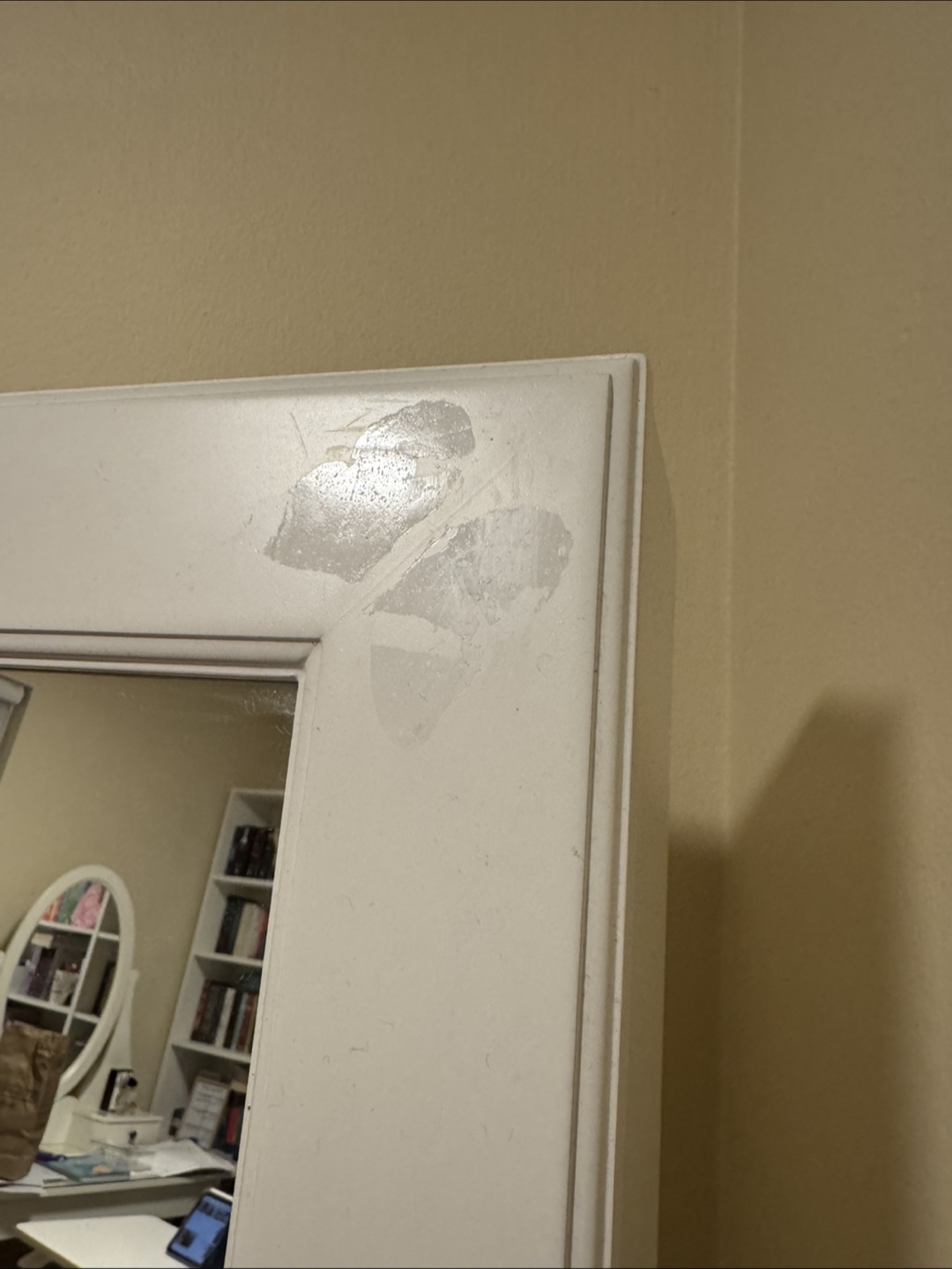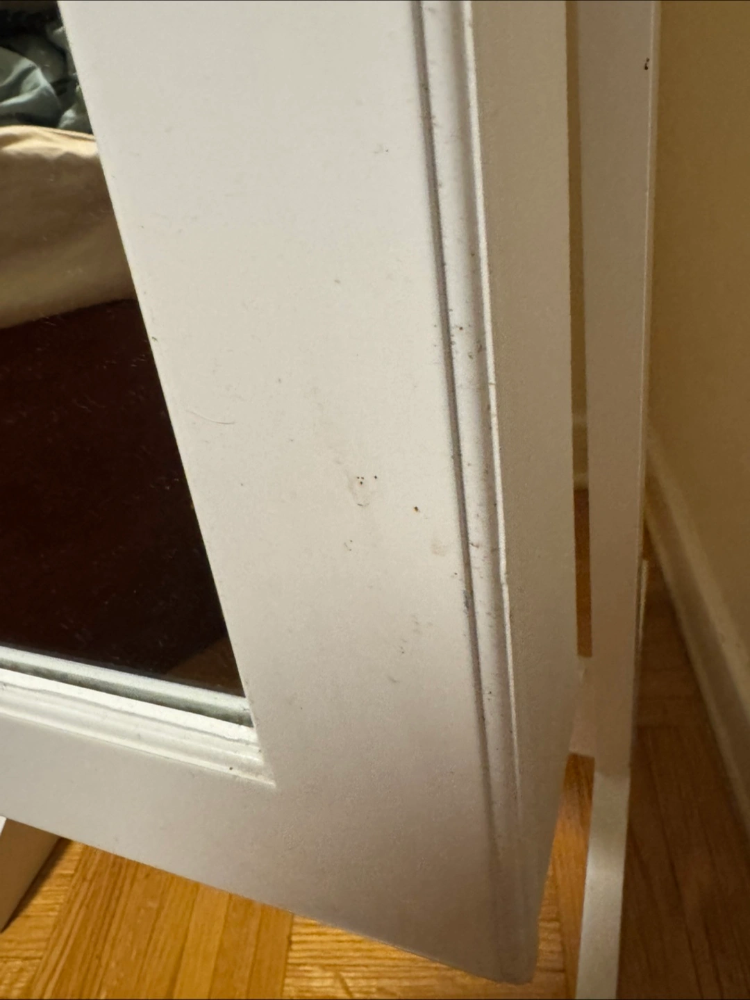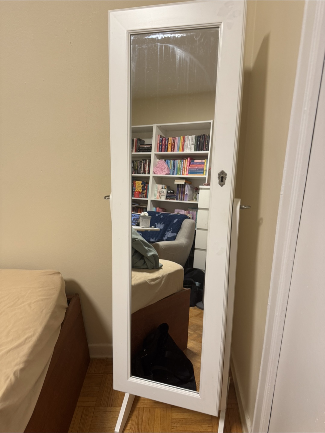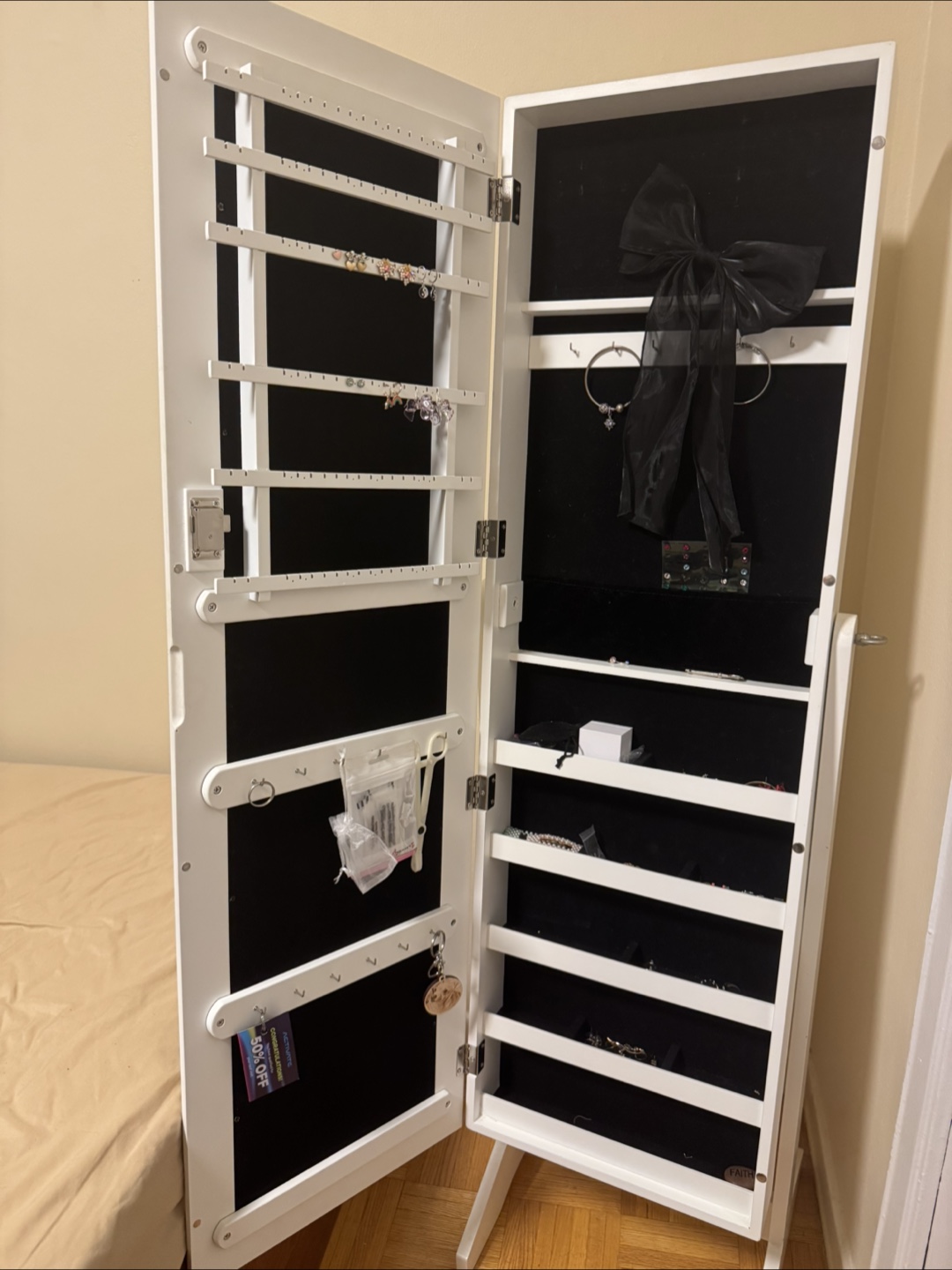 Selling a standing jewellery mirror stand. It's white and has a mirror on the front. Inside, there's a black lining with hooks and shelves for organizing your jewellery. There are some signs of use, sticker residue and some uses here and there but overall good condition!